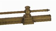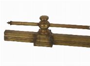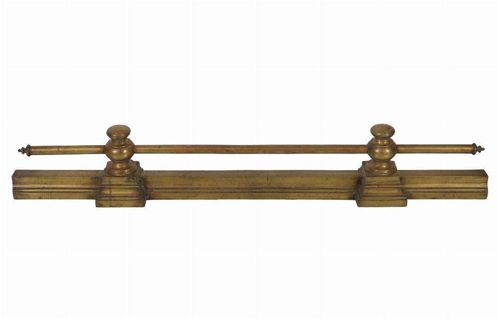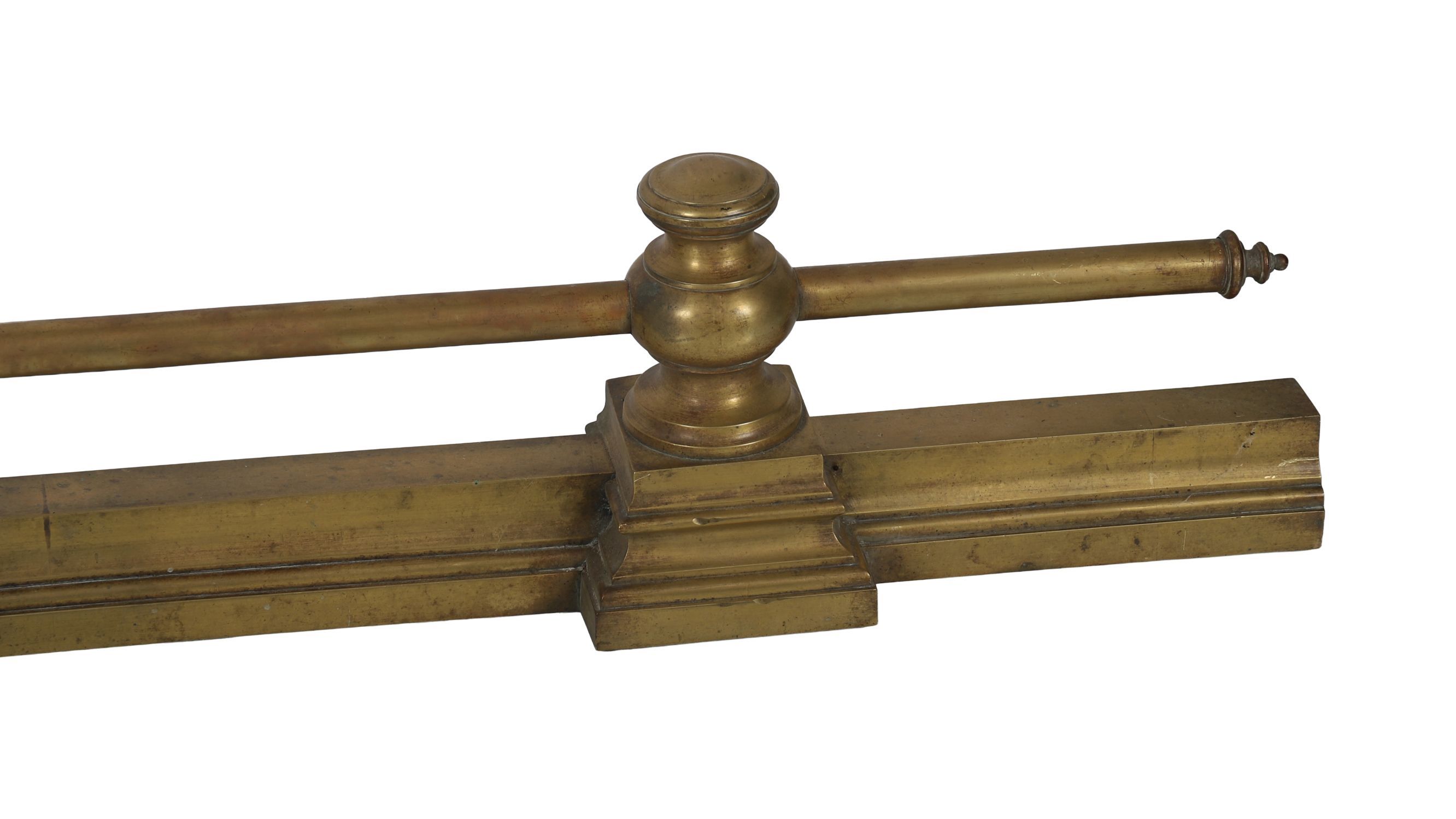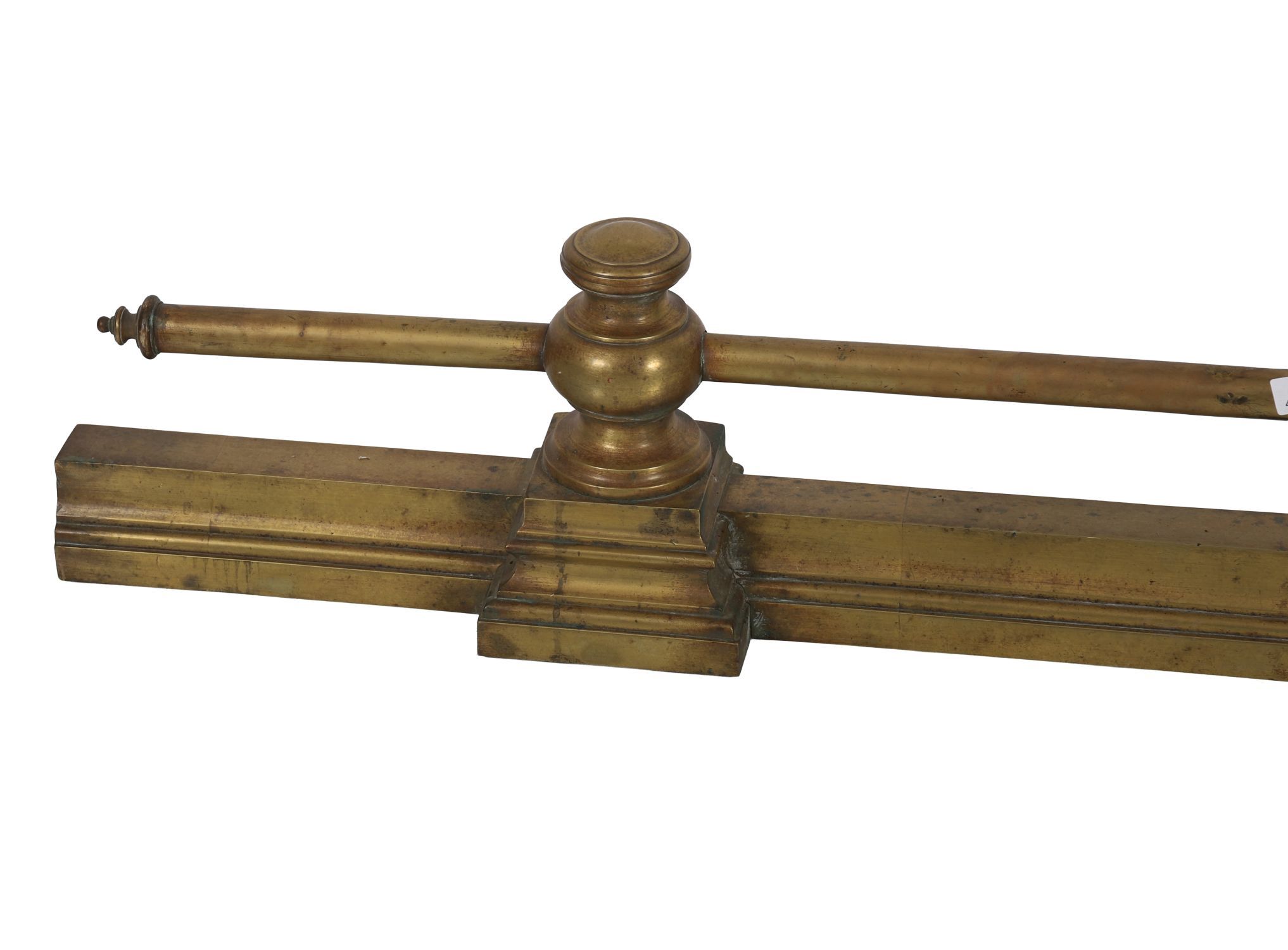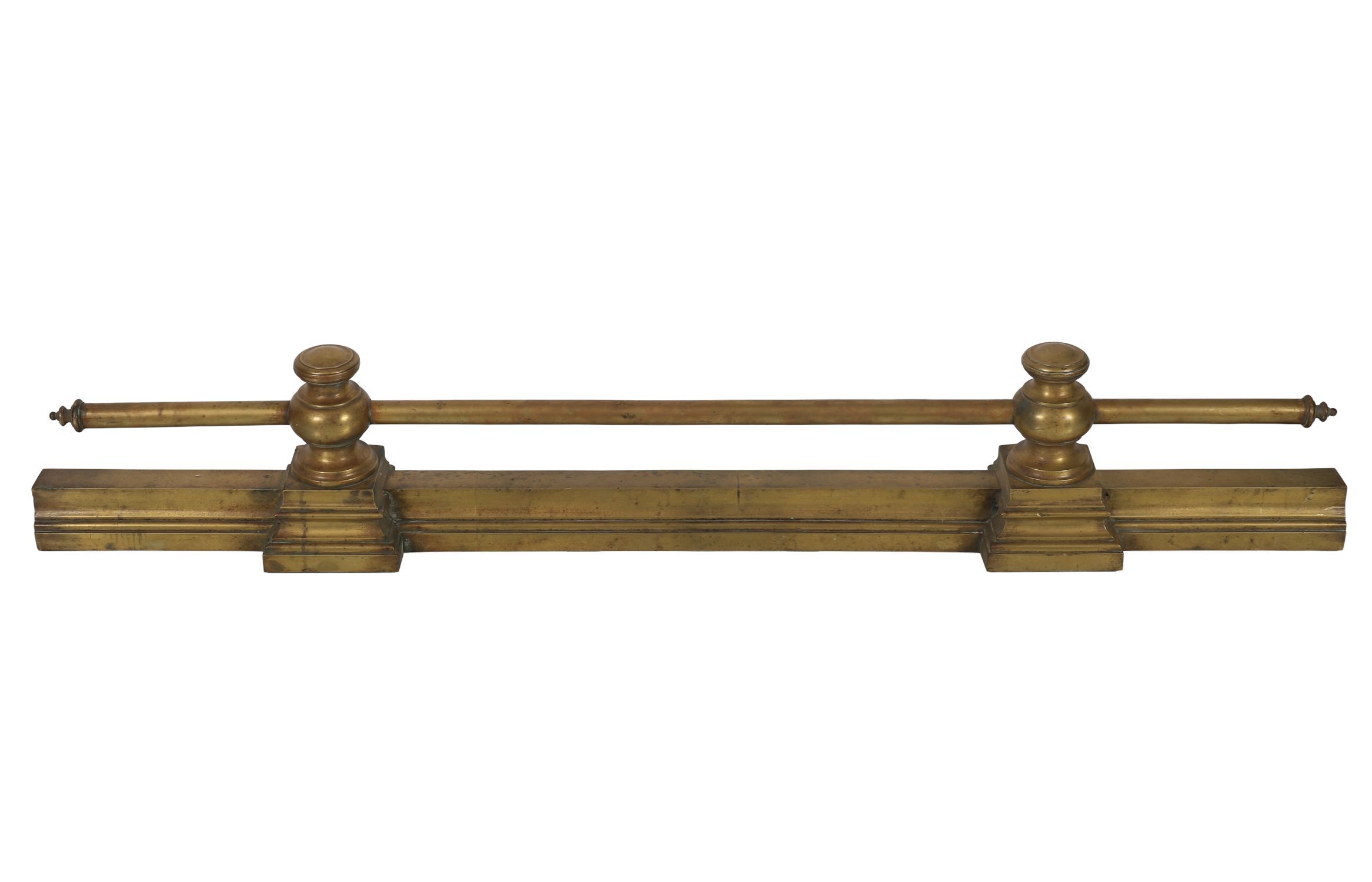 A 19th-century polished brass fireplace fender, of rectangular form with moulded base and turned finial uprights joined by a plain bar. The fender exhibits a warm patina consistent with age and use, making it a fine decorative and practical accessory for a period hearth. With adjustable ends.