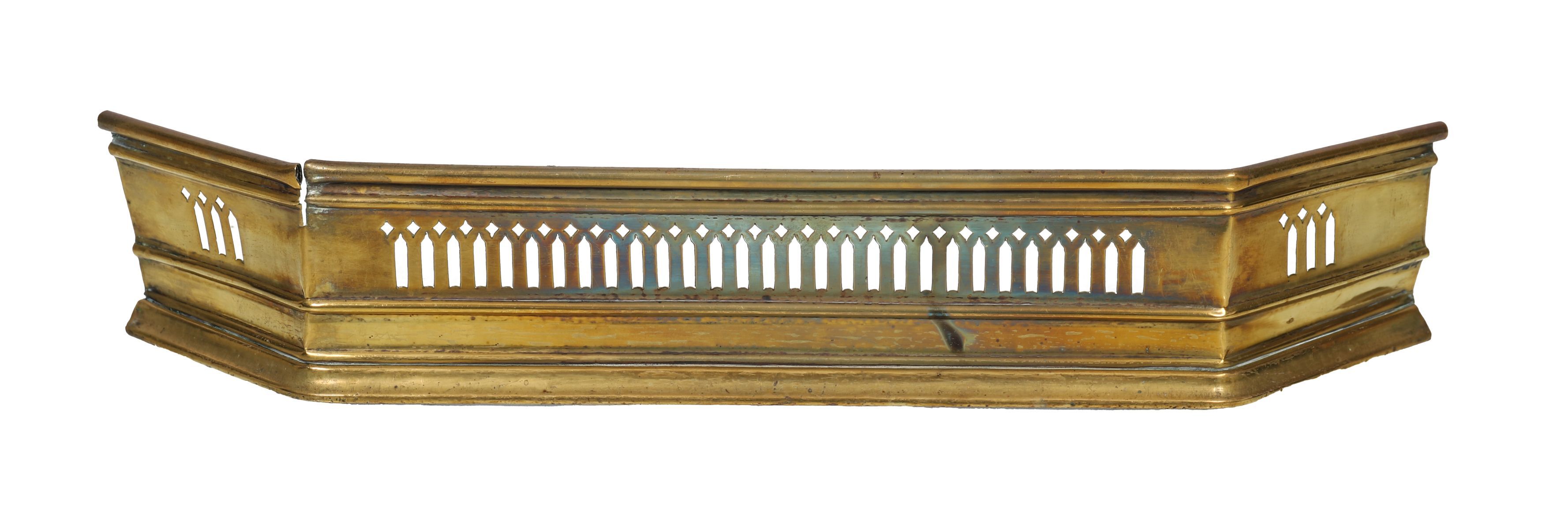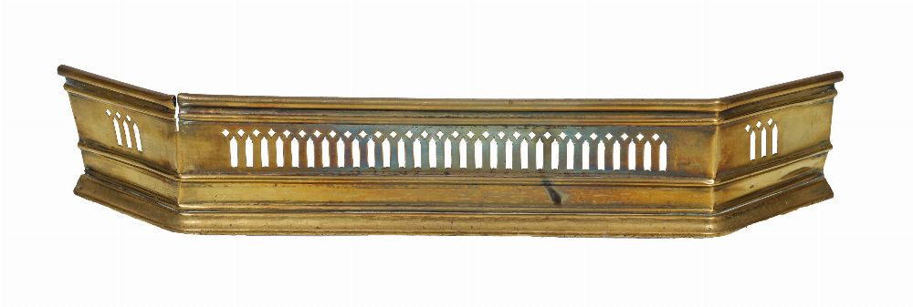 A polished brass fire fender of serpentine outline with pierced Gothic-style gallery and moulded borders.