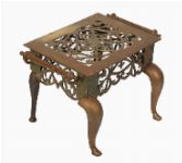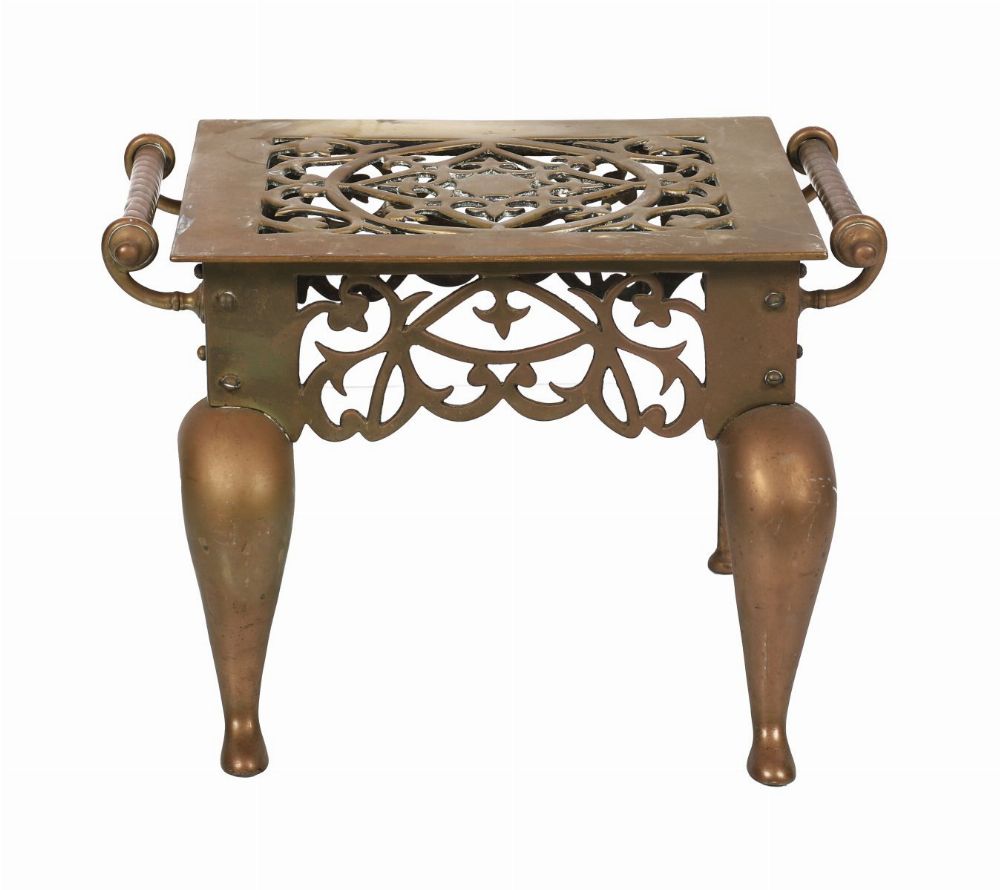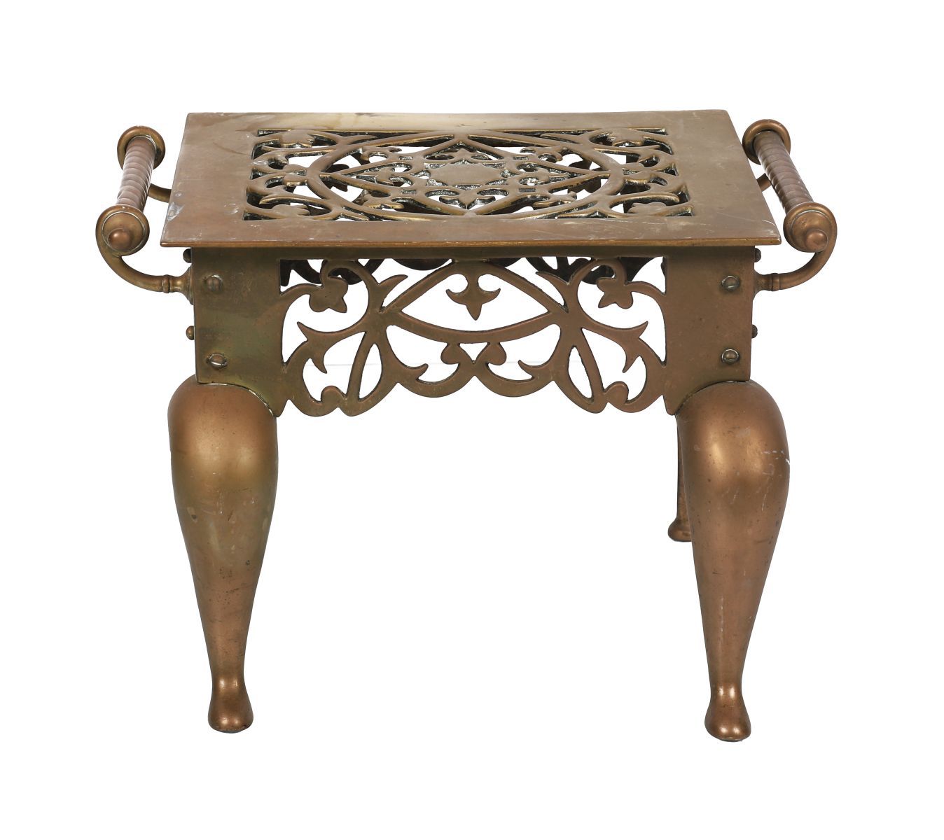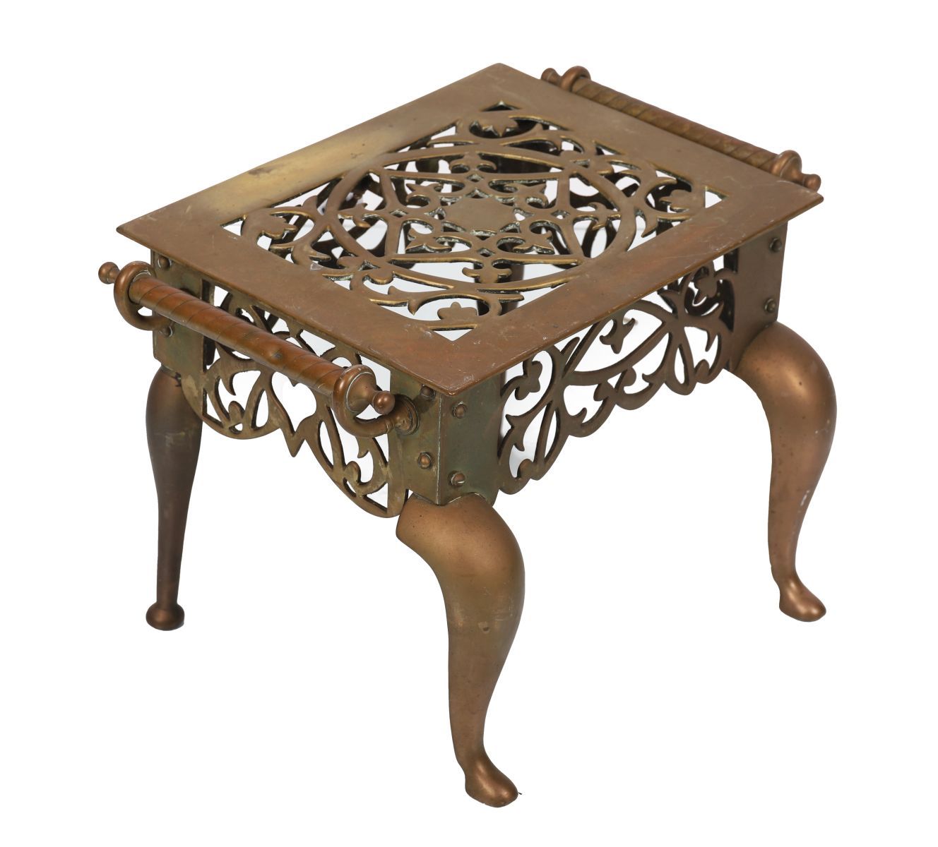 A fine brass footman or hearth trivet, with rectangular pierced top featuring a scrolling geometric design and twin turned side handles. Raised on cabriole legs terminating in pad feet.