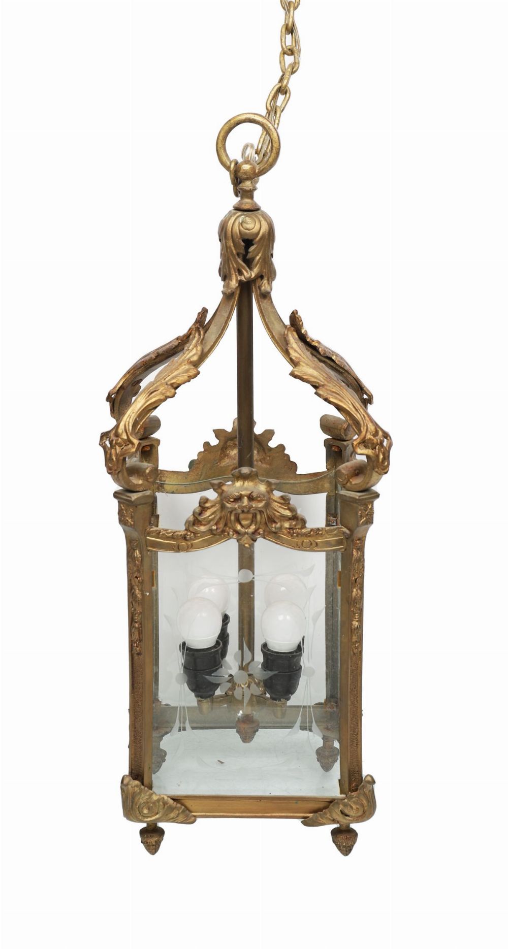 A 19th-century brass hall lantern of square tapering form, the frame applied with cast foliate and mask decoration to the corners and shoulders, surmounted by a suspension loop and canopy, the sides inset with engraved glass panels, fitted for interior
