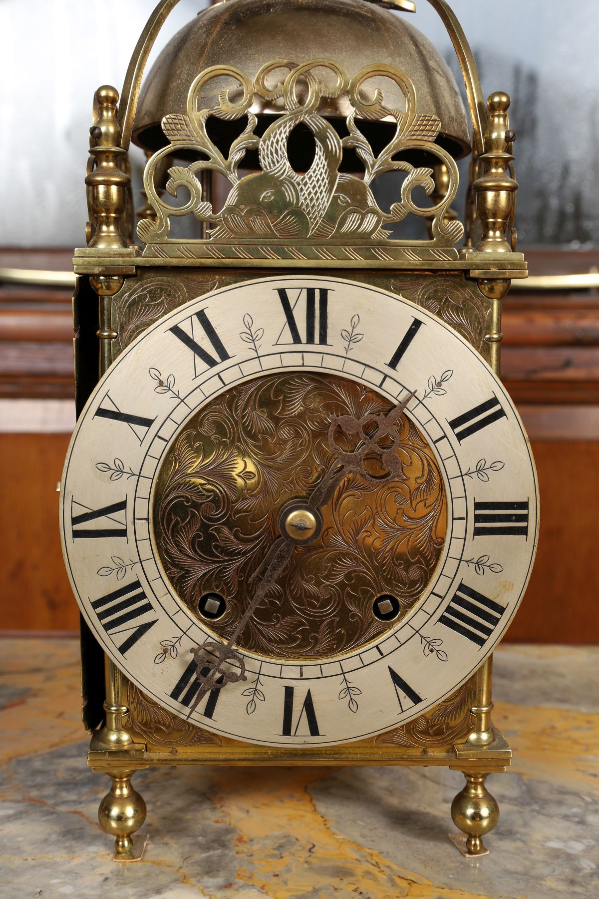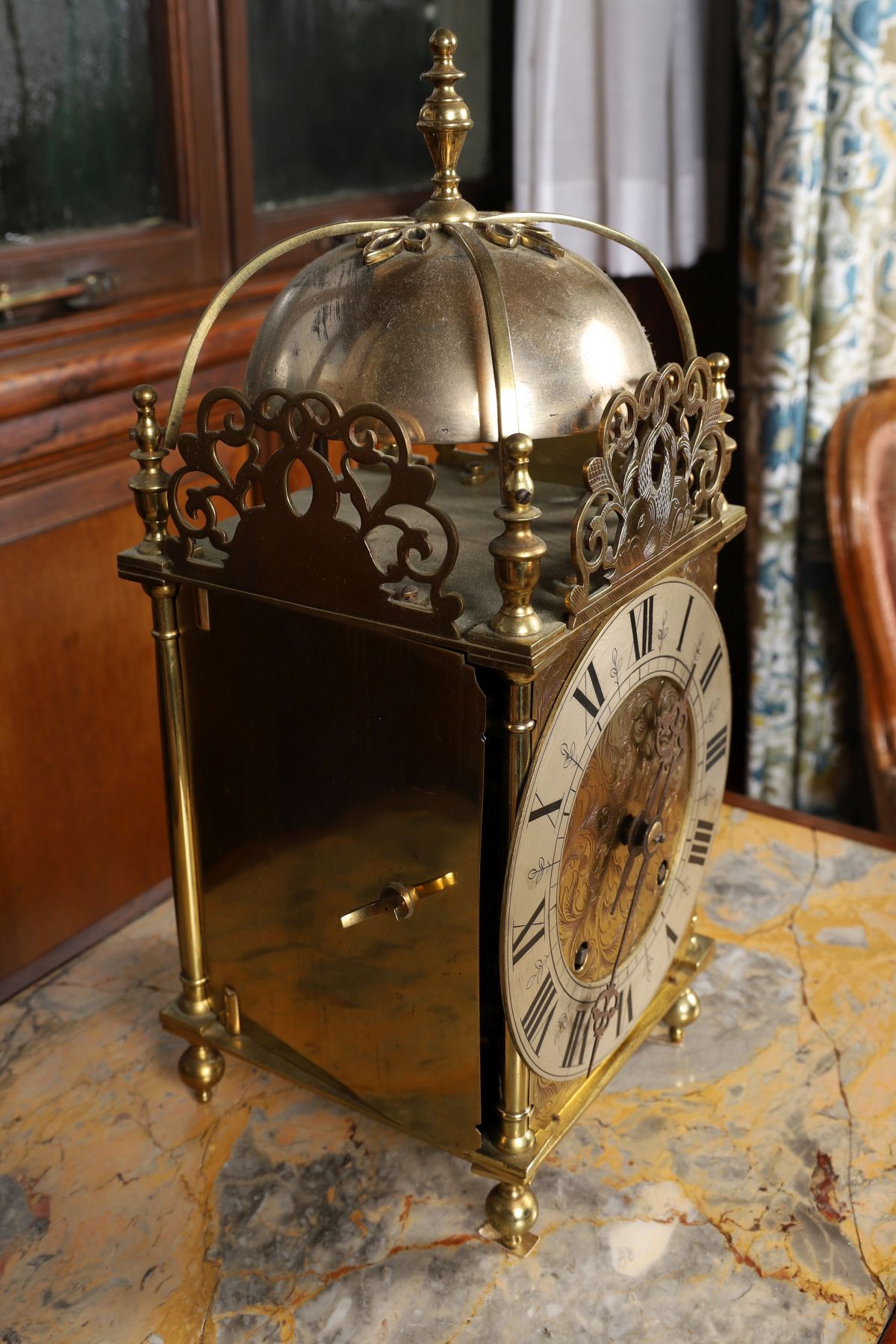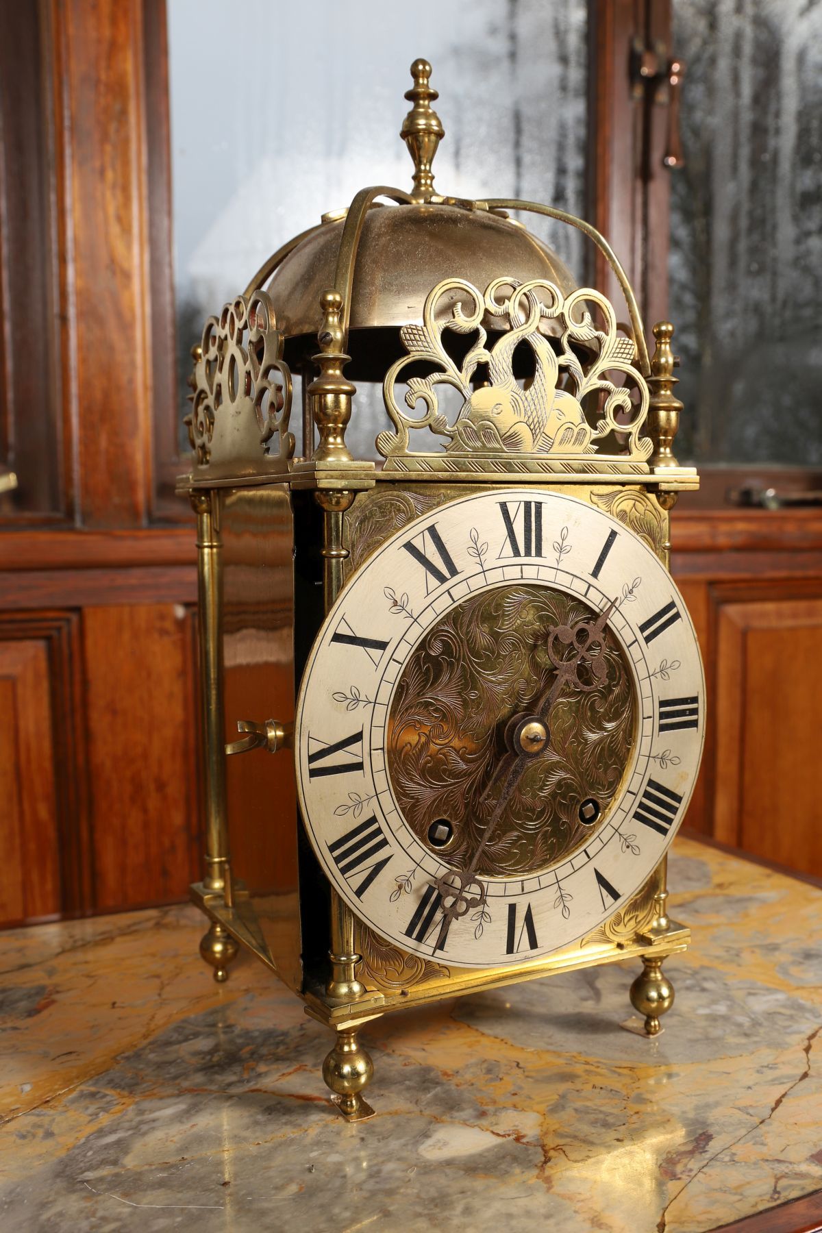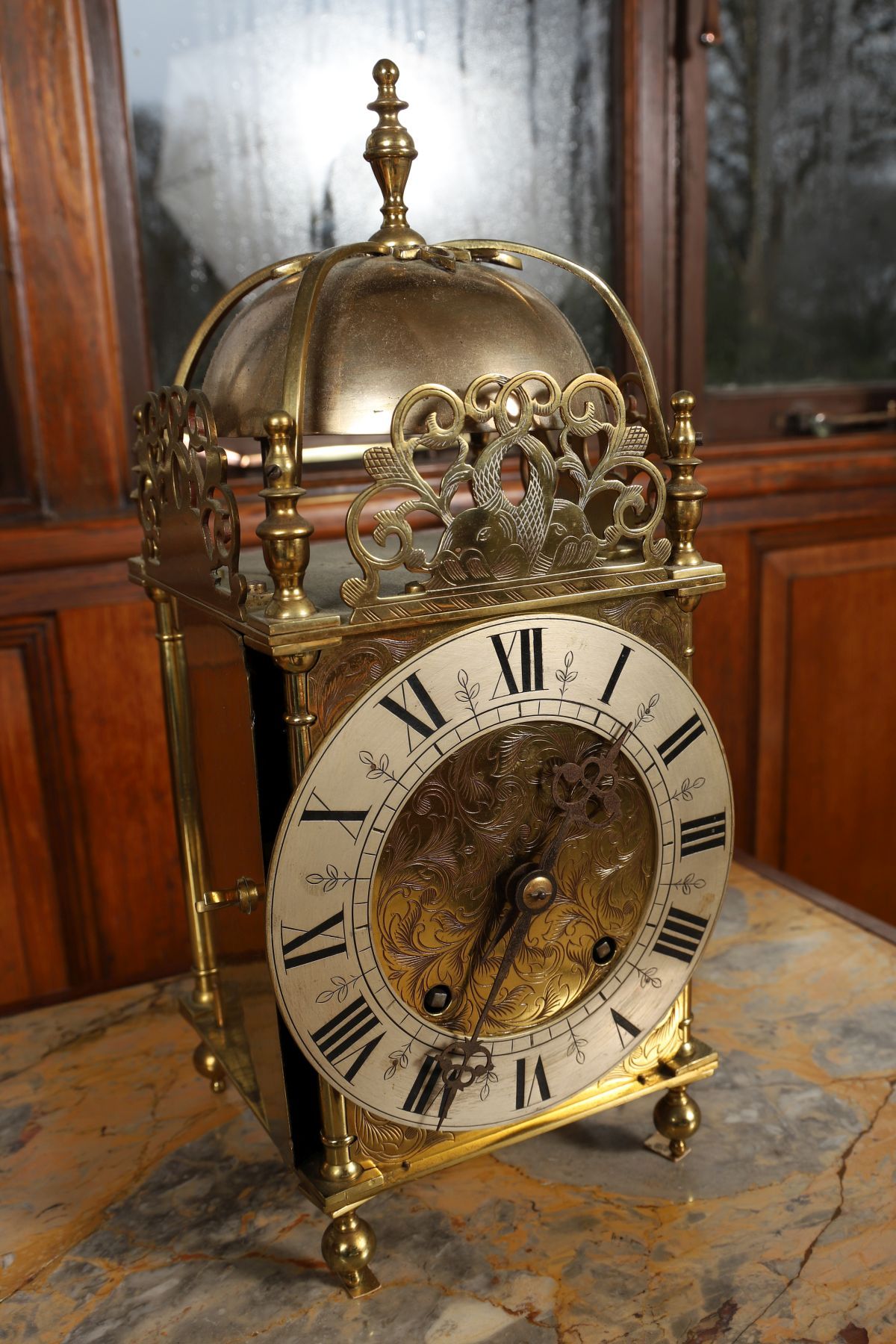 The brass case with domed top and turned finial, pierced and engraved foliate cresting above a circular engraved dial with Roman numerals, fitted with a twin-train movement and raised on bun feet.
