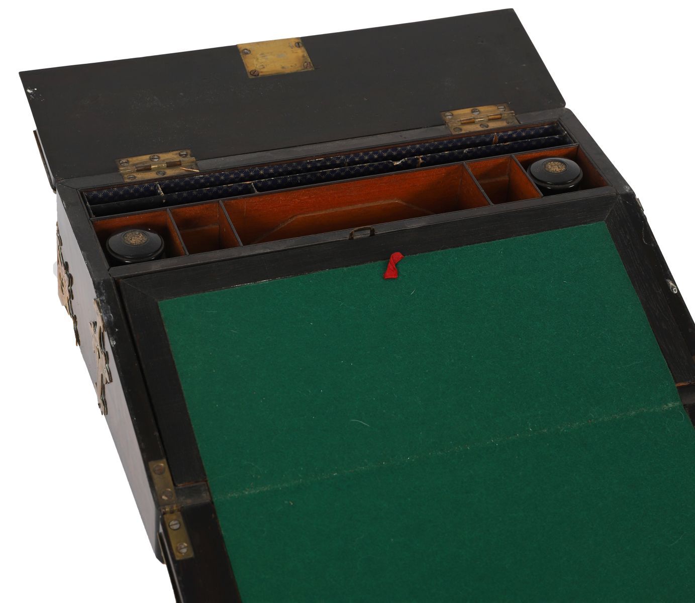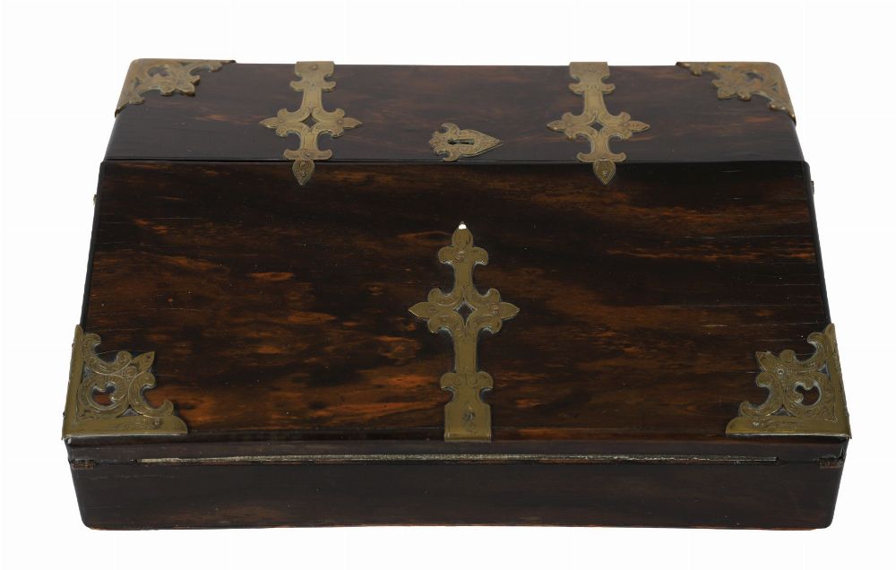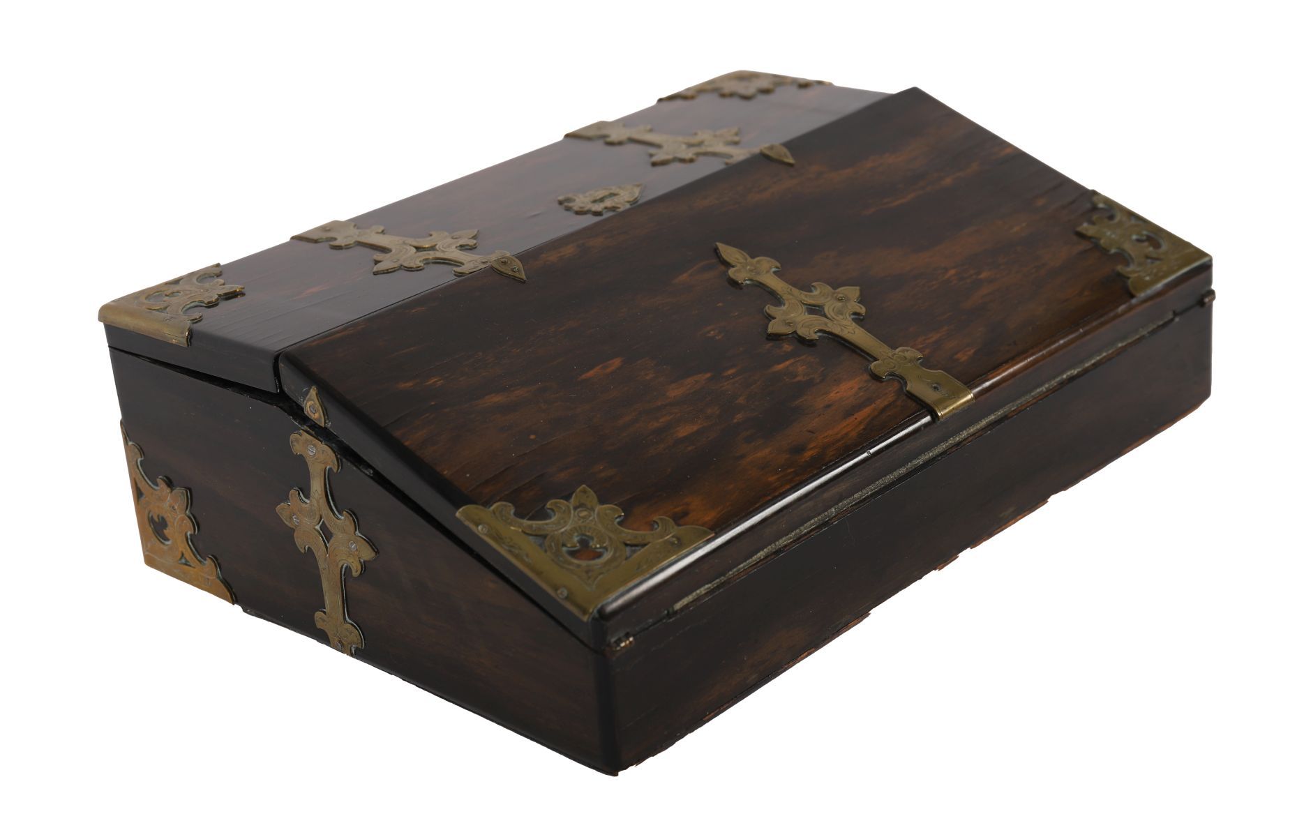 A handsome 19th-century writing slope in richly figured coromandel veneer, the exterior fitted with decorative engraved brass corner straps and escutcheons in the Gothic Revival style. The hinged lid opening to reveal a fitted writing interior with compartments for pens, inkwells, and stationery.