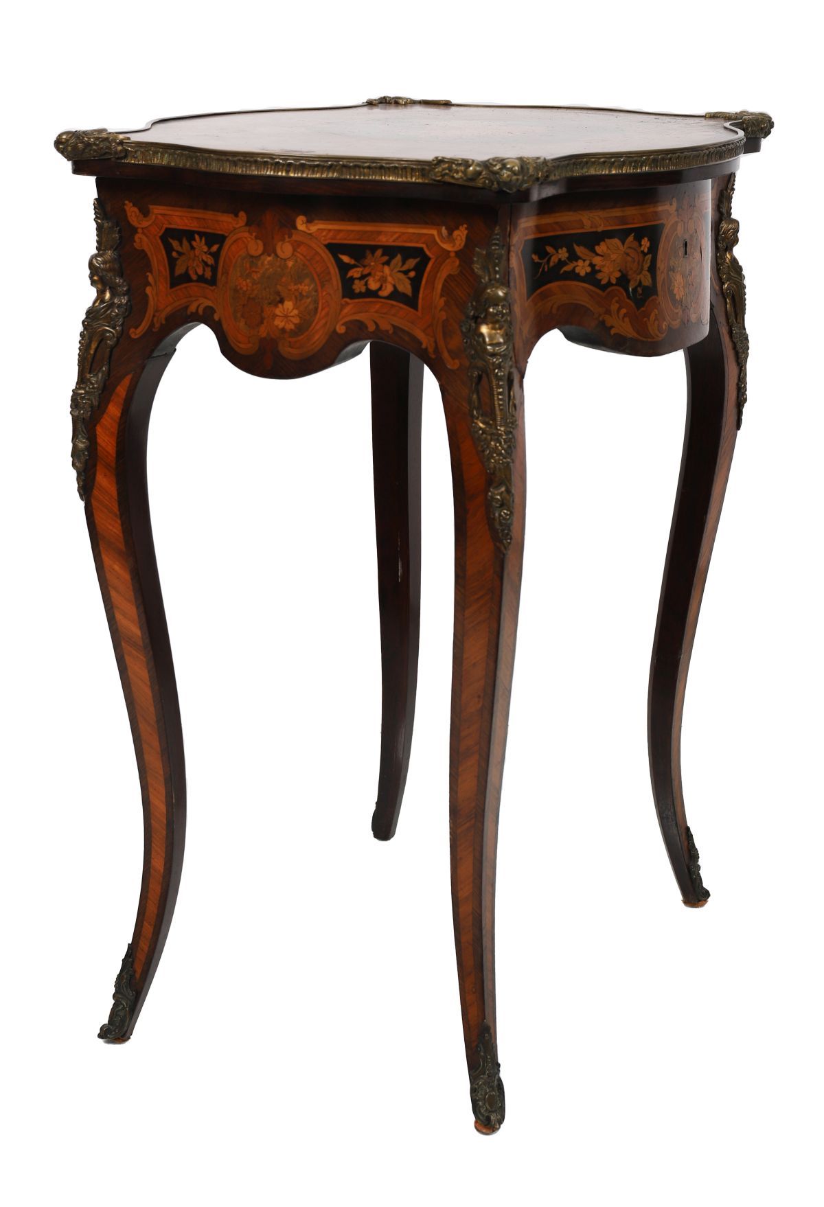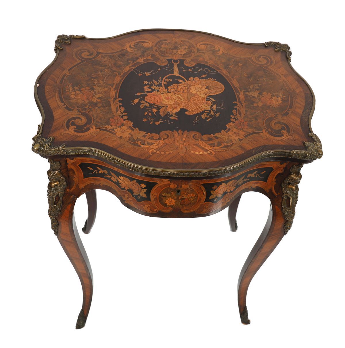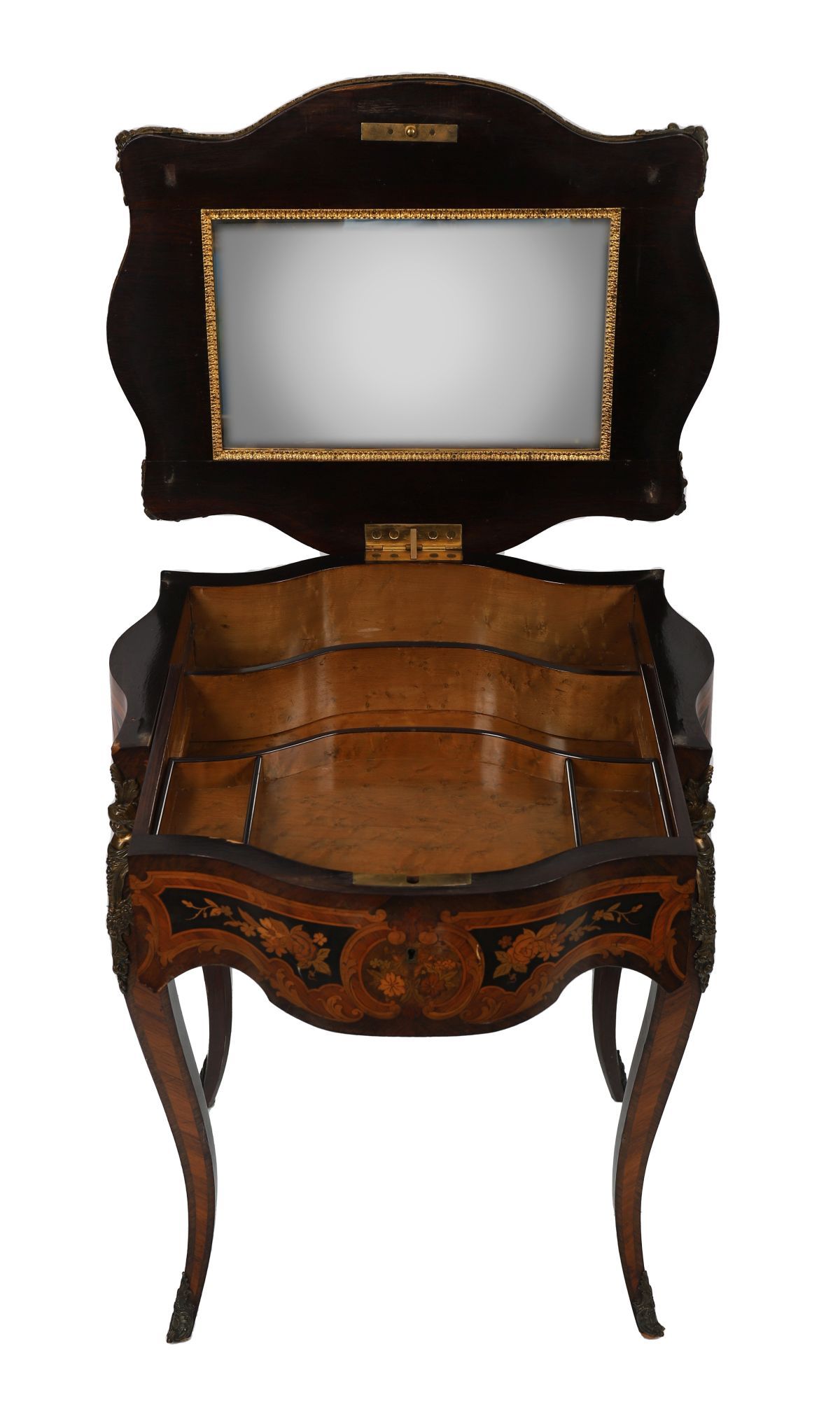 A 19th-century brass-mounted marquetry vanity table, the shaped top with floral inlay and lift-up section opening to a fitted interior, raised on cabriole legs with applied gilt metal mounts.