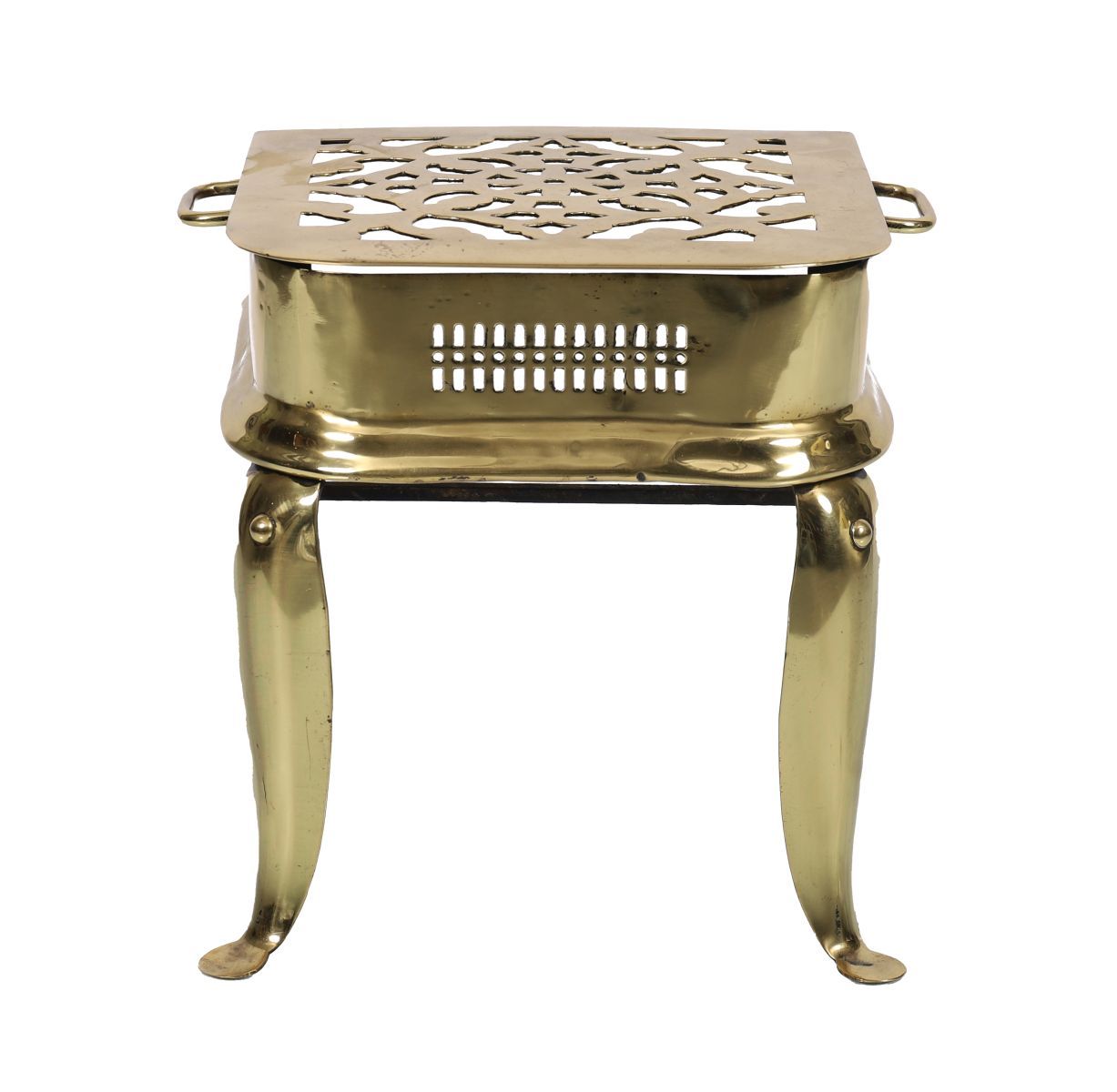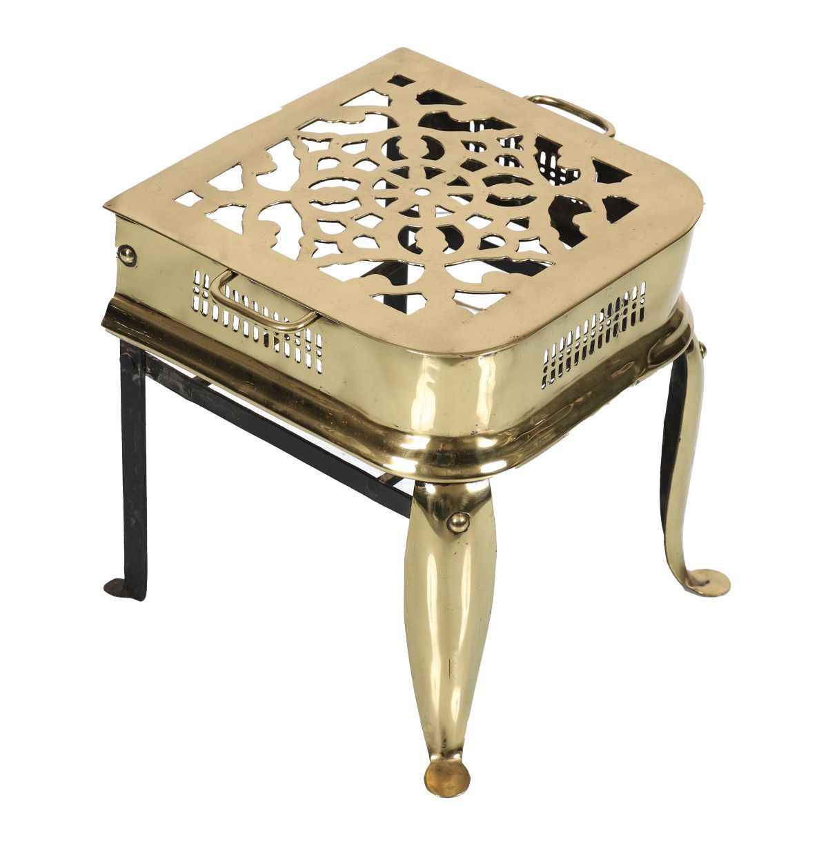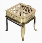 An attractive brass trivet, the rectangular pierced top with scroll and foliate motifs above a galleried frame, raised on cabriole legs with pad feet.
