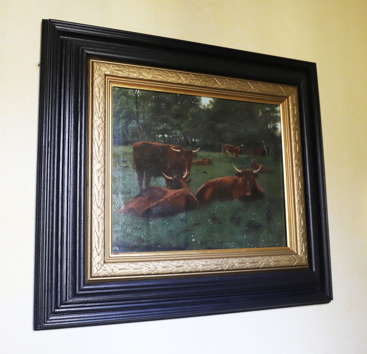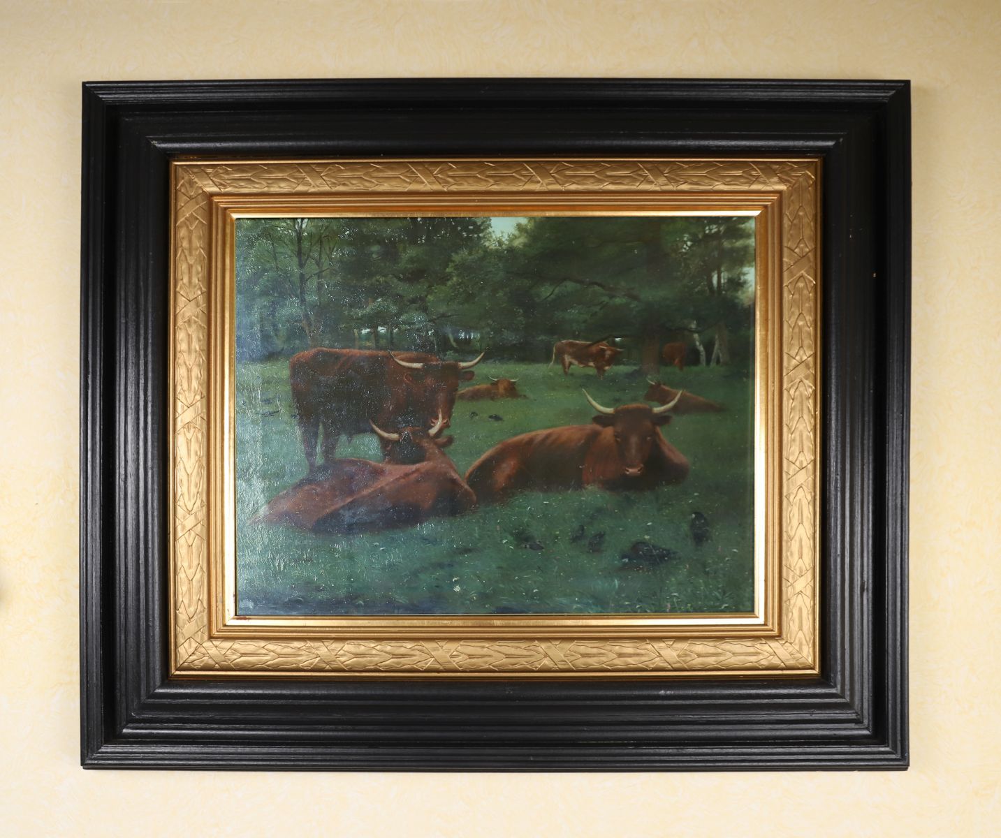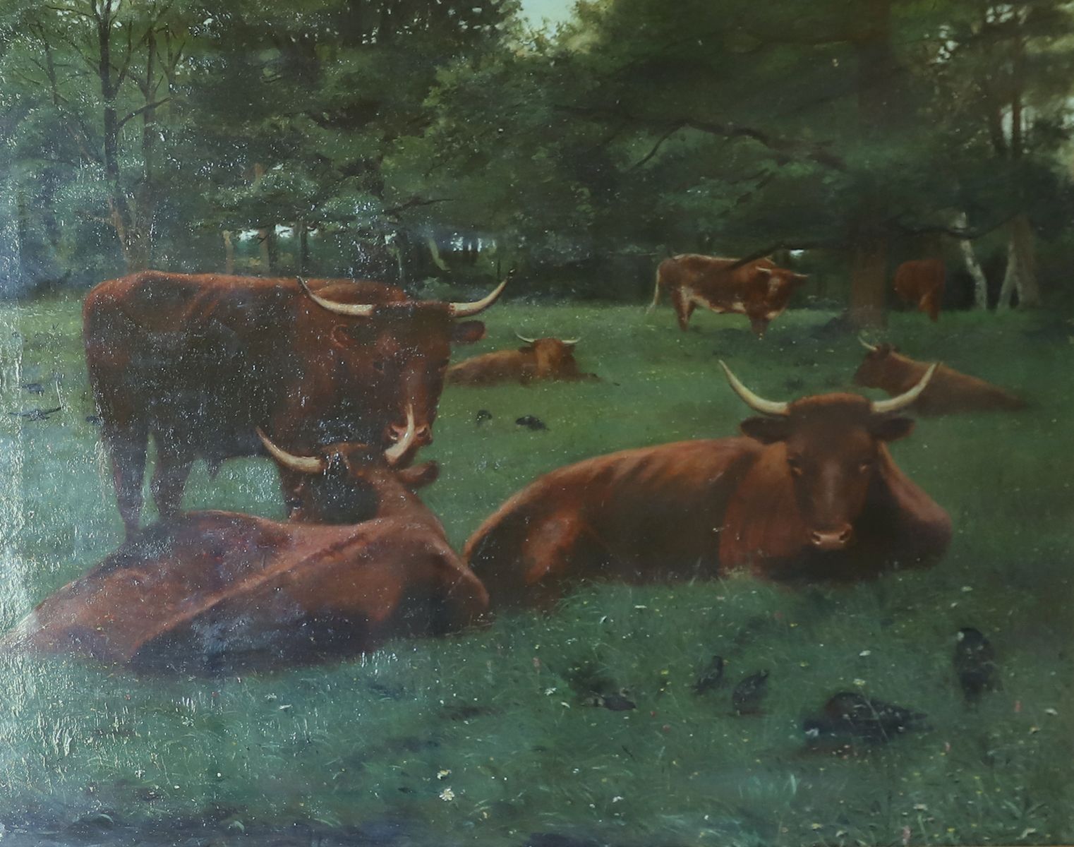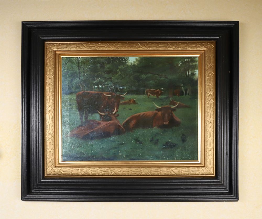 Cattle and crows in a landscape. Oil on canvas depicting grazing cattle beneath trees in a rural setting. Enclosed in a gilt and ebonised frame.