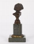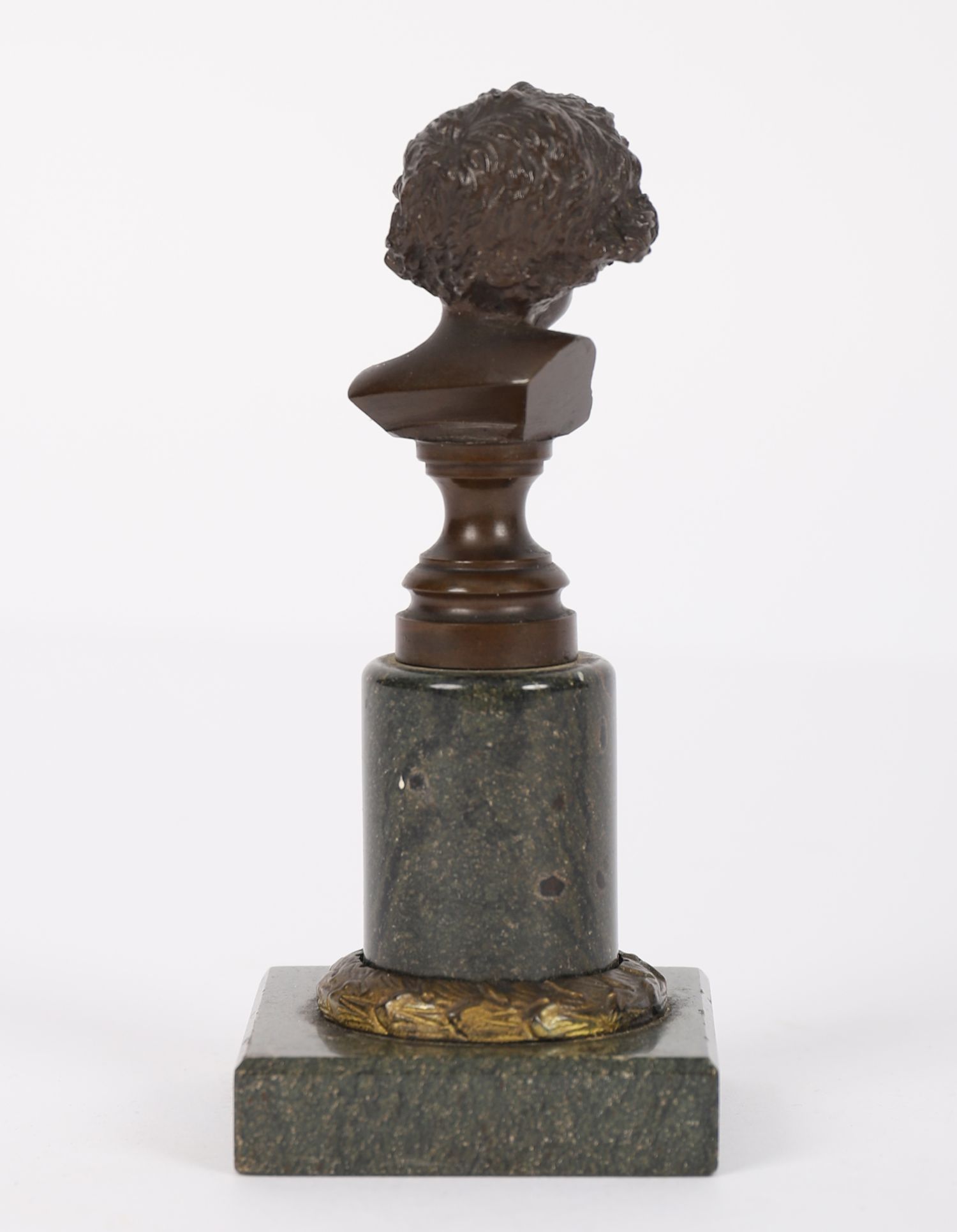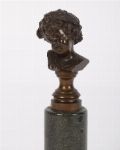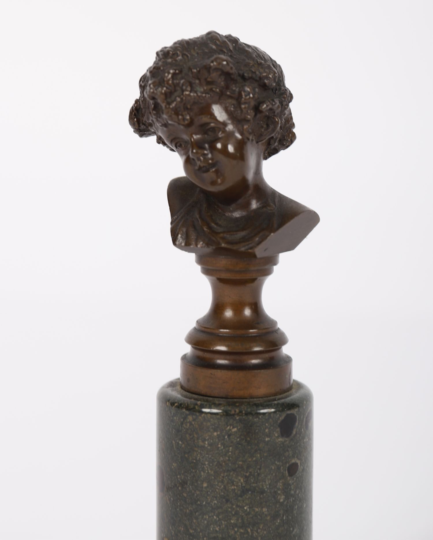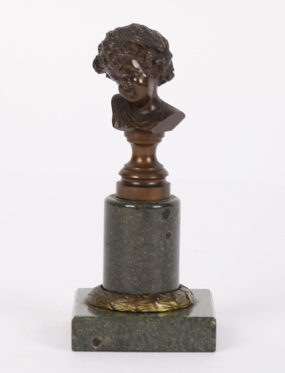 A 19th century patinated bronze bust of a youth with curly hair, modelled with expressive detail and mounted on a turned column support above a square marble plinth. A finely cast decorative piece in the neoclassical taste.