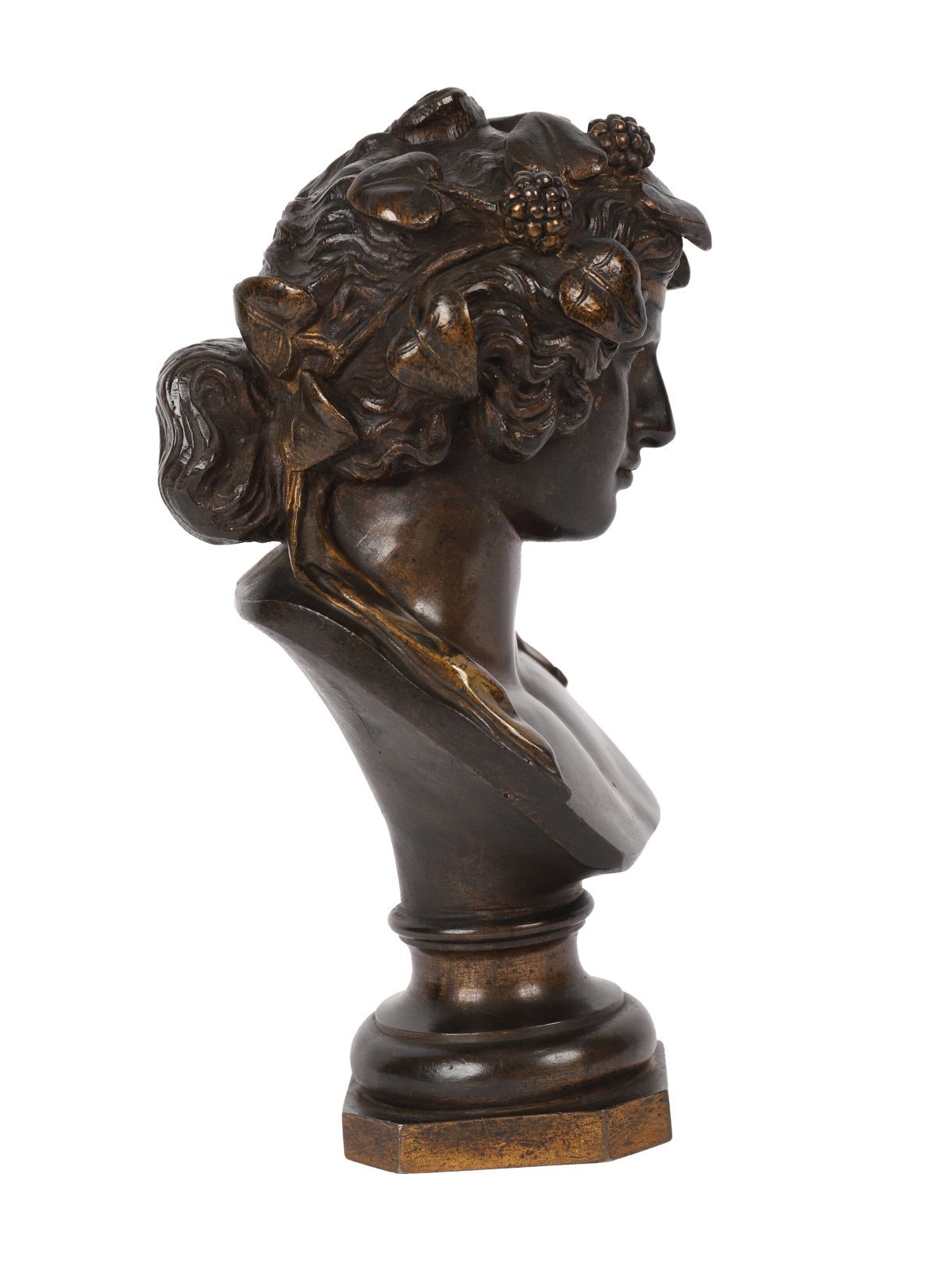 A 19th-century bronze bust of a classical female figure wearing a laurel wreath, mounted on a circular socle base.