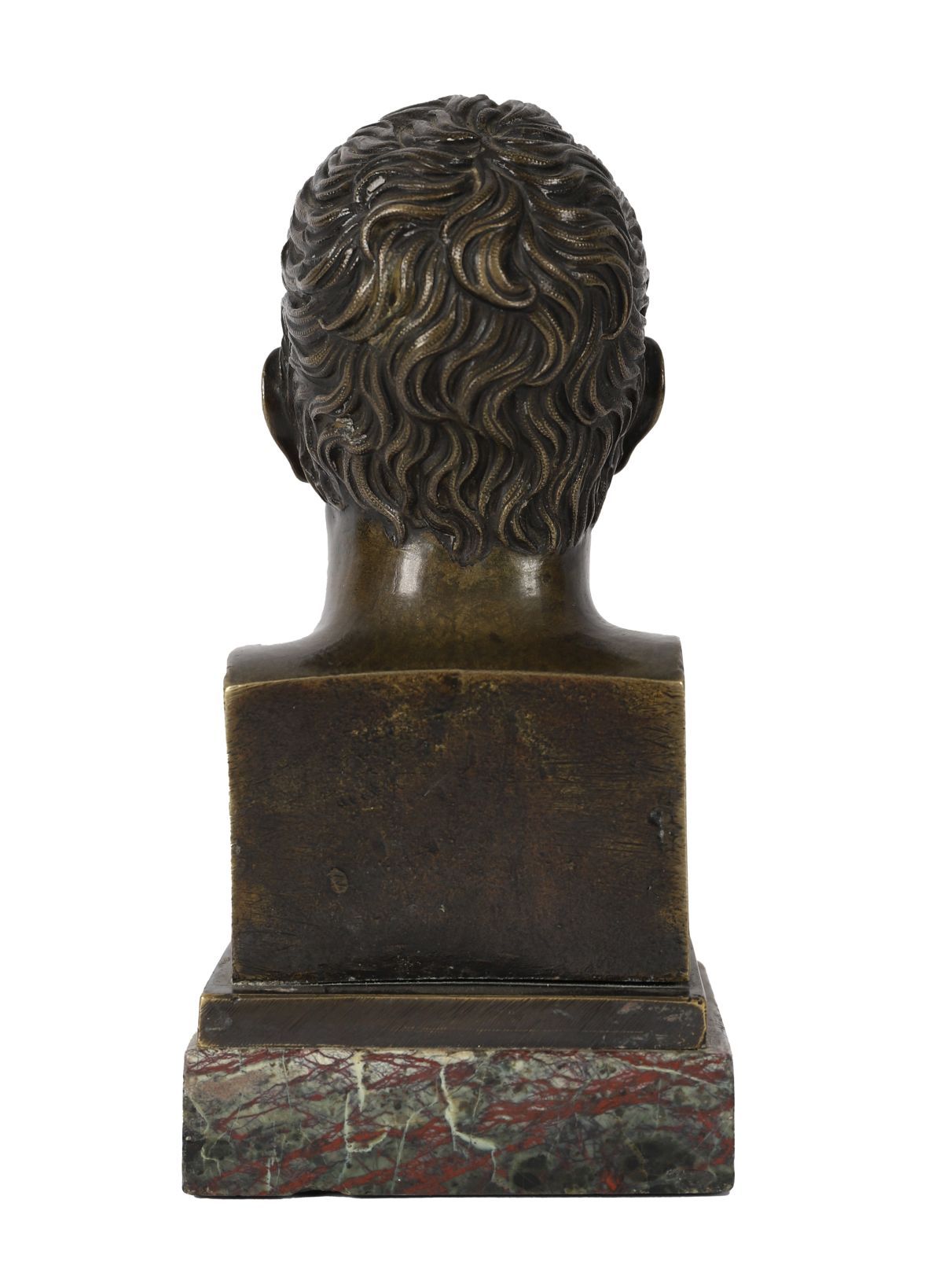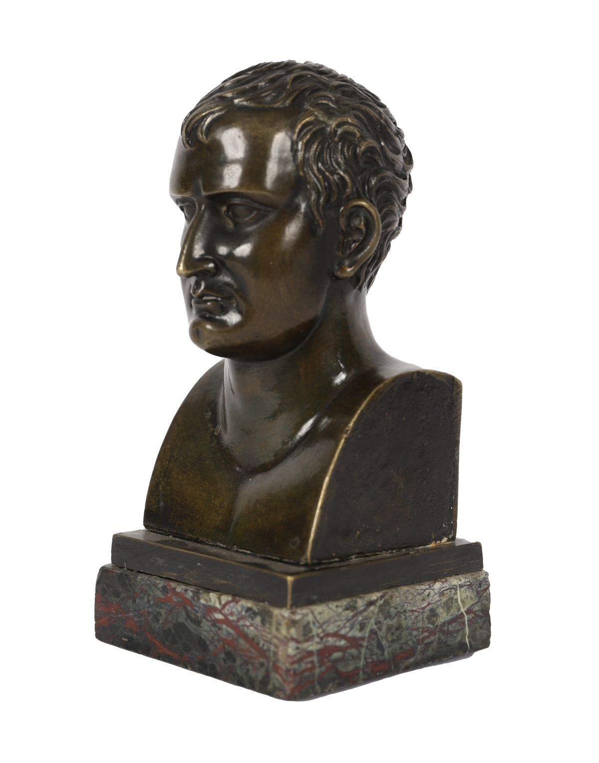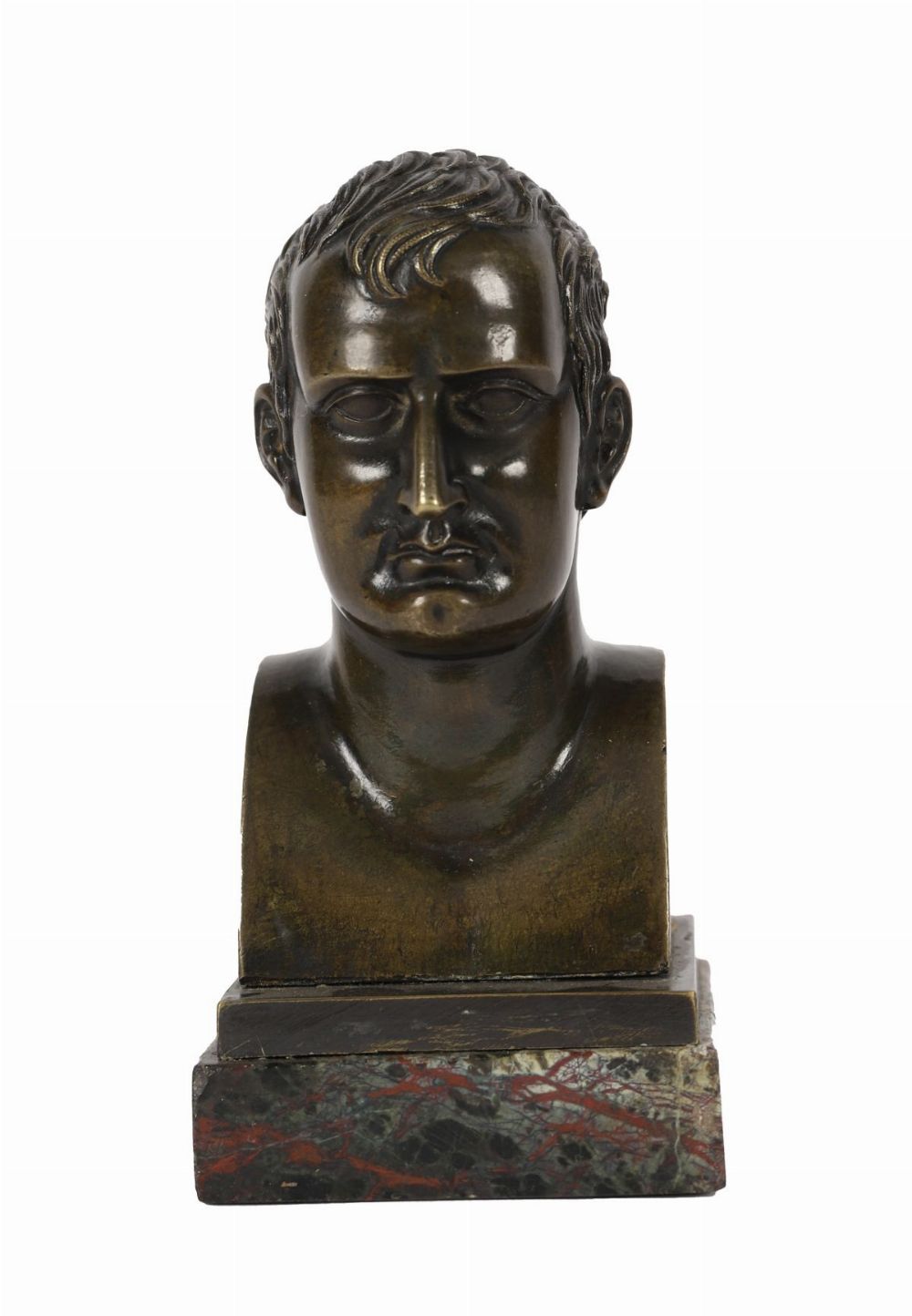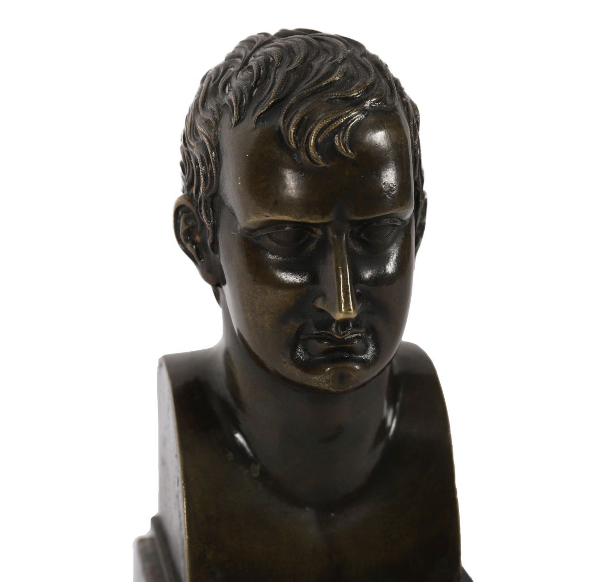 A small 19th-century bronze bust of Napoleon, of compact form with finely detailed facial features and short curled hair, mounted on a square marble base.