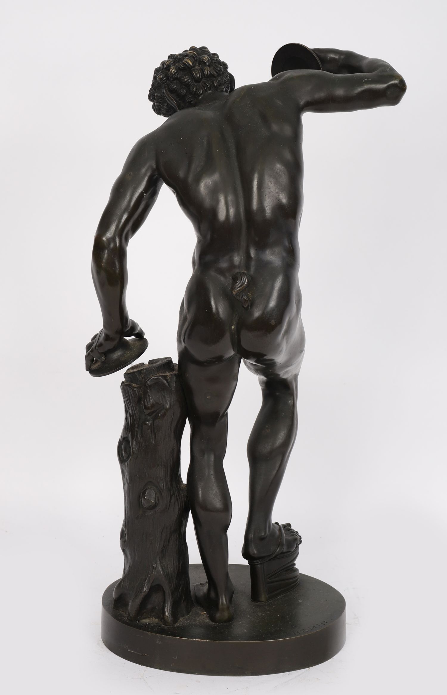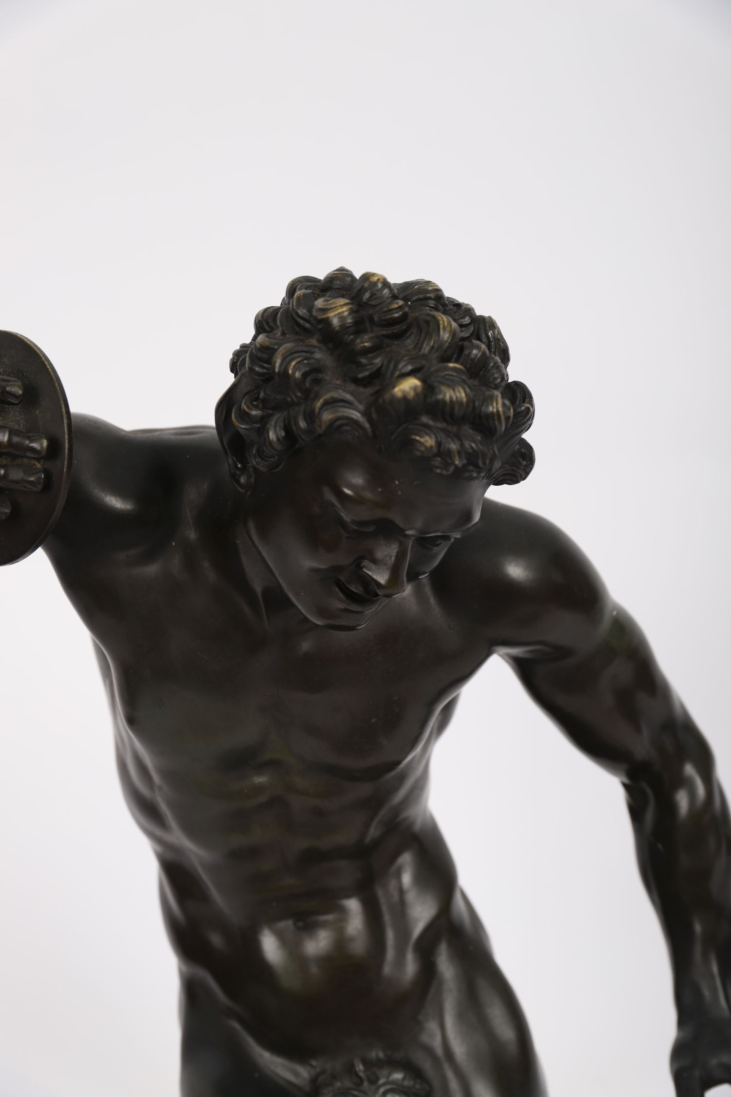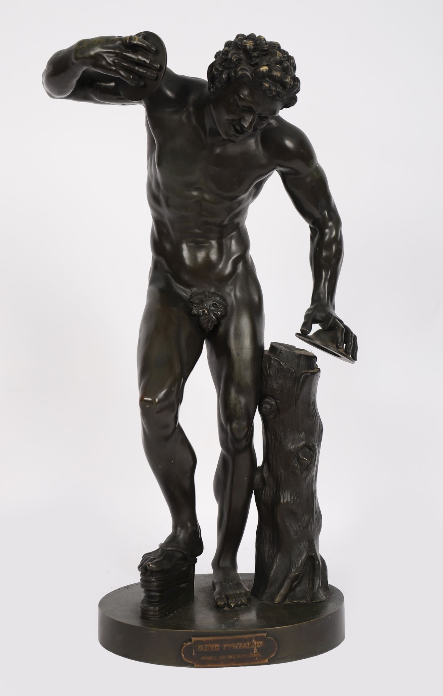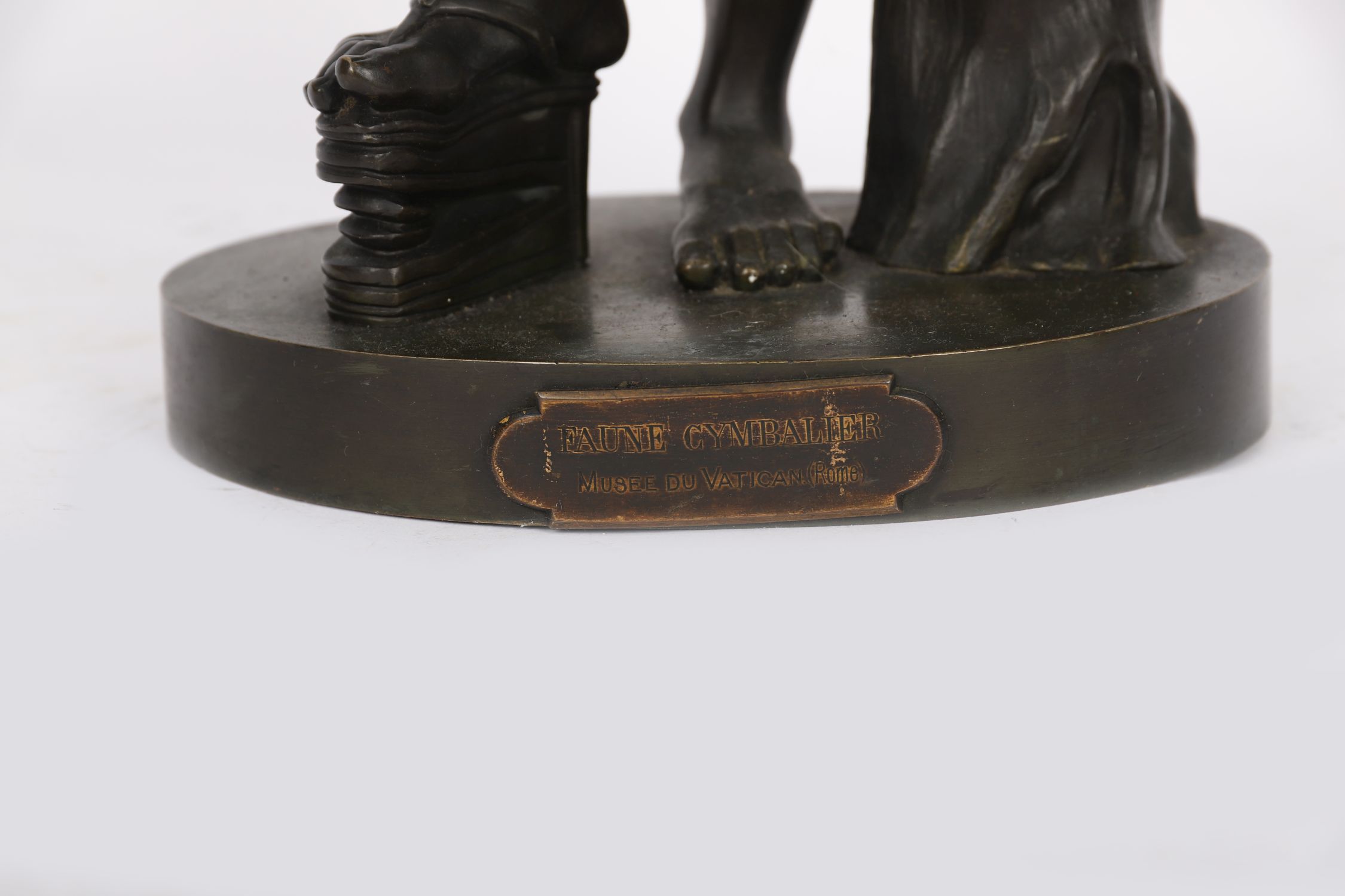 A 19th century patinated bronze figure of the “Faune Cymbalier,” after the antique model preserved in the Vatican Museums. The faun is shown poised in dramatic motion, holding cymbals aloft, his muscular body finely modelled with expressive features and textured hair. Mounted on a circular base with applied title plaque “Faune Cymbalier – Musée du Vatican.”