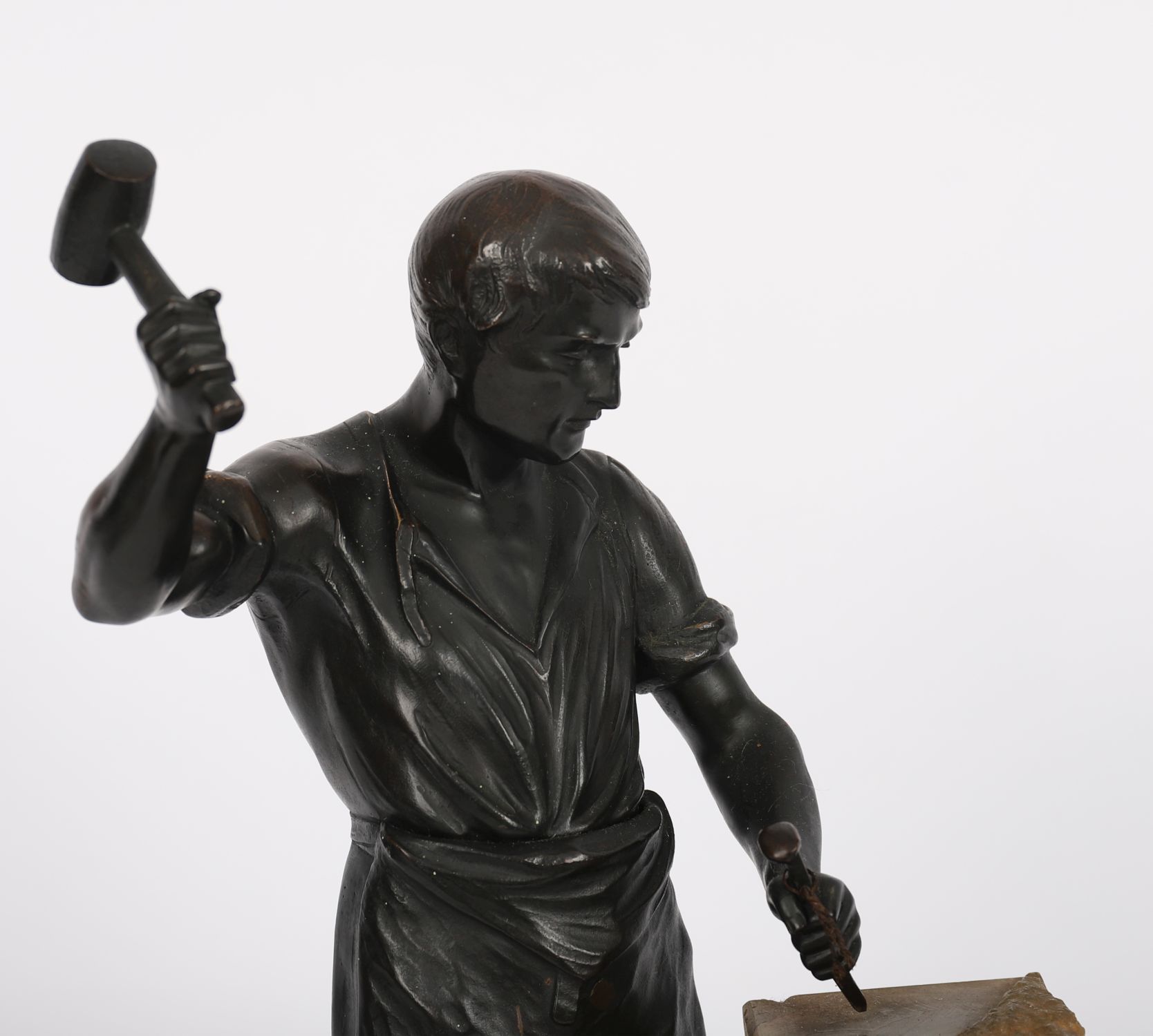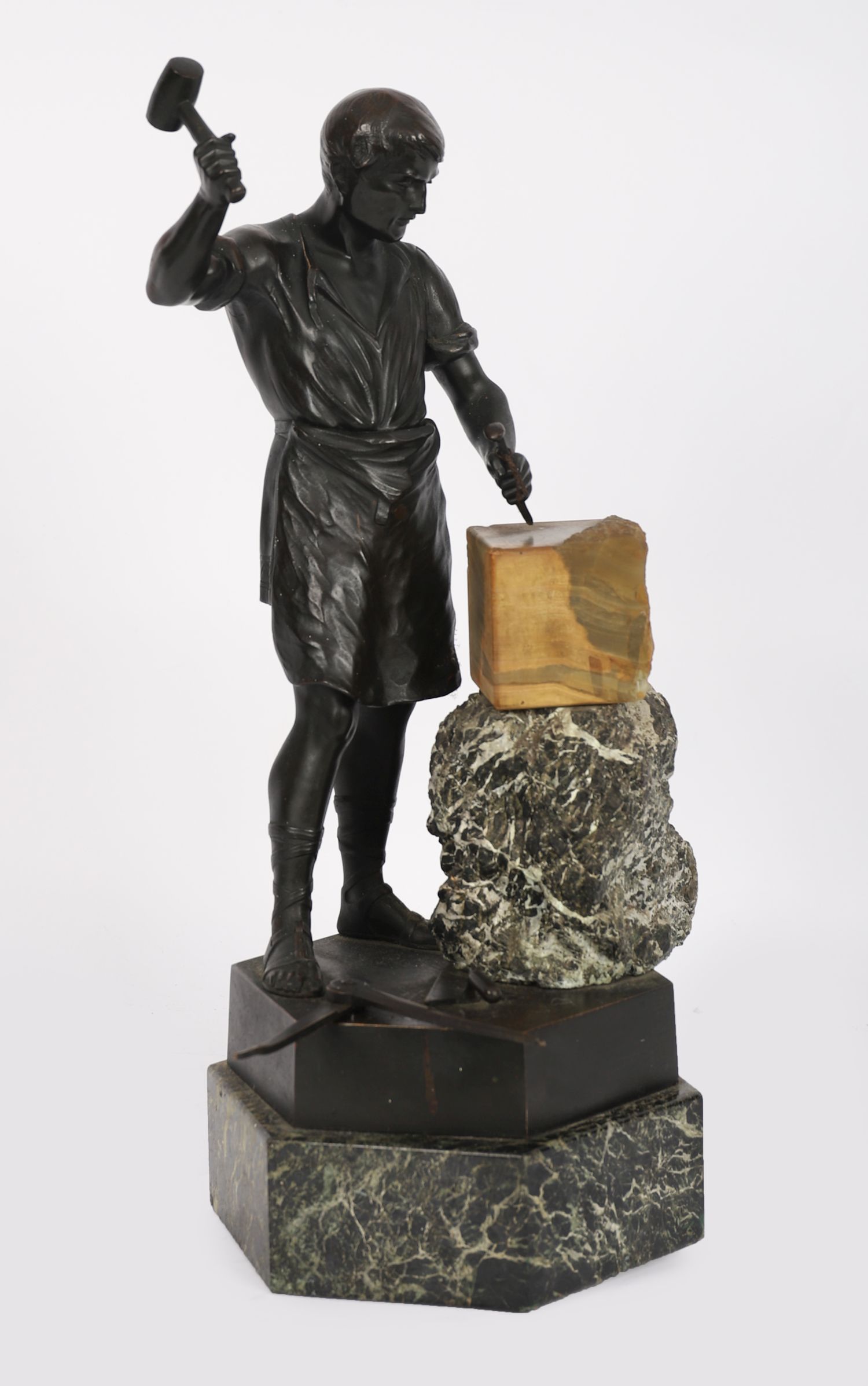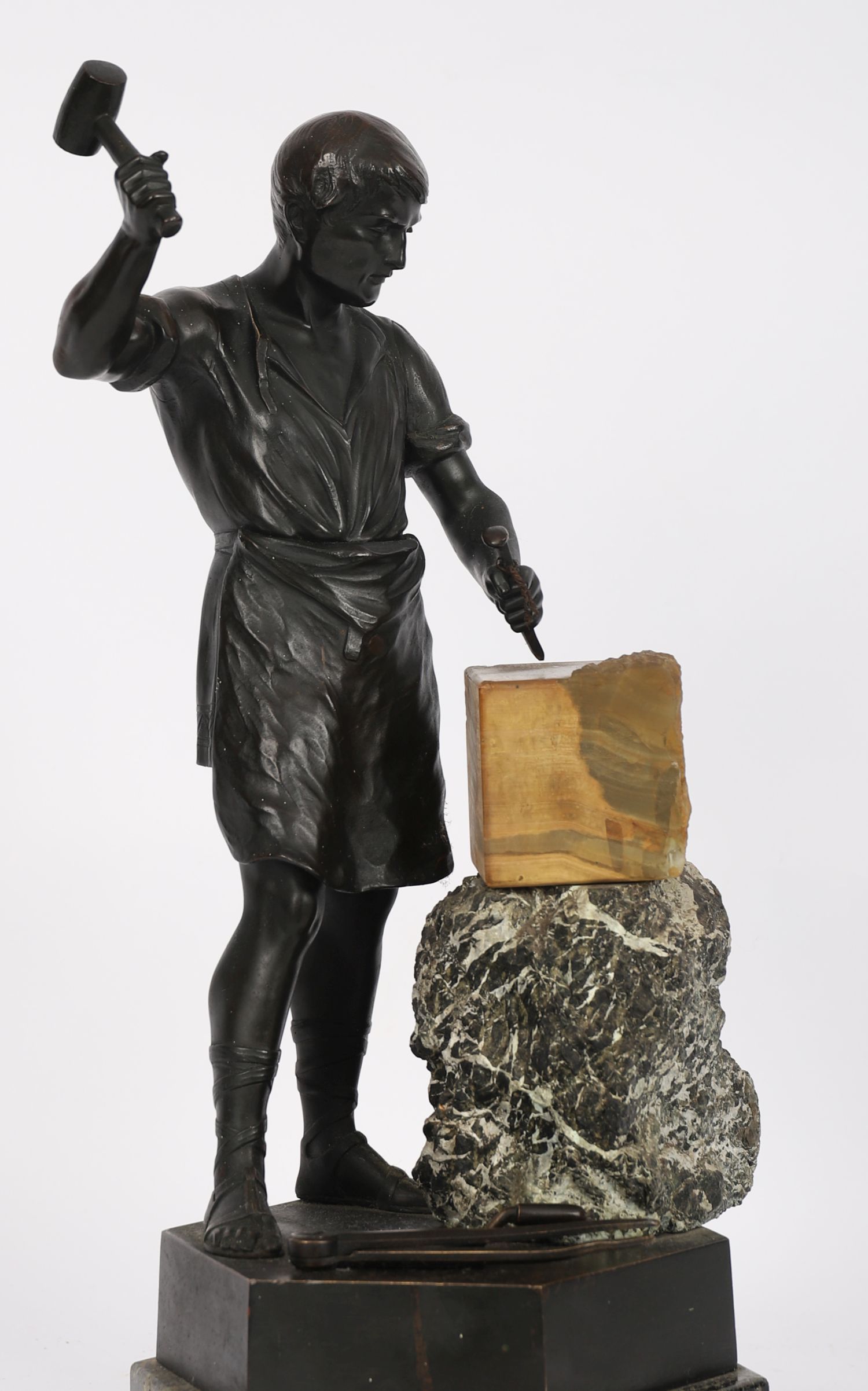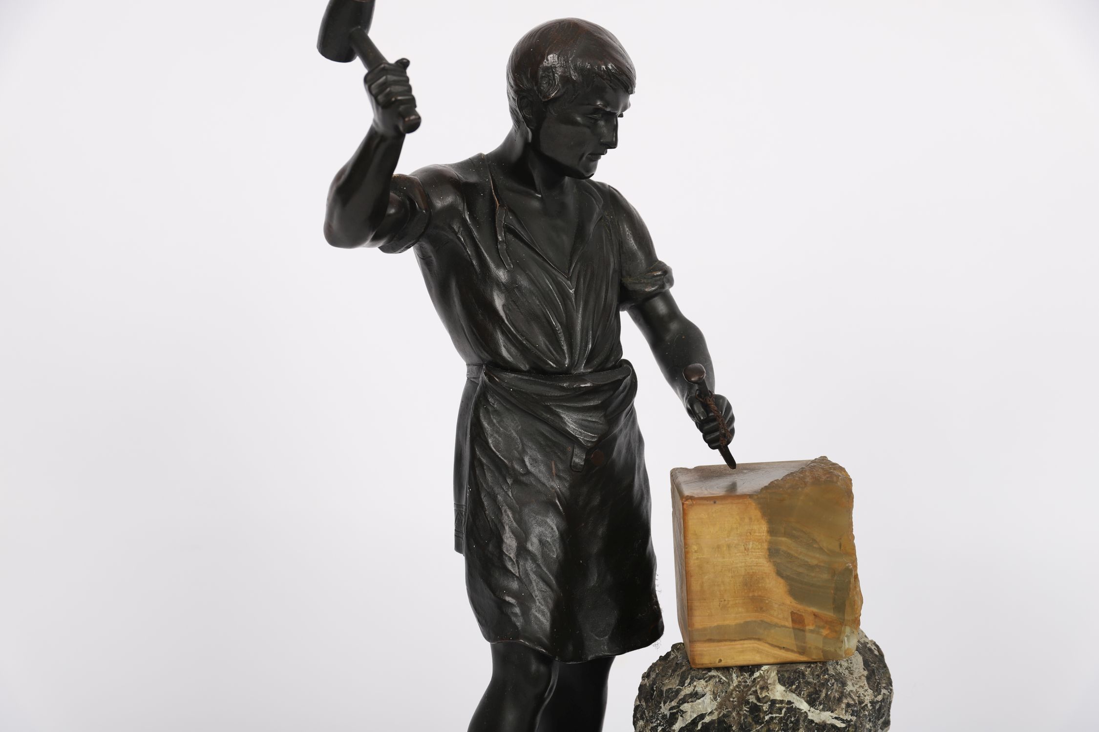 A 19th century patinated bronze figure of a sculptor, dynamically modelled with raised hammer and chisel in hand, poised over a block of marble. The figure stands in contrapposto on a variegated marble base with stepped plinth.