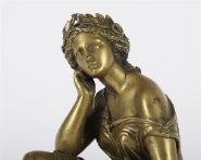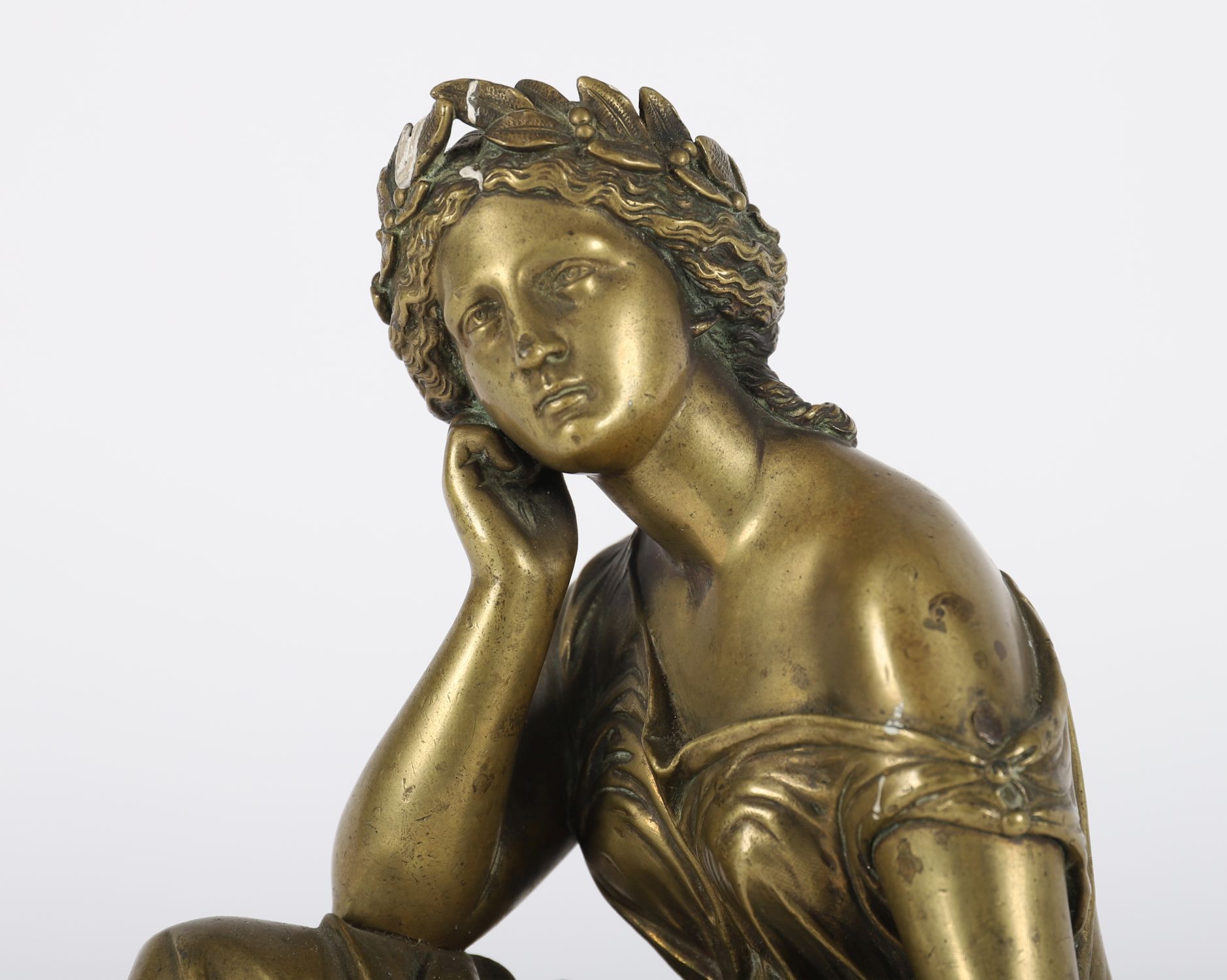 A finely cast bronze figure of a seated woman in classical robes, leaning contemplatively on one arm, her other resting across her lap. Likely representing a muse or allegorical figure. Golden patina with surface wear.