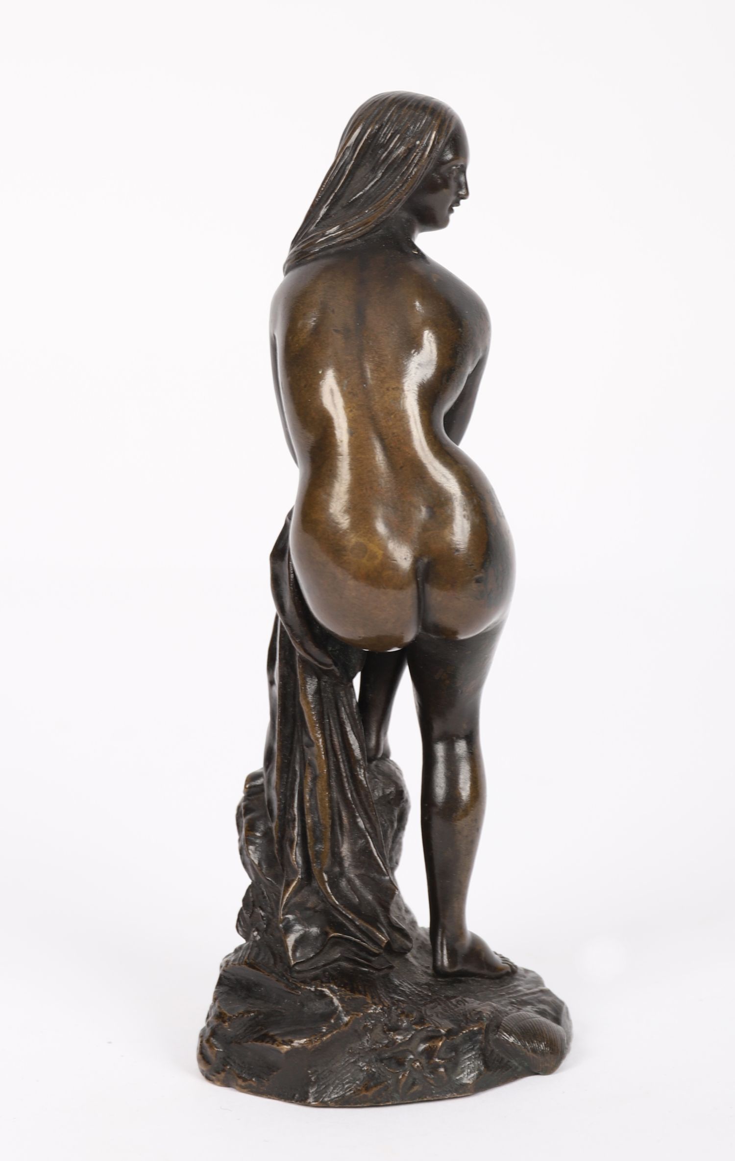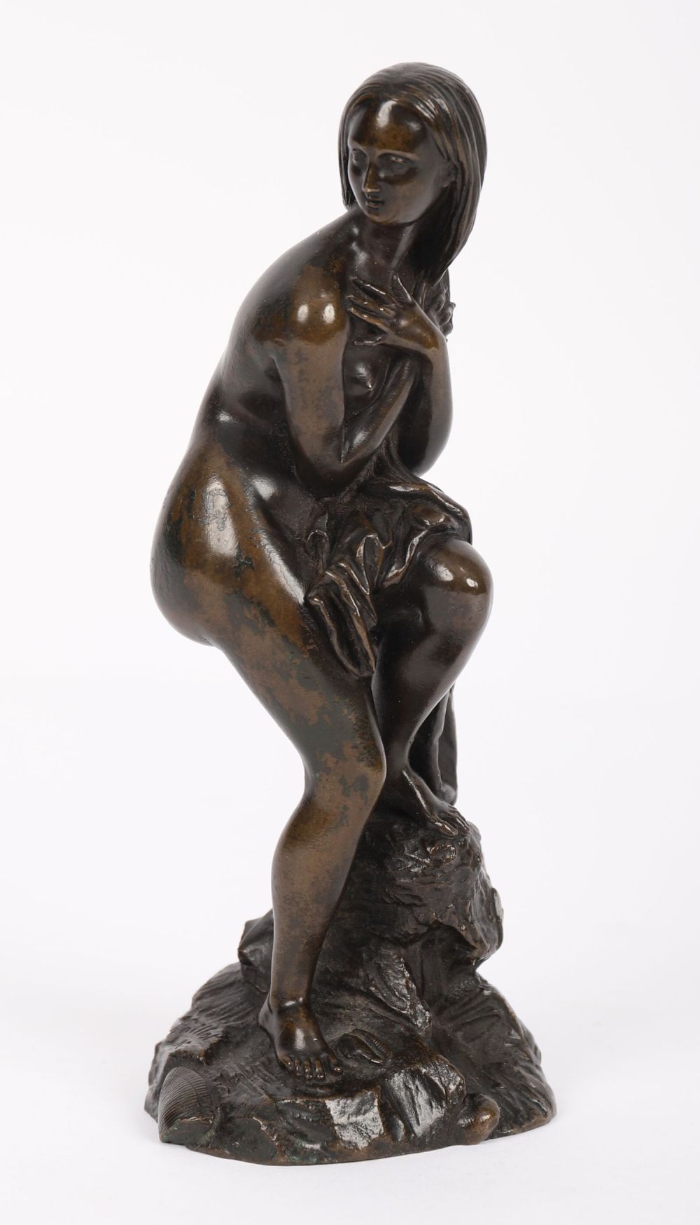 A finely cast 19th century bronze figure of a seated nude, portrayed in a naturalistic pose upon a rocky base. The modelling captures a sense of movement and delicacy, with a dark brown patina enhancing the surface. Signed Buisson.