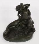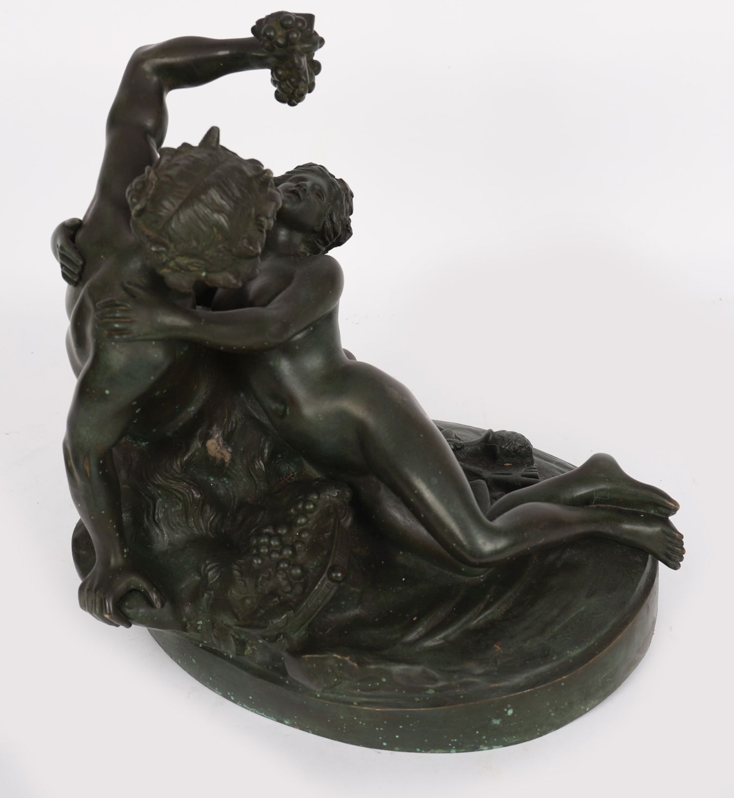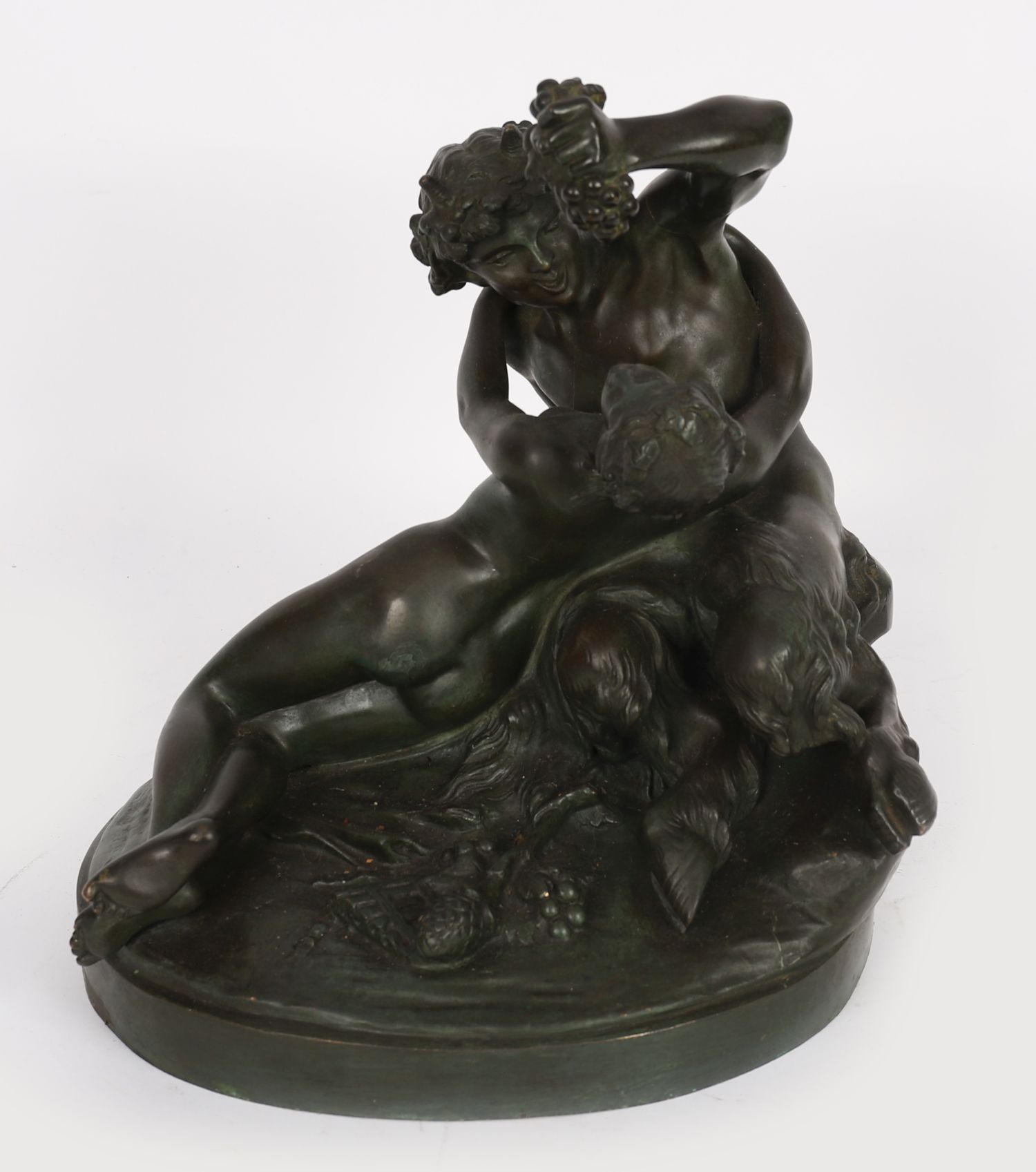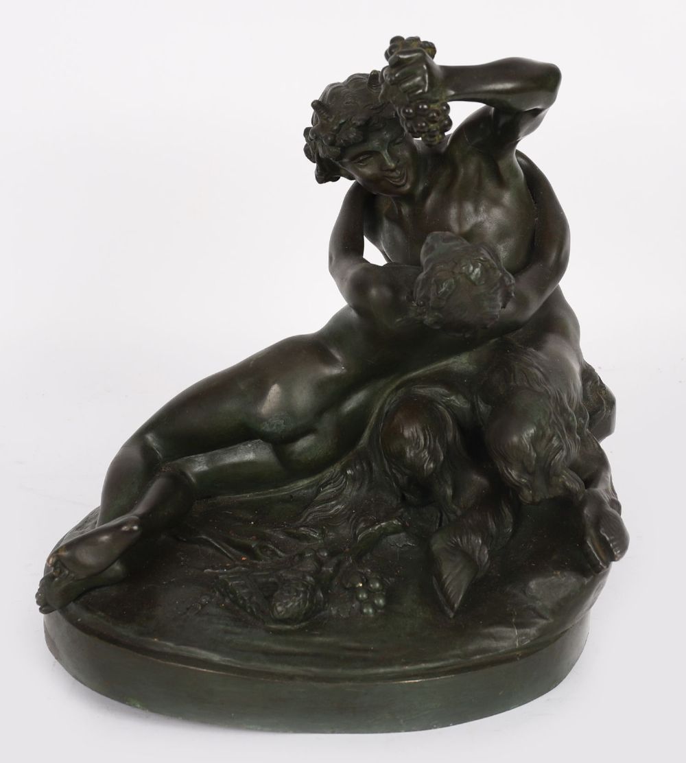 A 19th century patinated bronze figural group depicting Bacchus reclining with a faun at his side, modelled with grapes and vines, mounted on an oval base.
