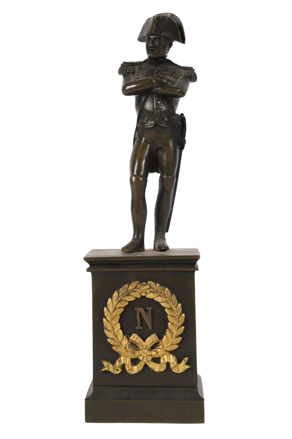 A 19th-century bronze figure of Napoleon standing with arms crossed, in uniform with epaulettes and bicorne hat, mounted on a square plinth applied with a gilt bronze laurel wreath and “N†cipher.