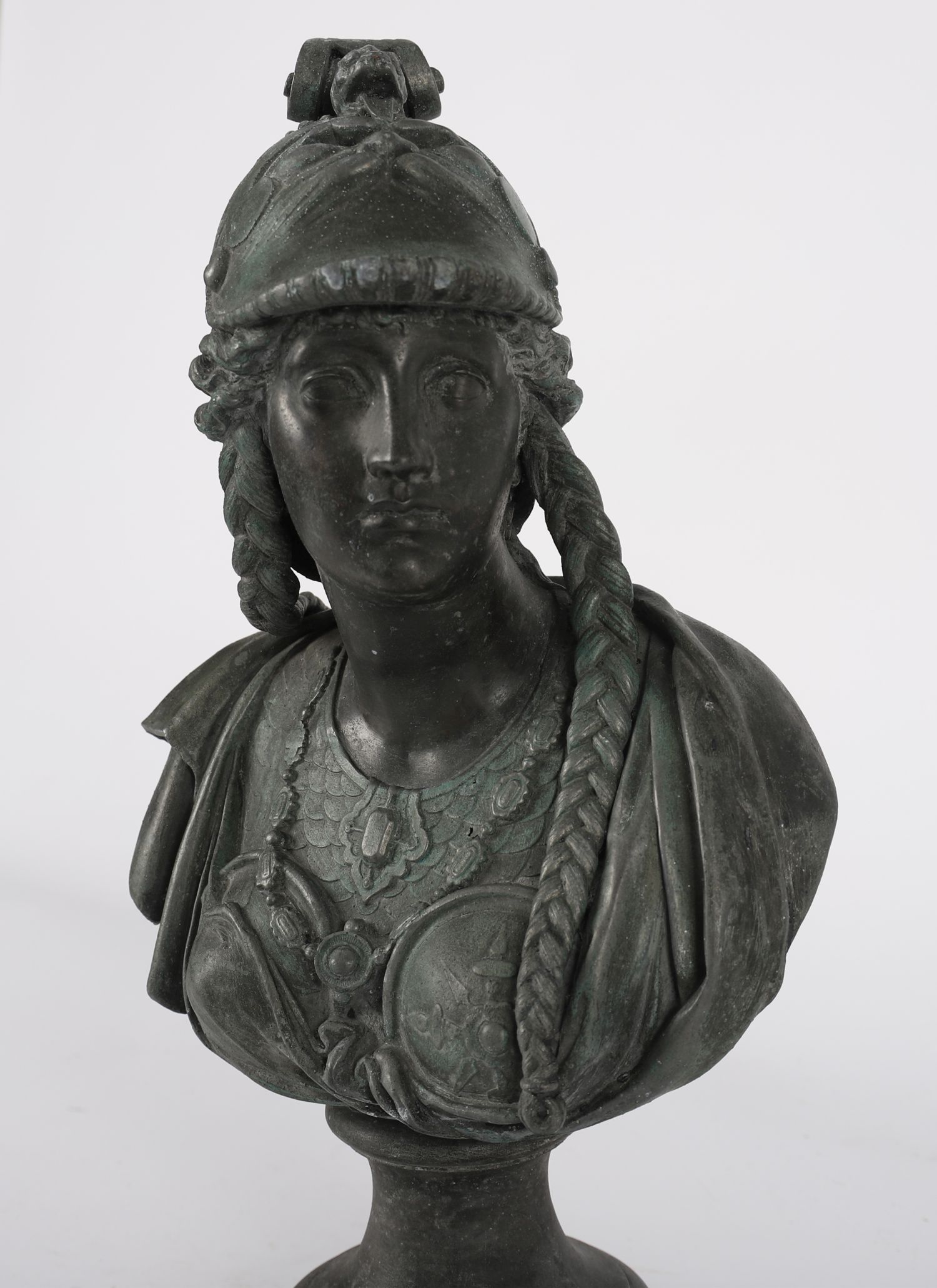A finely cast 19th-century bronzed bust of Athena, the Greek goddess of wisdom and war, shown wearing an ornate helmet decorated with an owl and crest, and detailed armour. Mounted on a turned socle base.