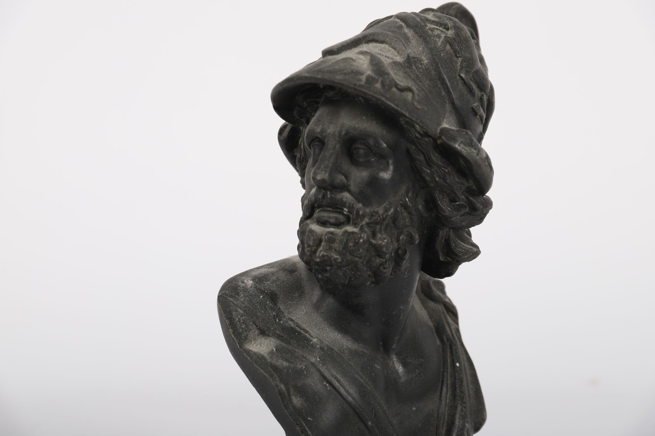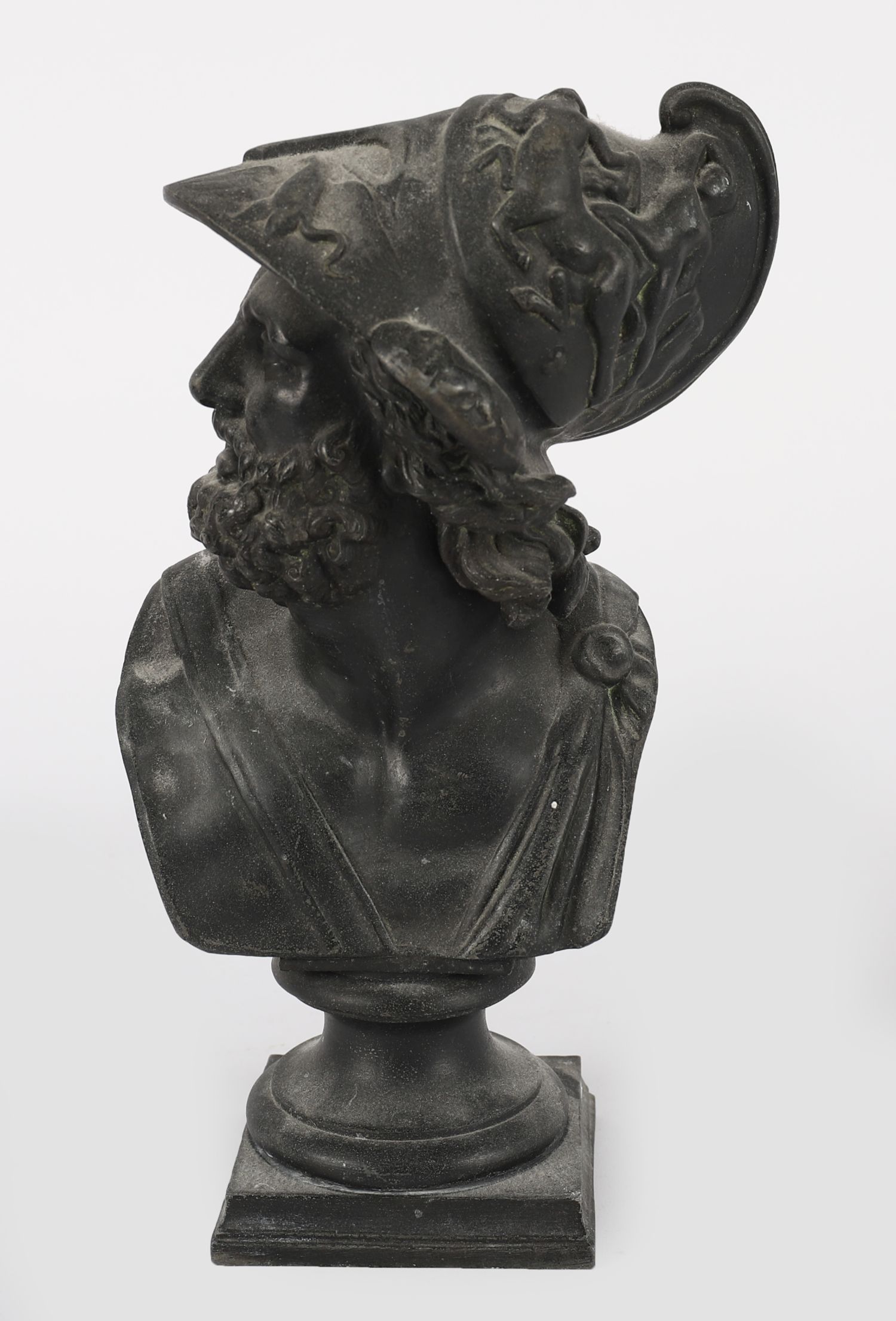 A classical 19th-century bronzed bust of Pericles, the ancient Athenian statesman and general, recognisable by his Corinthian helmet pushed back over curly hair and beard. Displayed in profile with fine Hellenistic modelling.