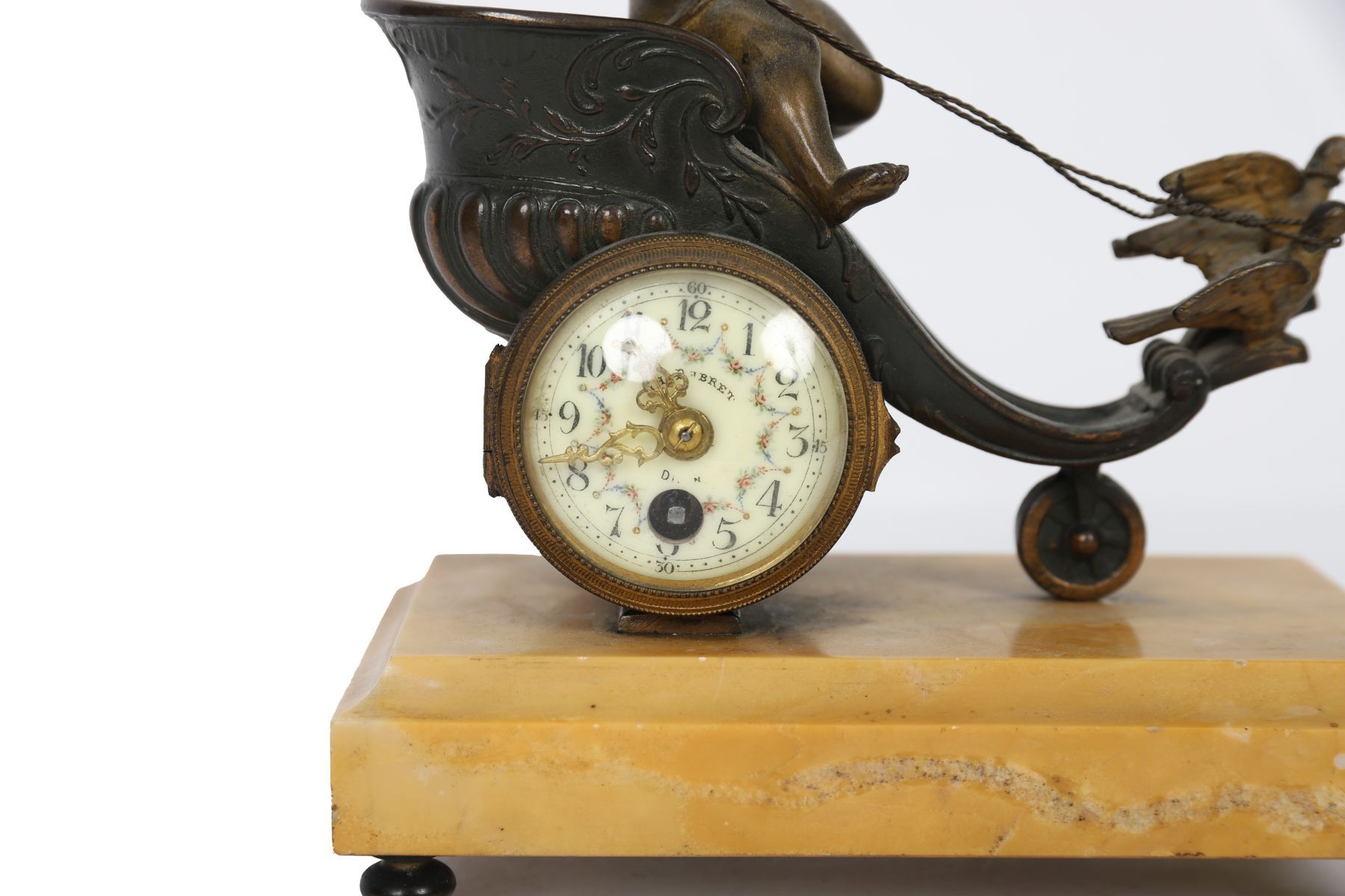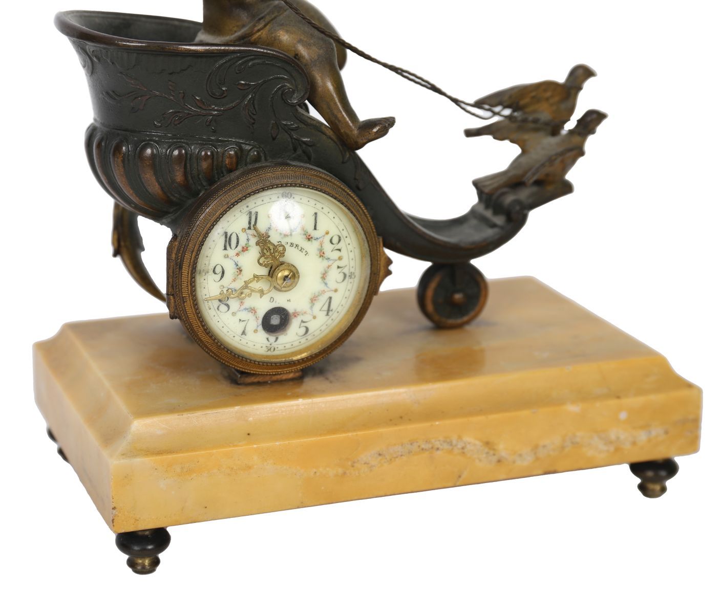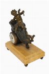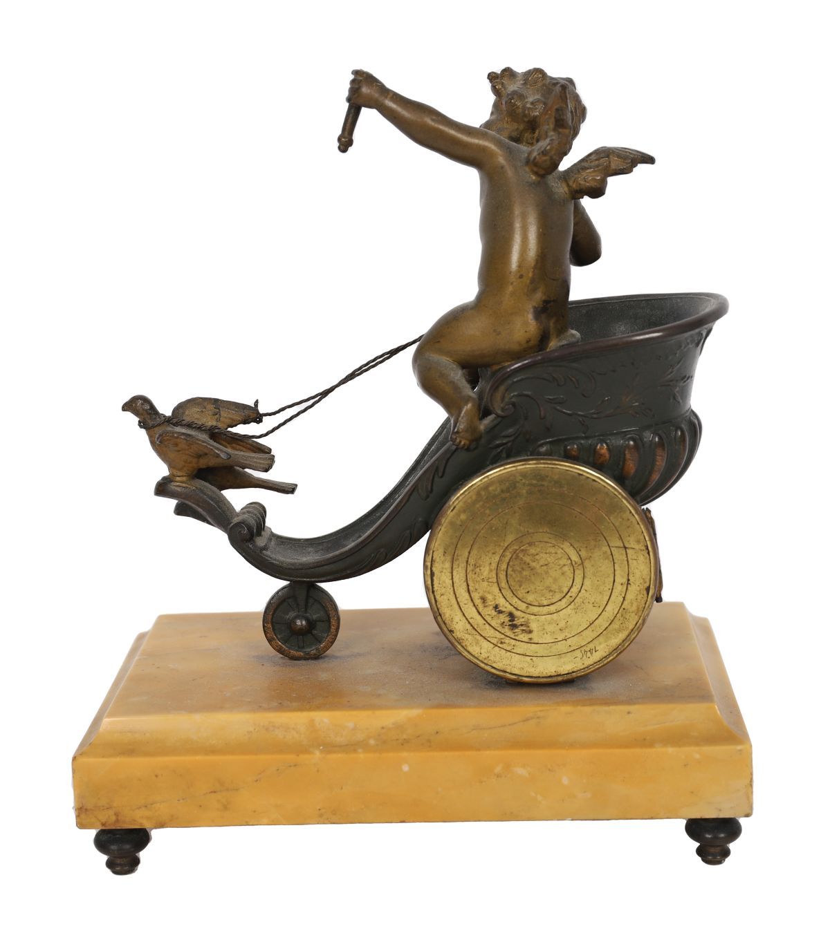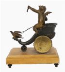The bronzed case formed as a scrolling cornucopia-shaped chariot, surmounted by a mythological figure and attended by a smaller subsidiary figure, the whole raised on a rectangular sienna marble base. The circular dial is white enamelled and painted with Roman numerals. The sculptural composition and dynamic modelling are characteristic of decorative French clocks of the period.