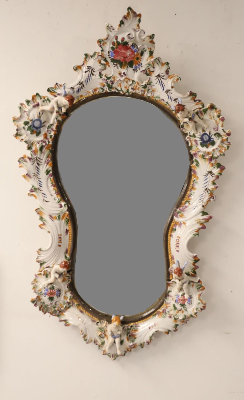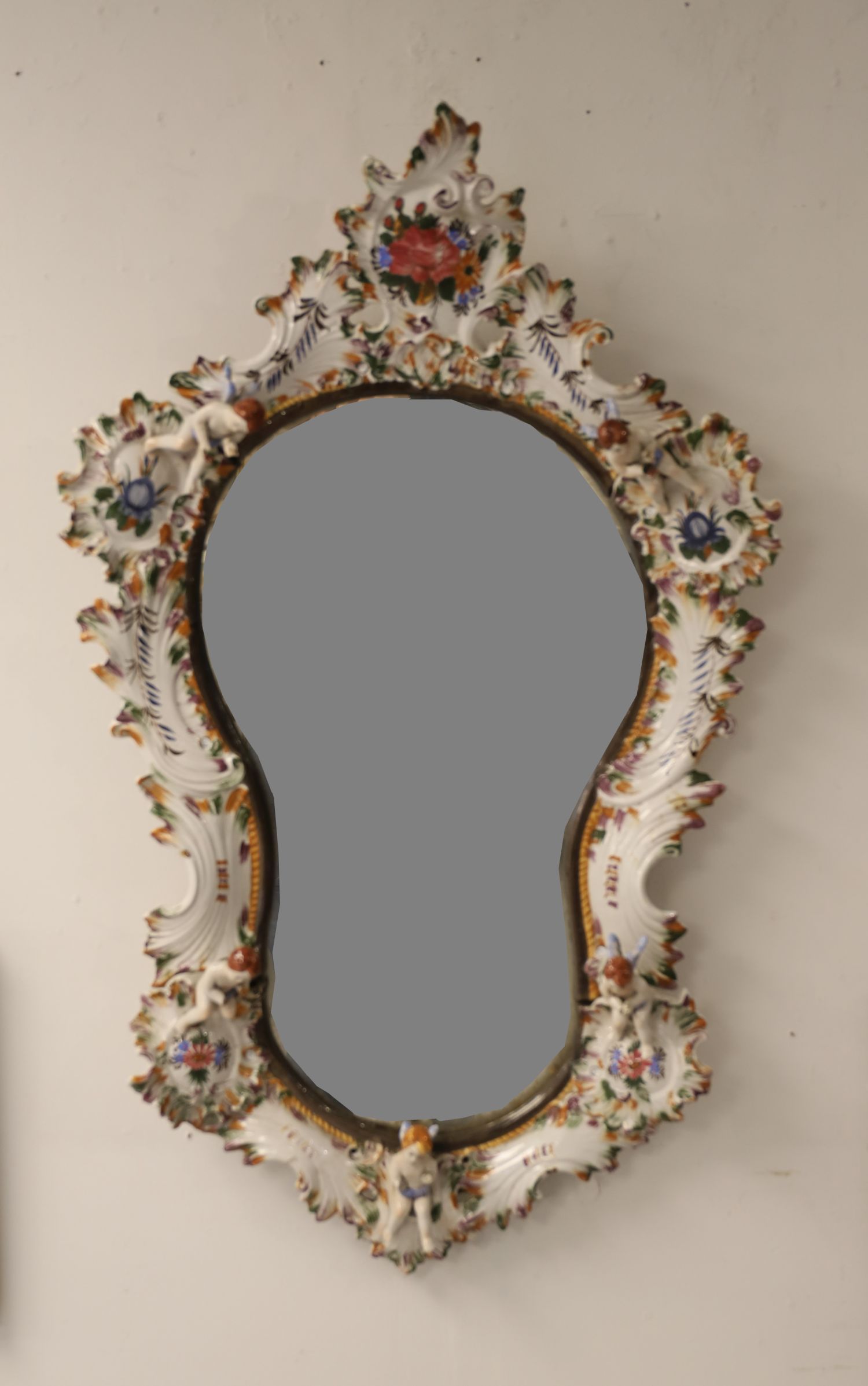 An ornate Capodimonte mirror, 19th century, the asymmetrical cartouche-form frame richly decorated with polychrome floral motifs and applied figures of four cherubs seated within scrollwork borders. The vibrant enamelling and elaborate modelling exemplify the exuberant Rococo-inspired style of Capodimonte porcelain decoration.110 x 70 cm.