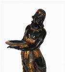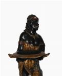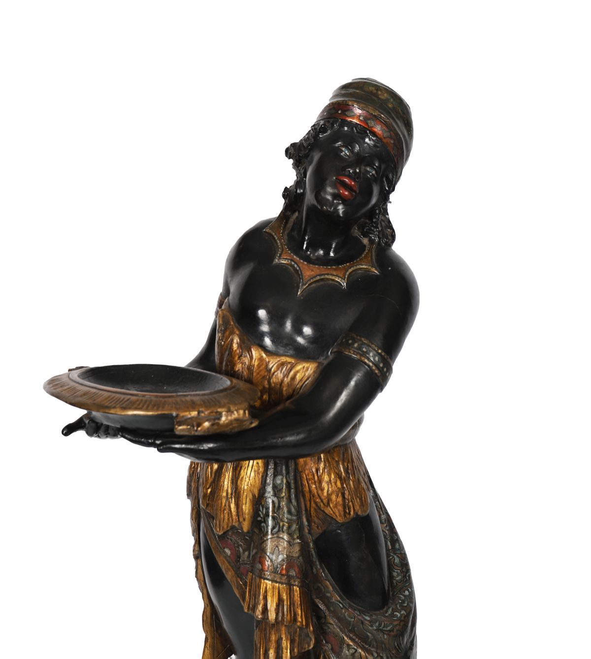 A large 19th-century carved and painted giltwood Blackamoor figure, modelled standing and holding a serving tray, dressed in draped gilt robes and turban, raised on an octagonal plinth base. Finely detailed and of impressive scale.