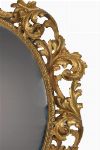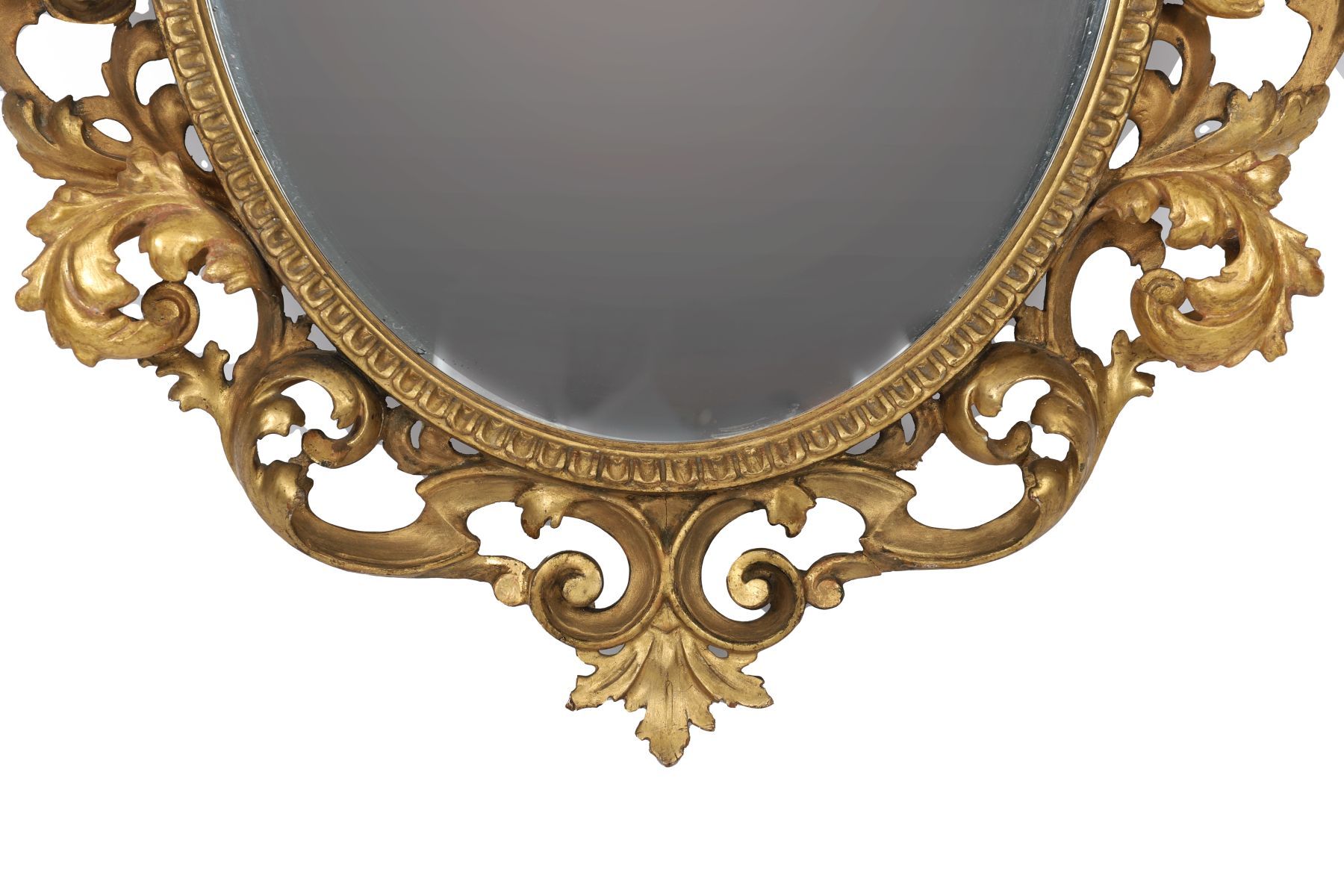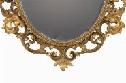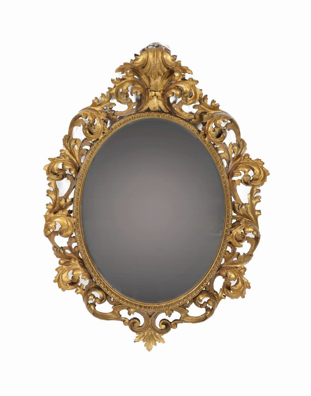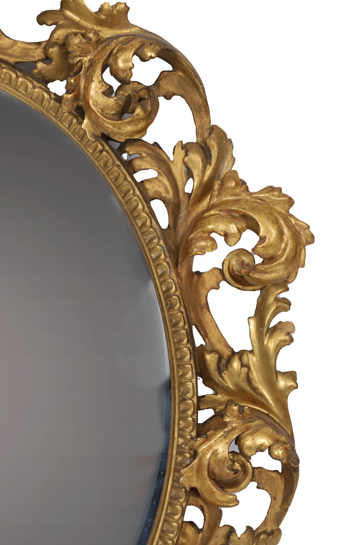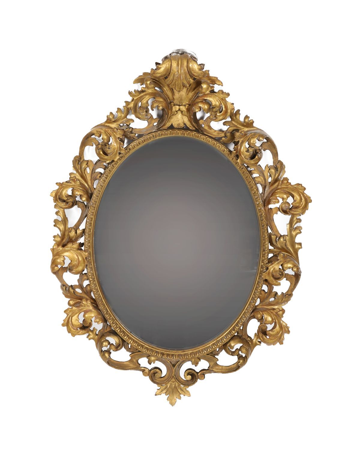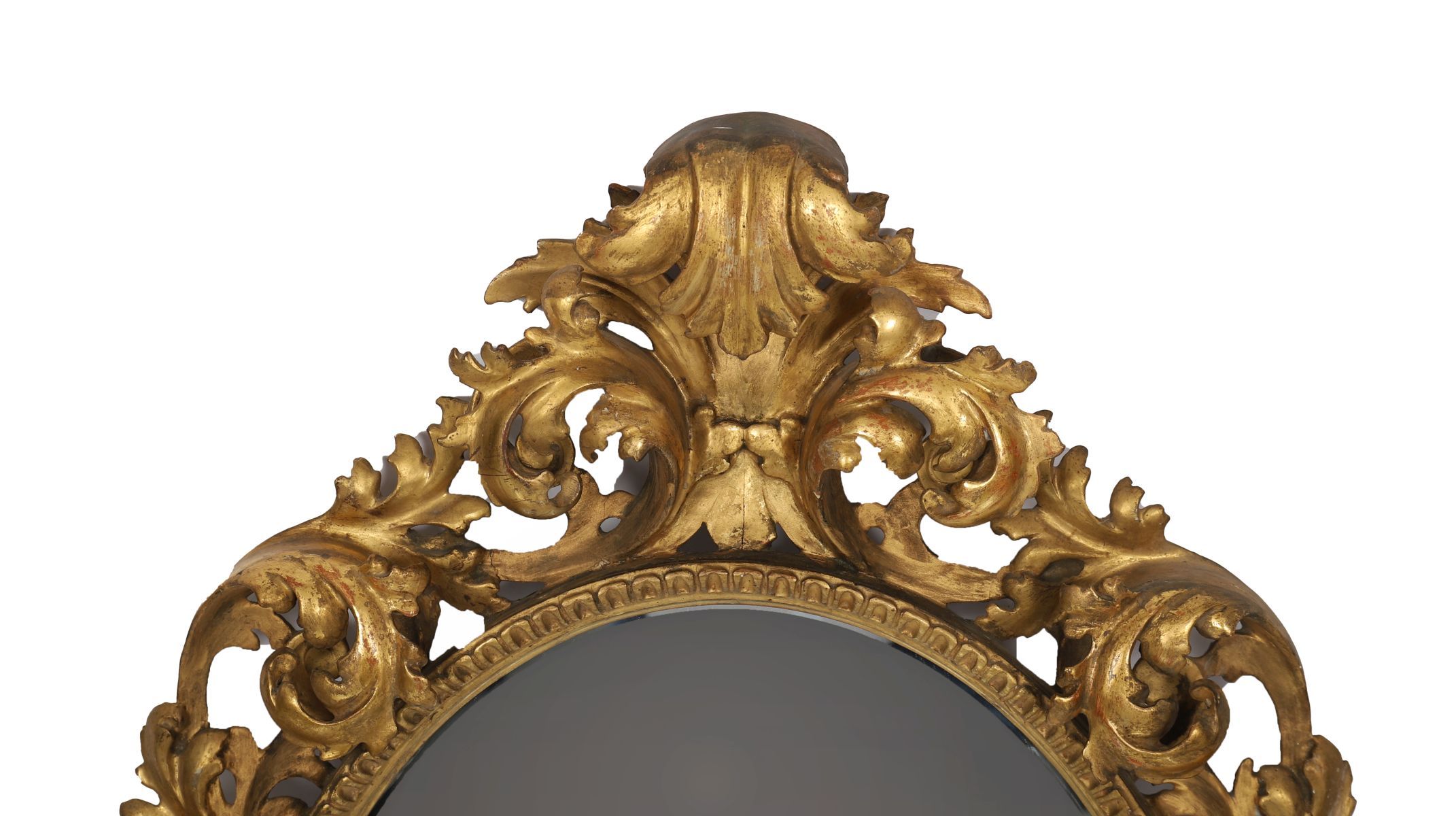 A fine 19th-century oval mirror within a richly carved giltwood frame, the surround elaborately detailed with scrolling acanthus leaves, shell and foliate motifs, and a central cresting leaf.