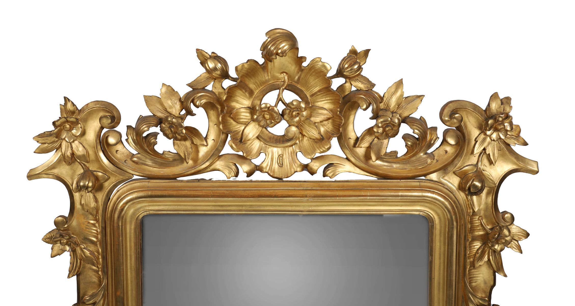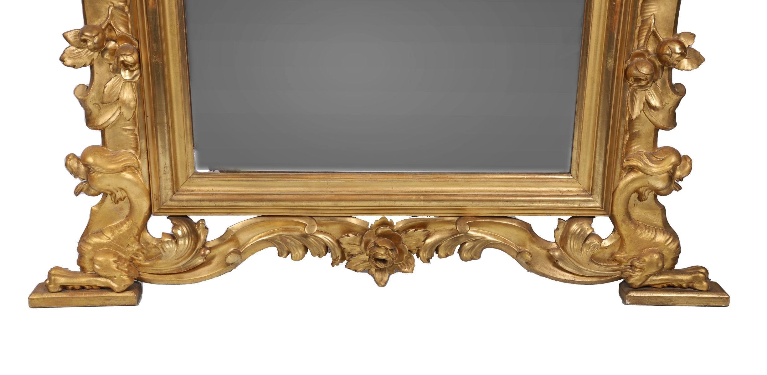 A 19th-century carved giltwood overmantel mirror, the rectangular plate within a richly carved frame surmounted by a floral cresting and scrolling acanthus decoration. The sides and base adorned with intricate foliate motifs and stylised dolphin feet. Retaining its original gilded finish with a warm, mellow patina.