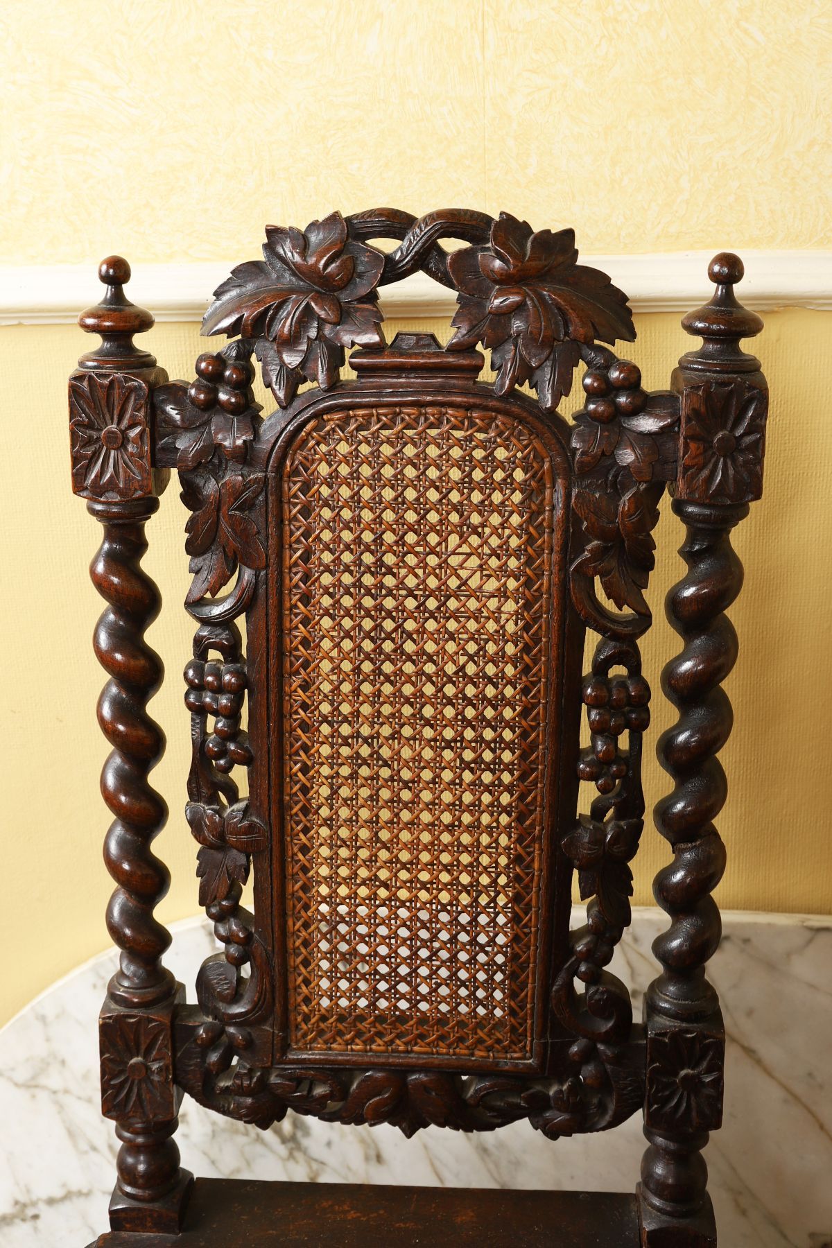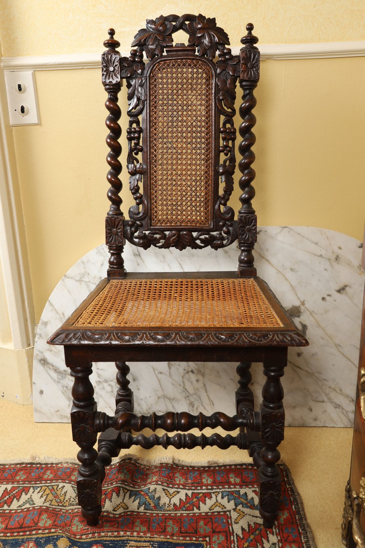 With foliate-carved cresting above a cane panel back and seat, raised on turned supports.