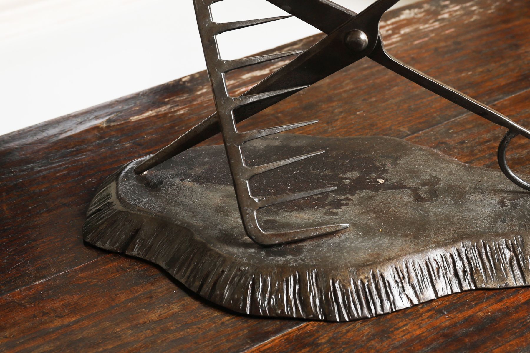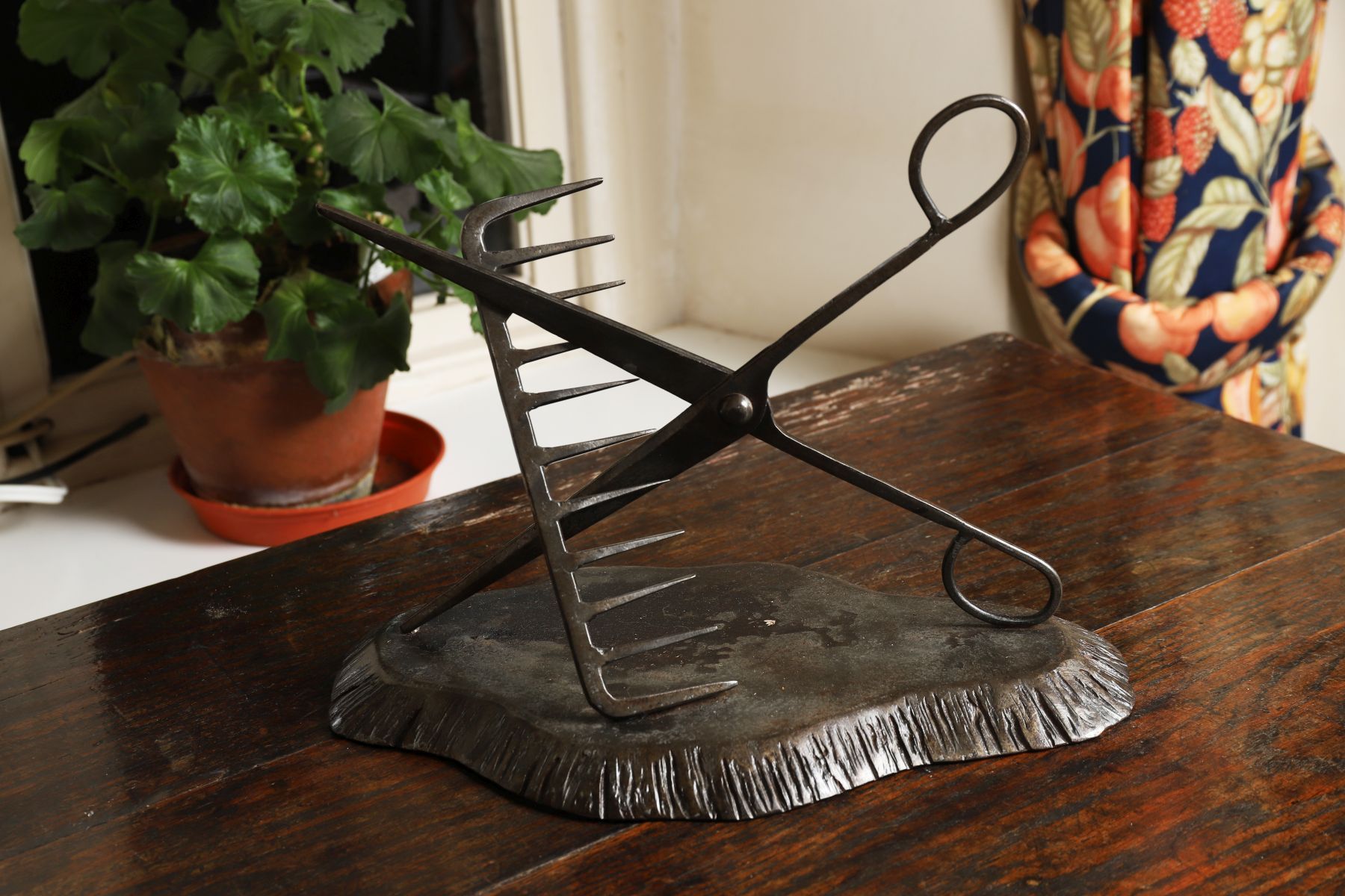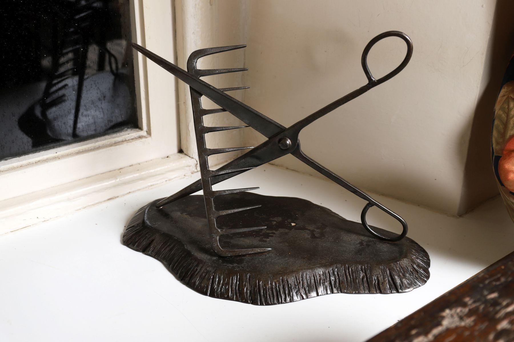 A 19th-century cast iron hairdresser’s trade sign or logo, formed as crossed scissors and comb, mounted on a shaped cast base with textured finish. 19th century.
