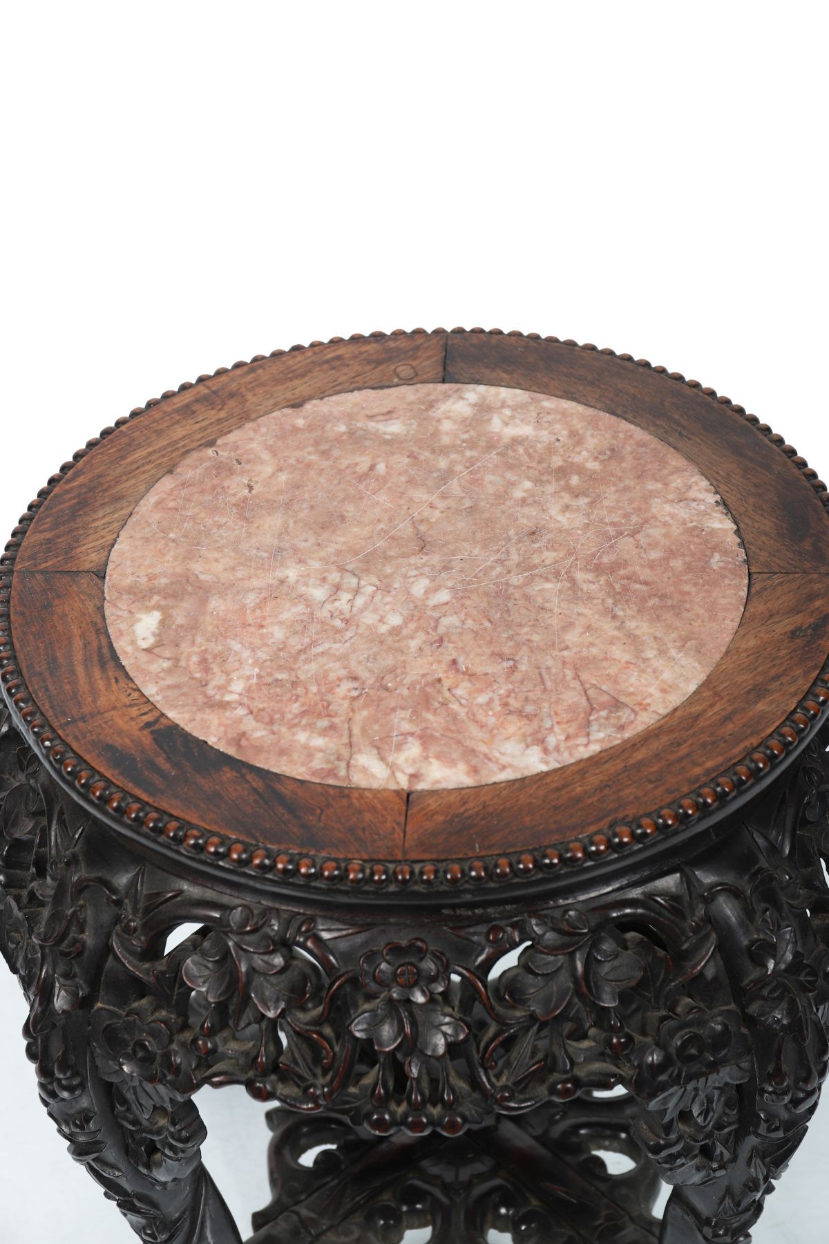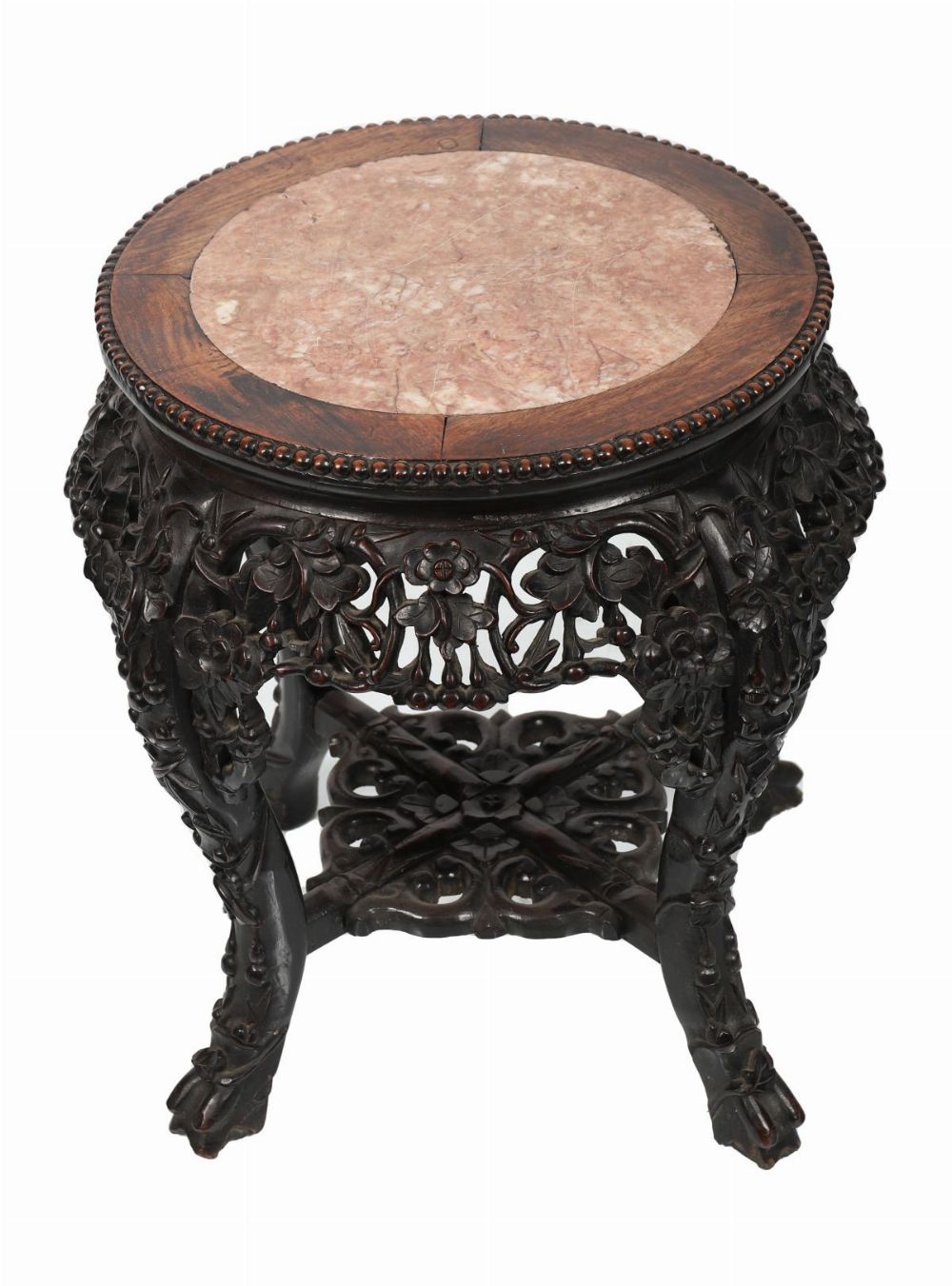 A further 19th-century Chinese pedestal, carved throughout with foliate and scroll ornament, the circular top supported on shaped legs united by carved stretchers. Chinese, 19th century.