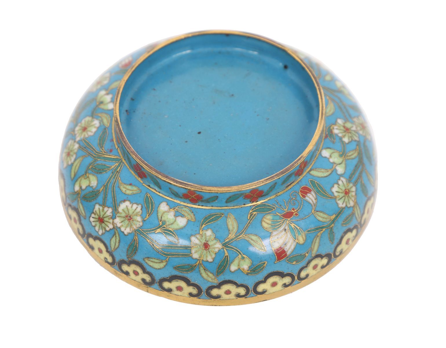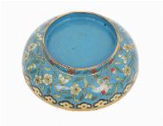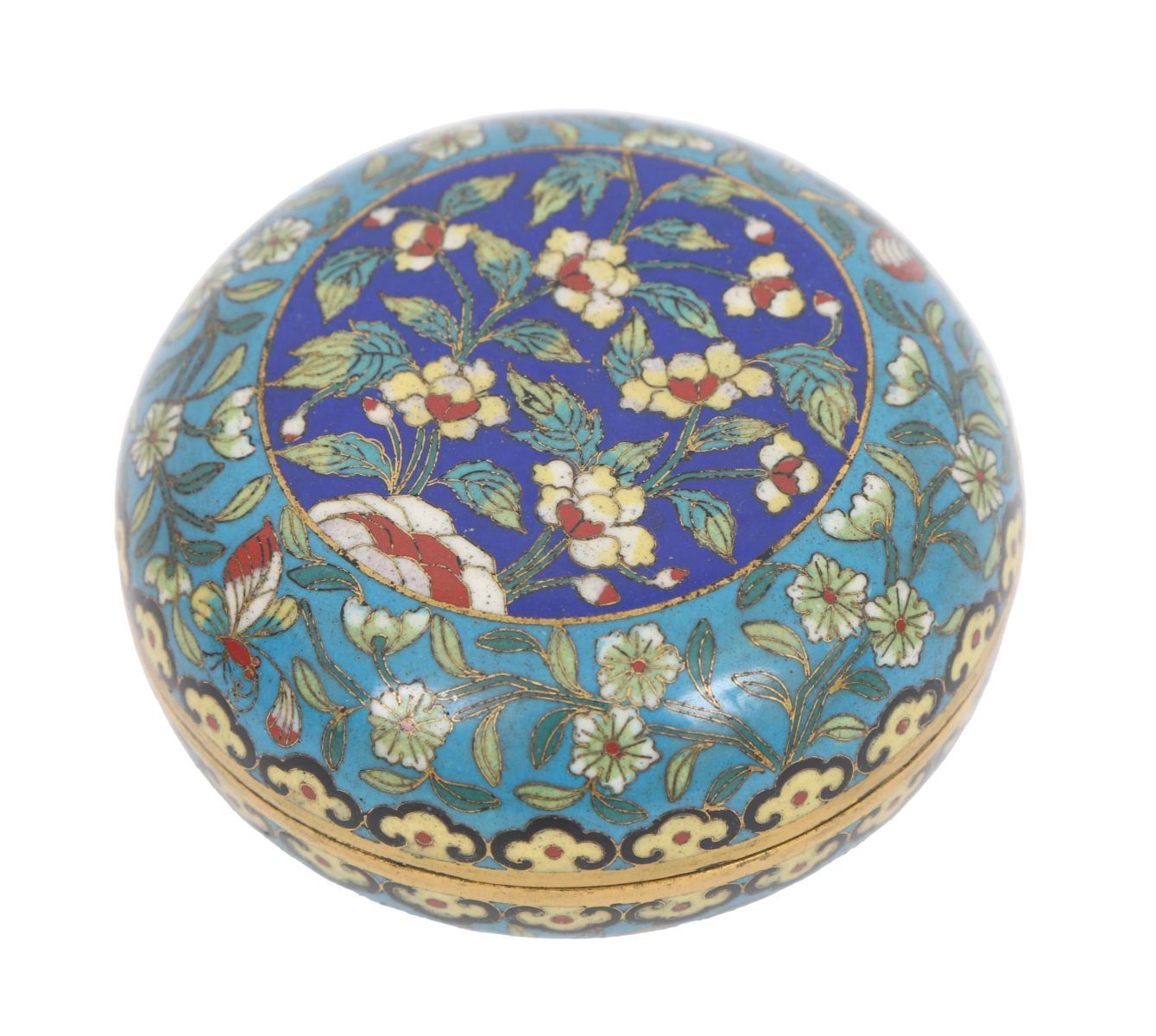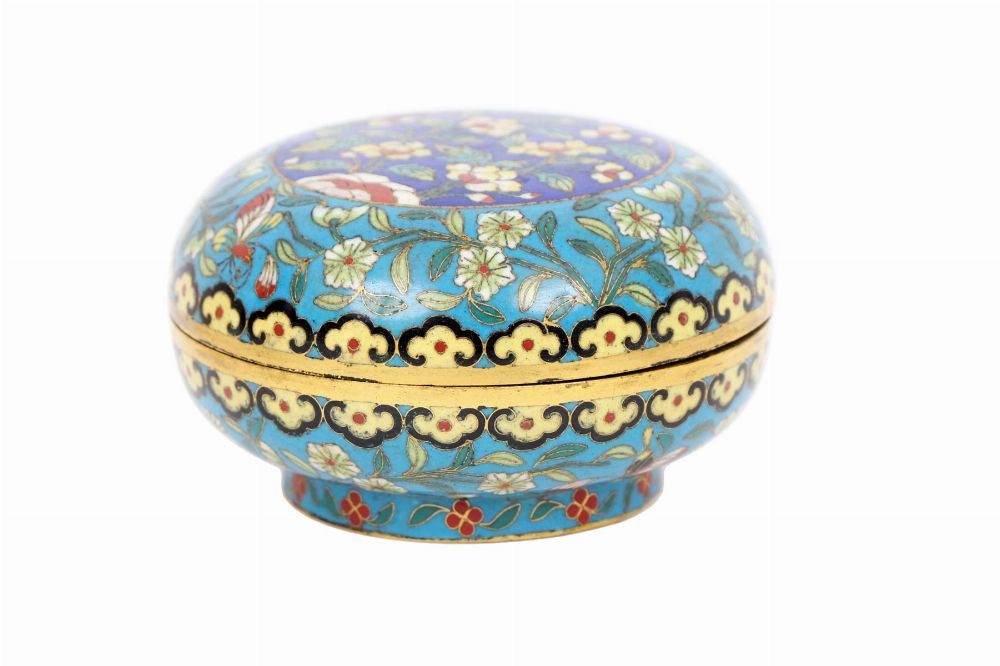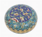 A 19th-century Chinese cloisonné box of circular form, decorated with flowers and butterflies on a blue ground with gilt highlights.