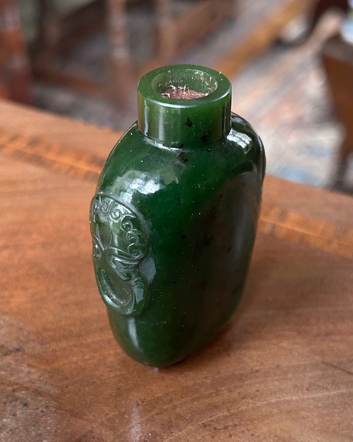 A Chinese snuff bottle carved from green jade, 19th century, of flattened ovoid form with carved relief decoration, the stone showing natural tonal variations.