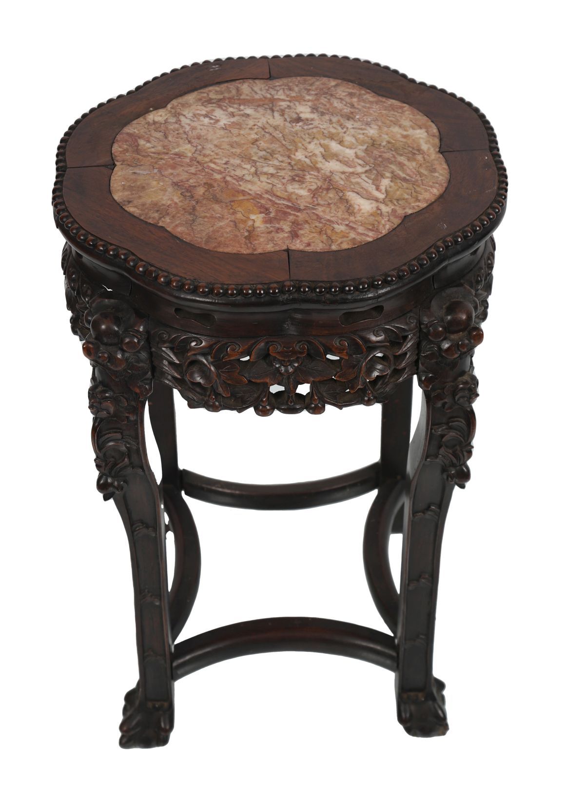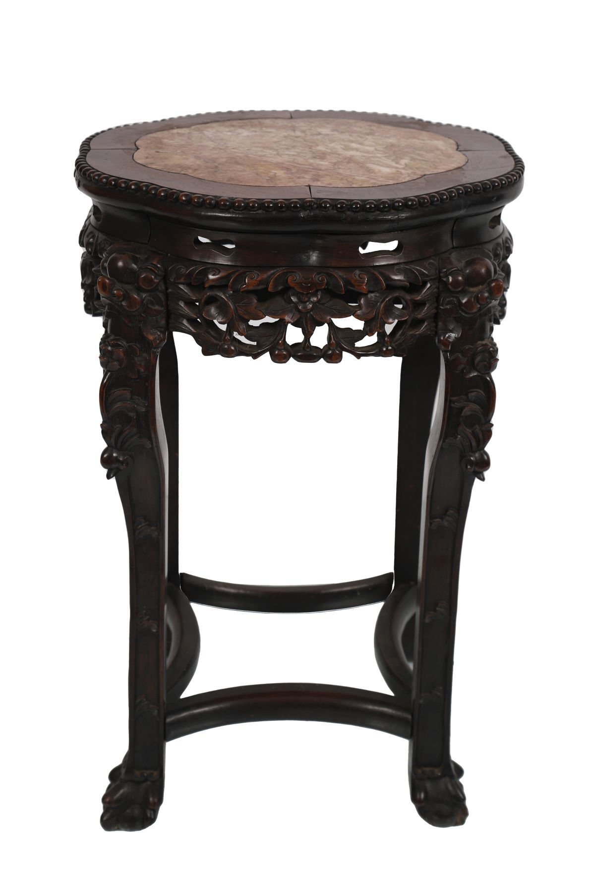 19th-century Chinese hardwood stand, the circular top above shaped aprons and curved supports, raised on a conforming base with stretchers.