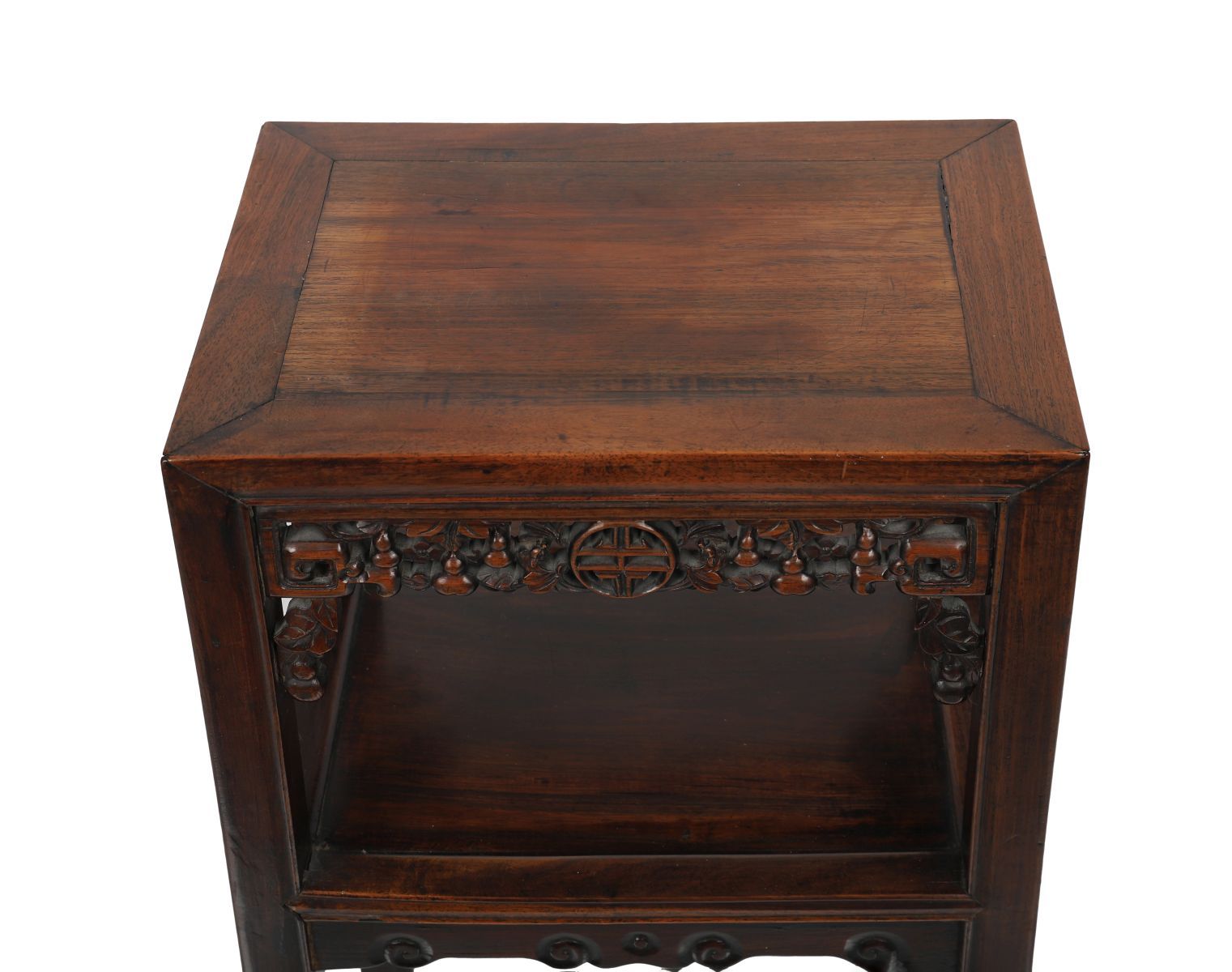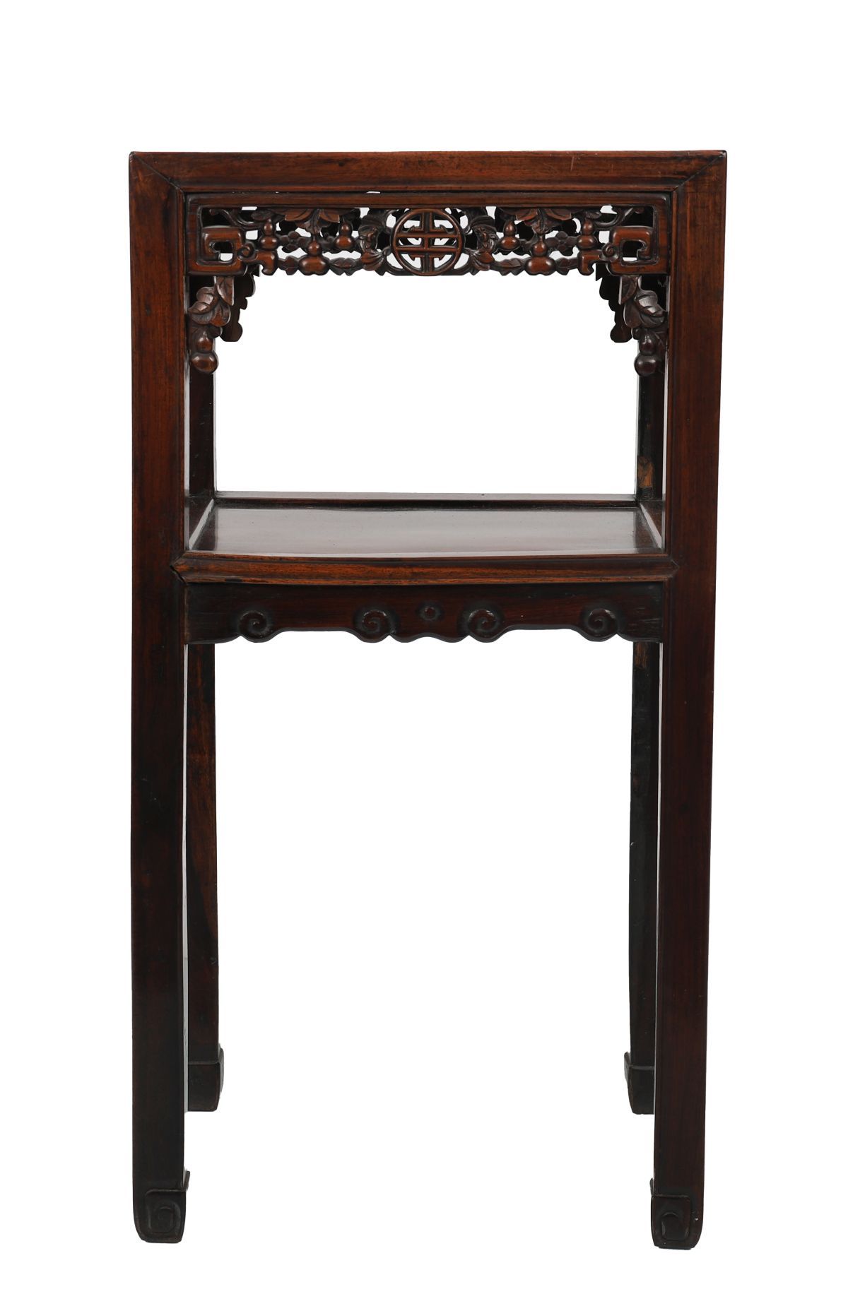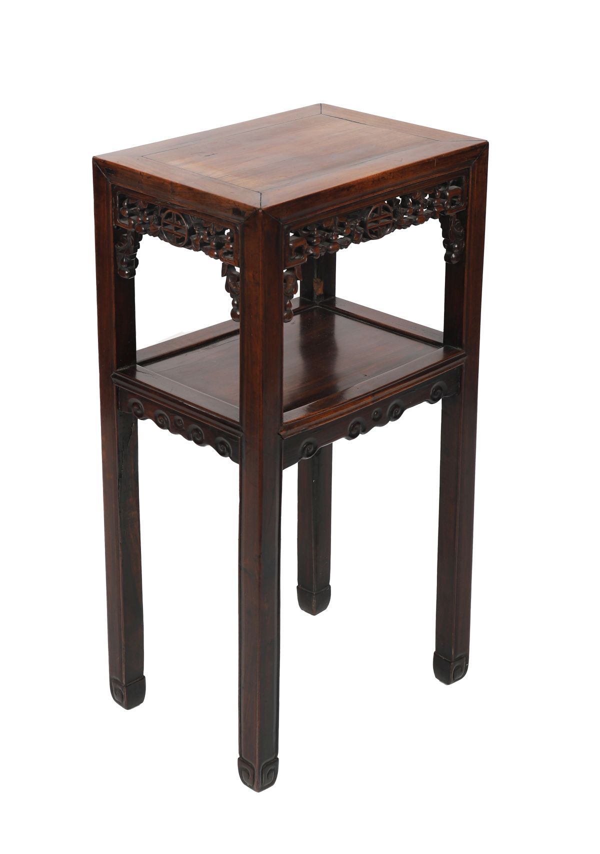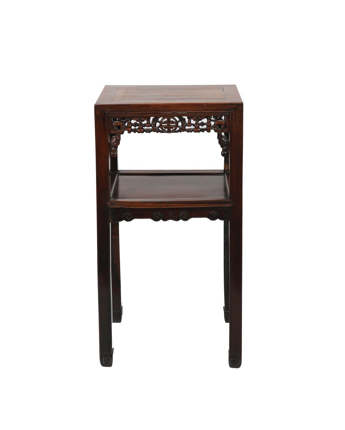of rectangular form with pierced shou centred frieze raised on square scroll legs joined by an undershelf.