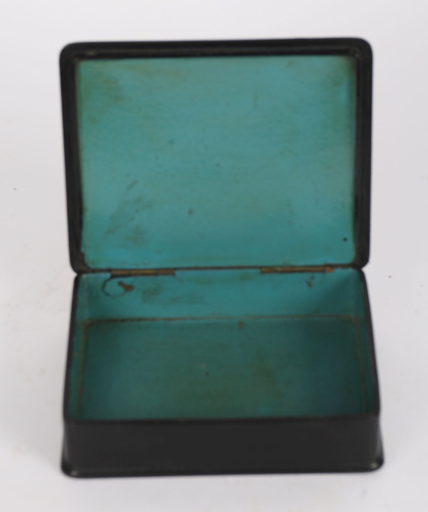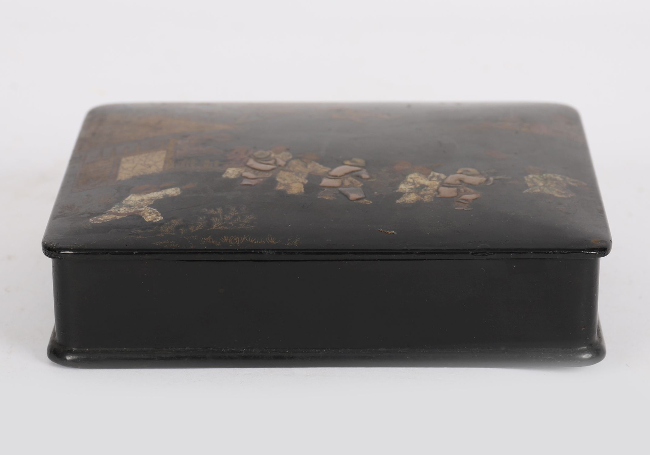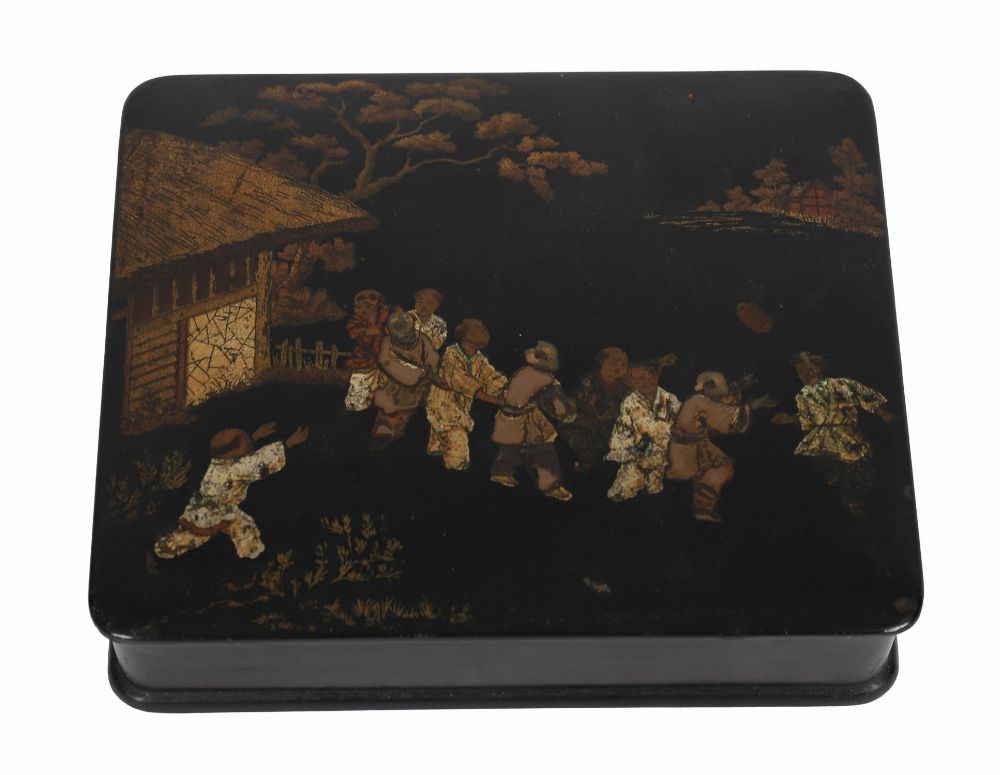 A rectangular black lacquered wooden box, the hinged lid decorated with a gilt and polychrome figural scene of children playing in an outdoor setting with architecture and trees in the background. The sides with further gilt foliate detail.