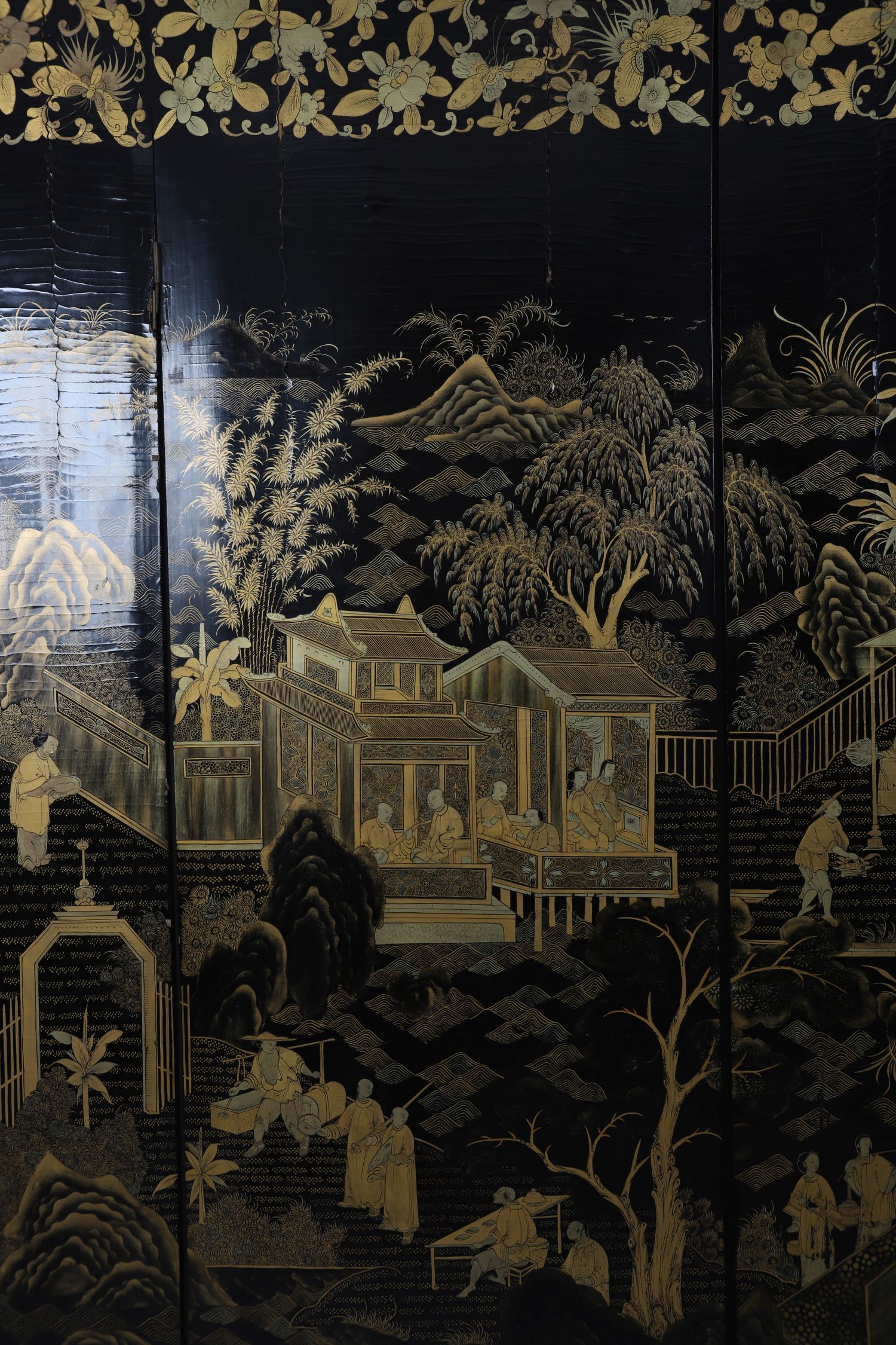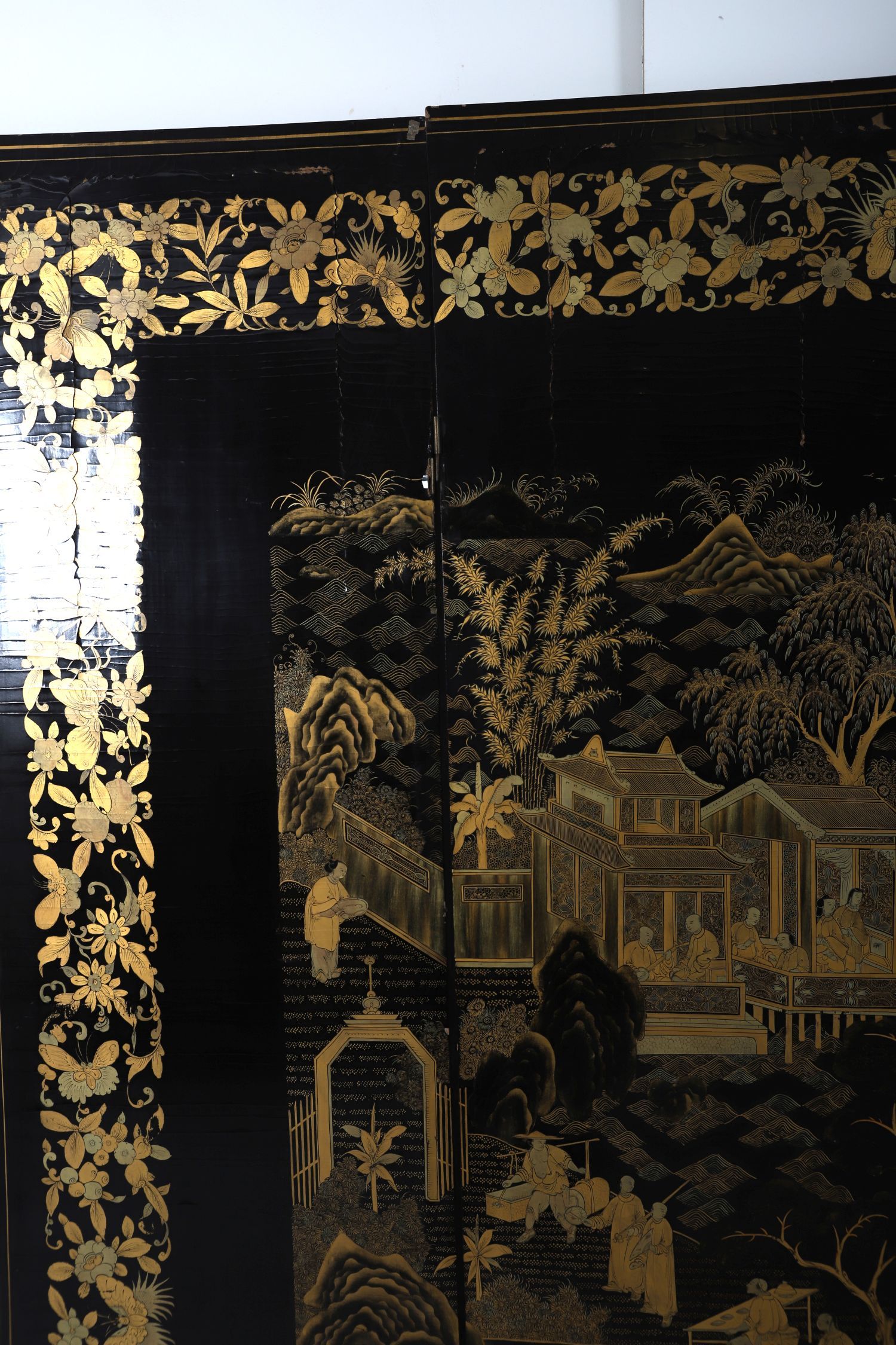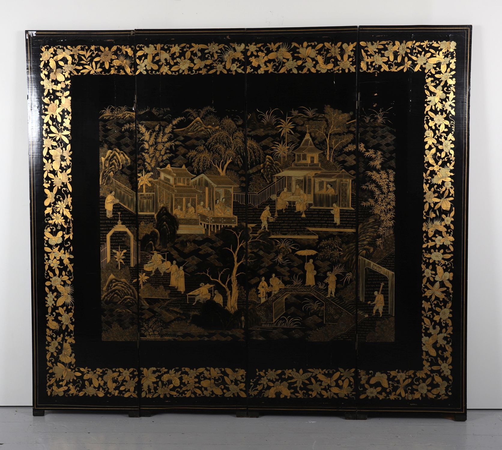 A monumental four-panel black lacquer screen, each panel painted and gilt with elaborate figural and architectural scenes in landscapes, including pavilions, scholars, attendants, and calligraphic inscriptions. Borders with scrolling floral and avian decoration.