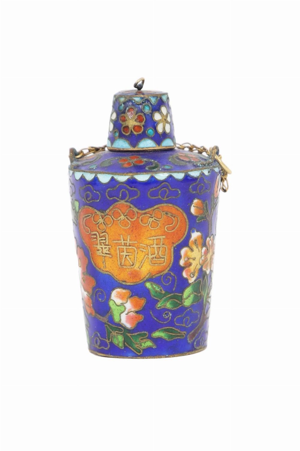 A 19th-century Chinese cloisonné enamel snuff bottle, decorated with floral sprays on a deep blue ground, the body with gilt wire outlines and fitted with a matching stopper, inscribed cartouche.