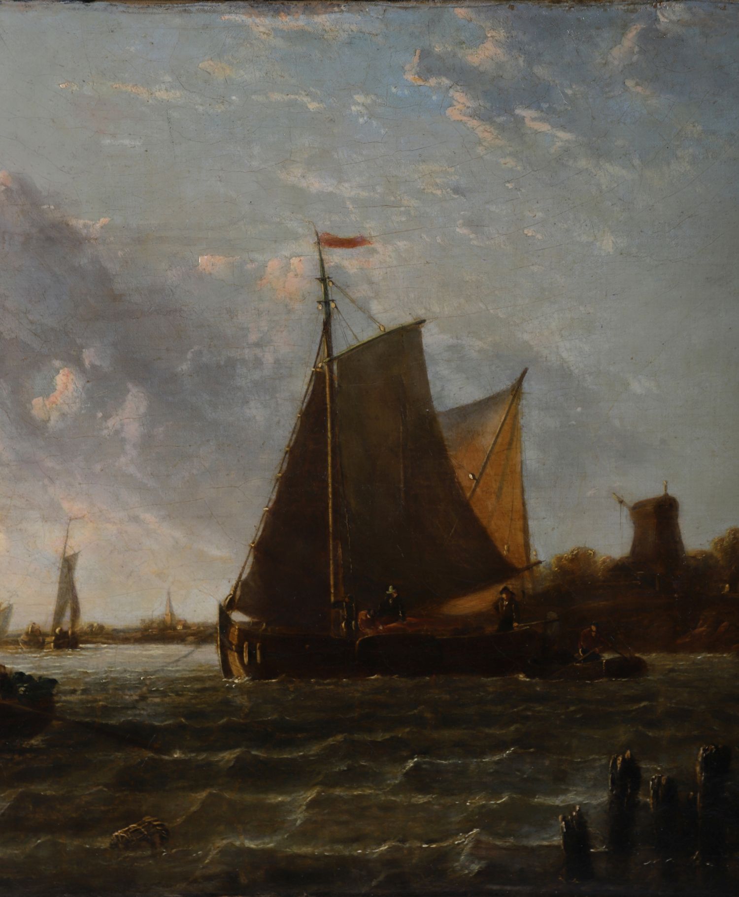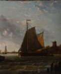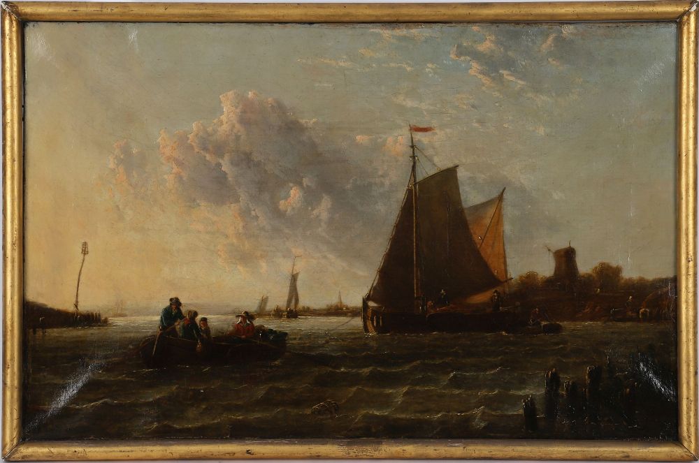 A finely rendered marine scene showing boats and figures against a cloudy coastal backdrop. Attributed to Irish marine artist Edwin Hayes.