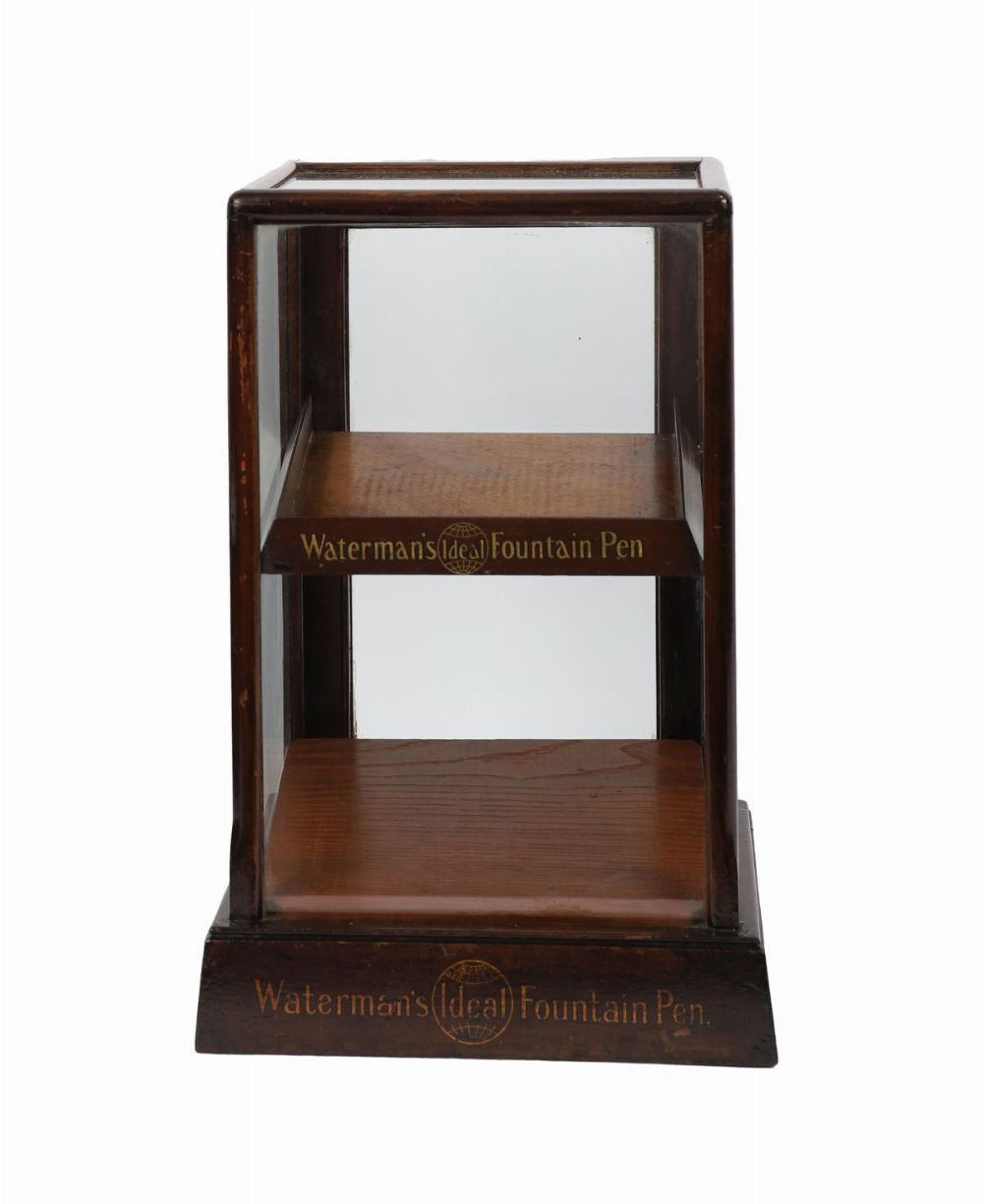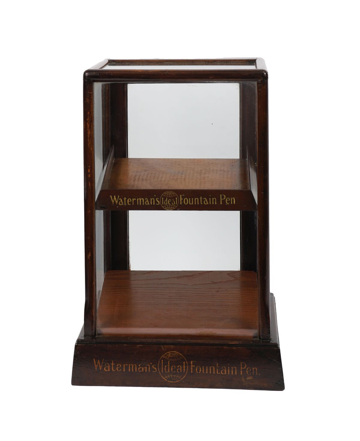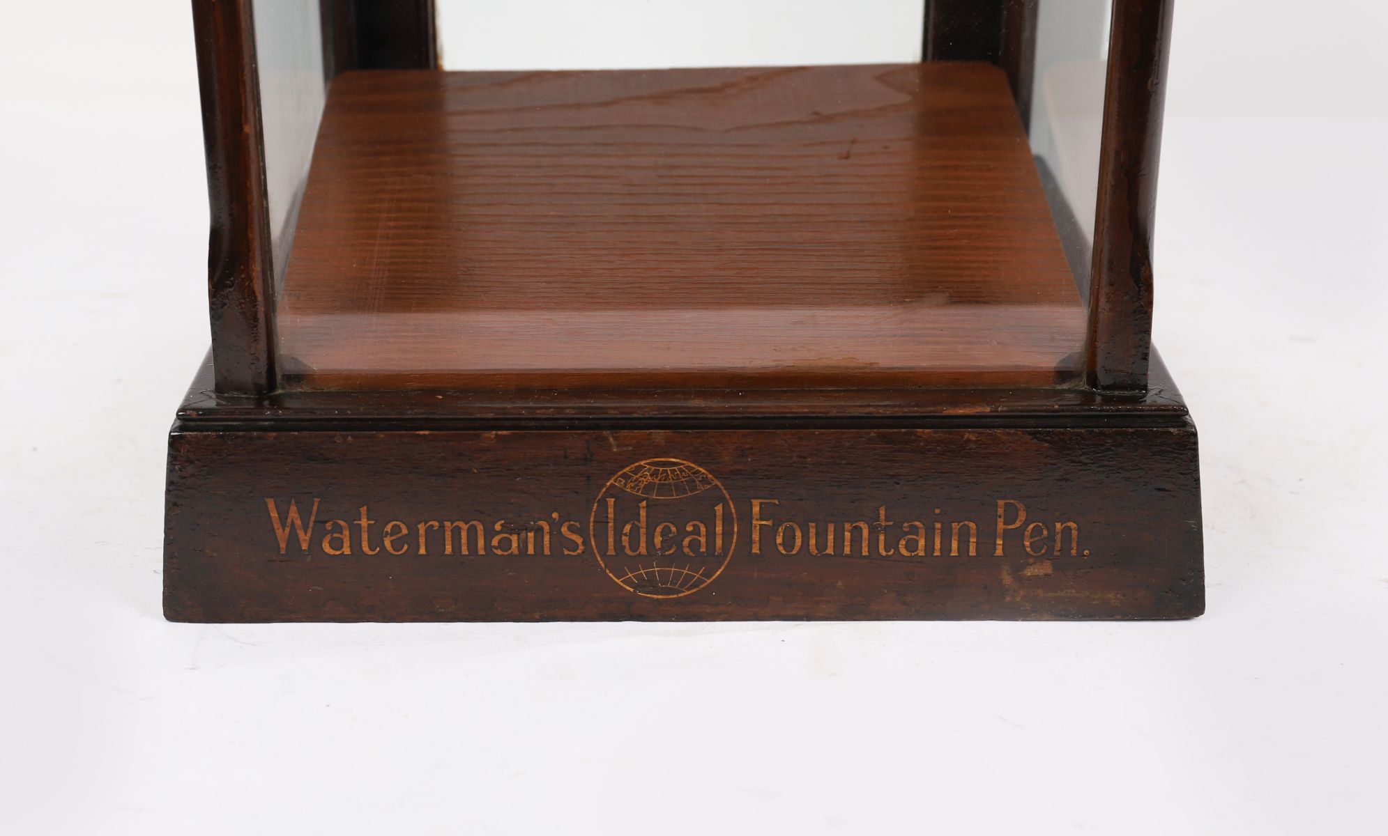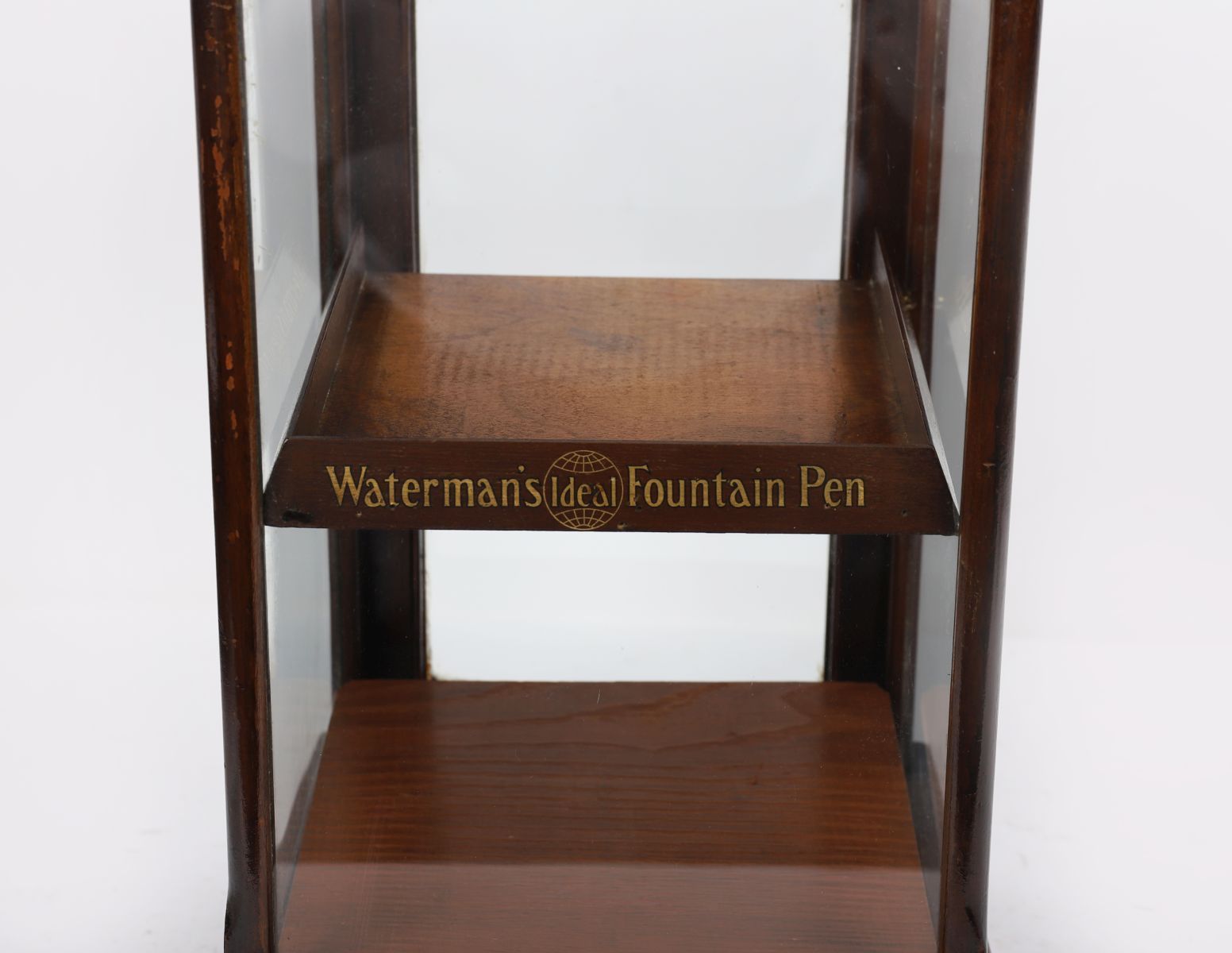 A 19th-century advertising display case for Waterman’s Ideal Fountain Pen, the mahogany and glass cabinet with gilt lettering and glazed panels on all sides, fitted with an internal shelf.