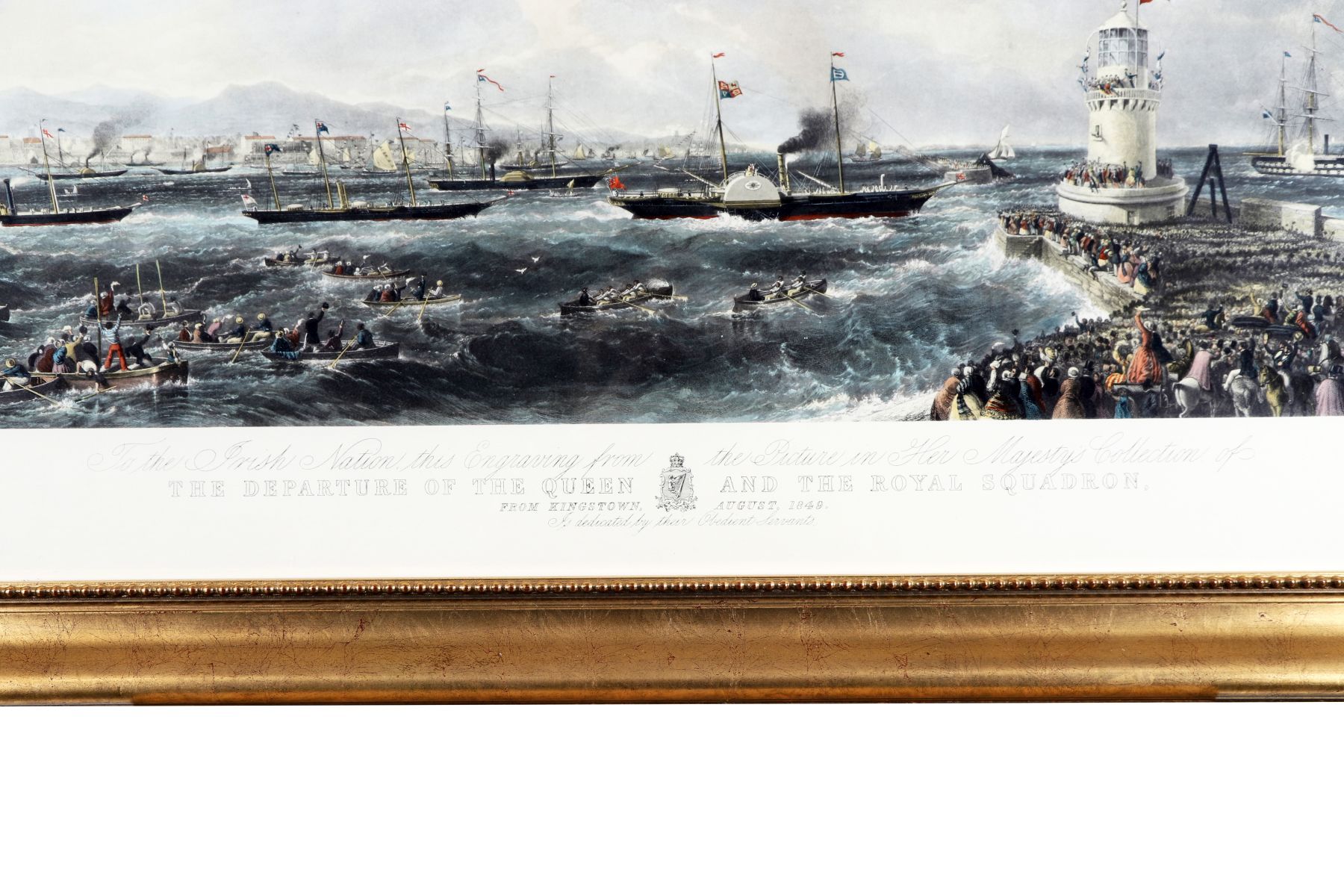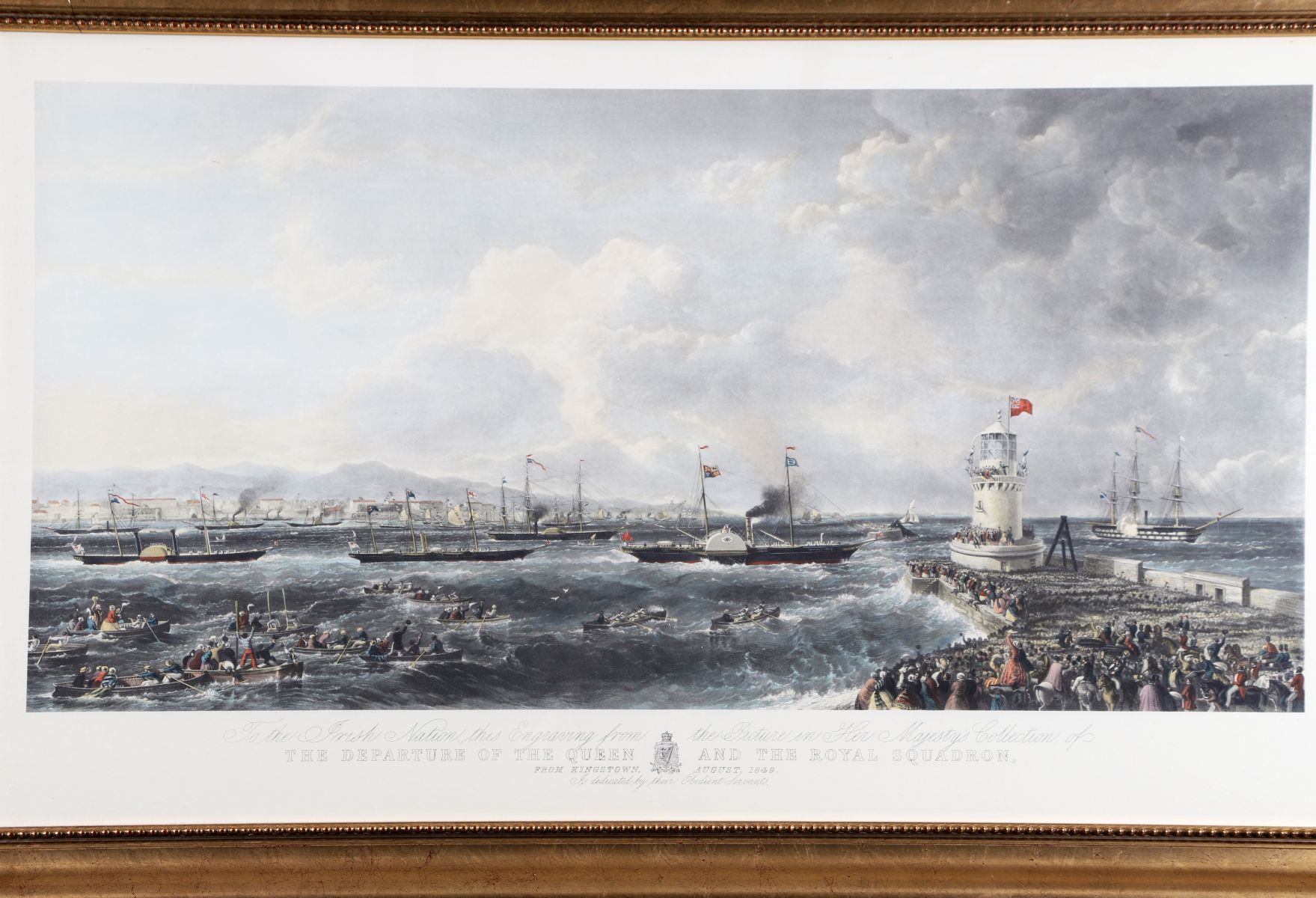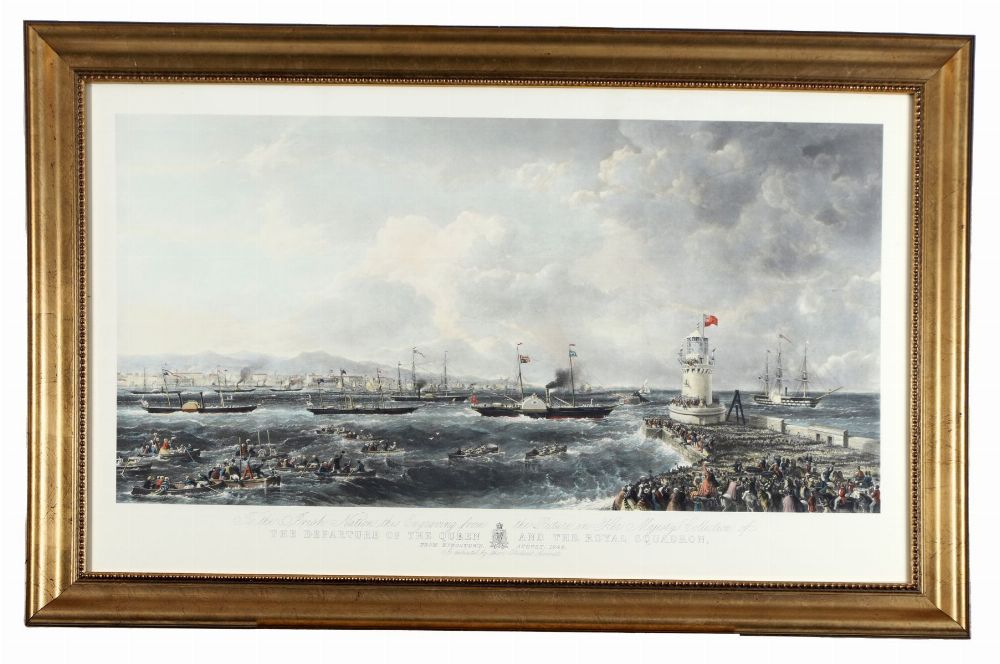 "The Departure of the Queen and the Royal Squadron from Kingstown, August 1849" A historical scene depicting the royal departure, enclosed in a gilt frame.