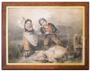 a humorous rural scene, hand-coloured and framed.