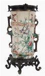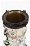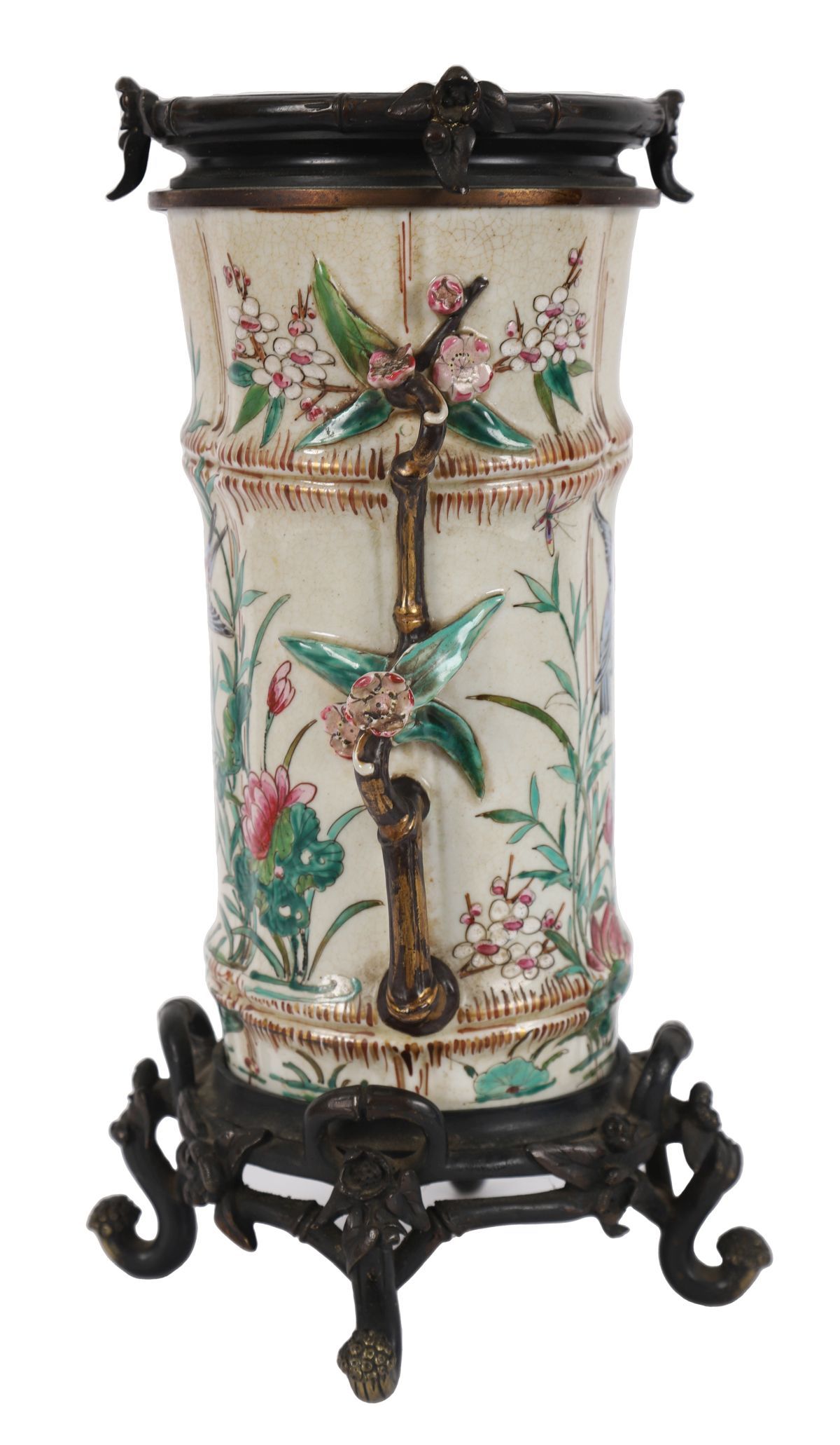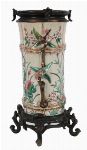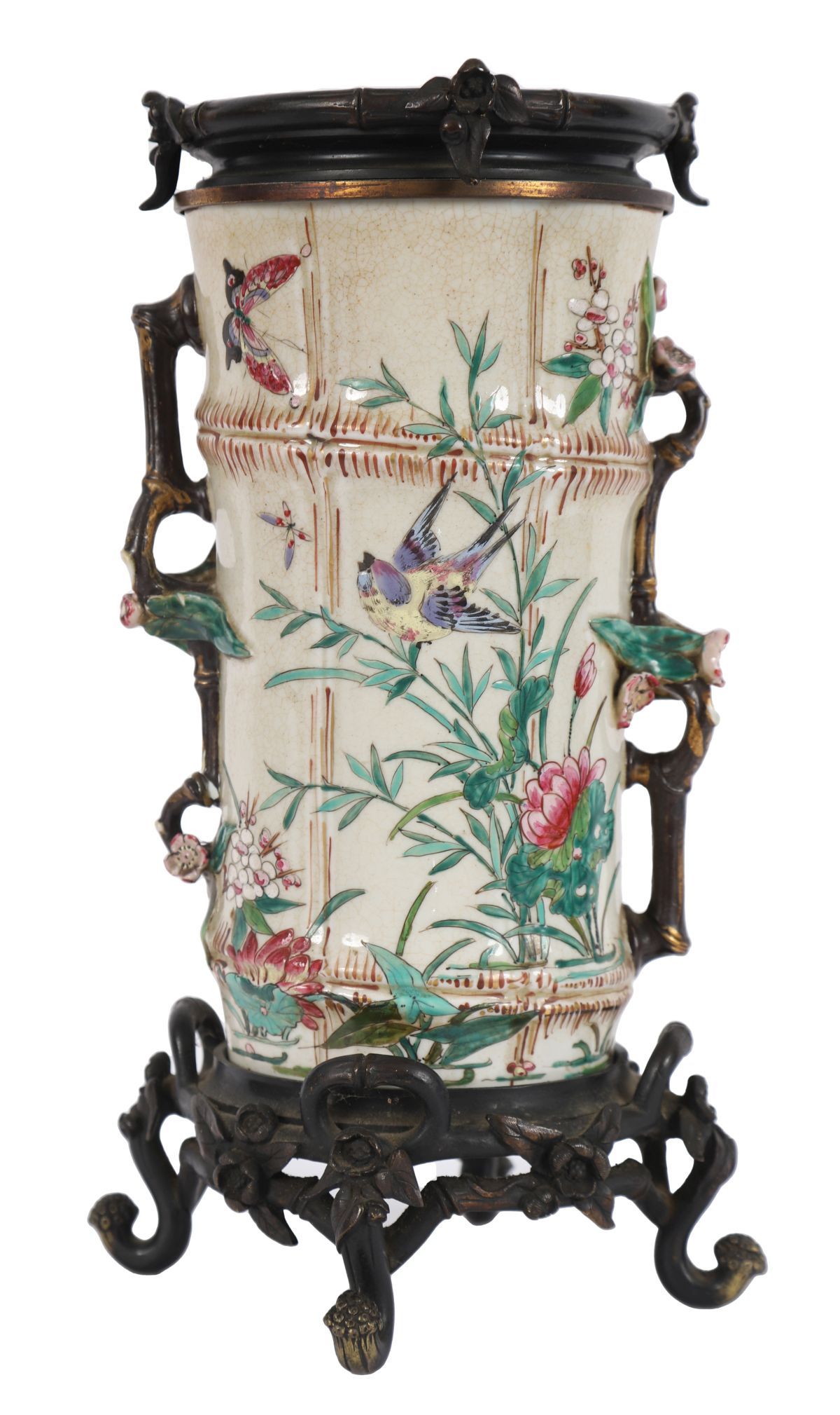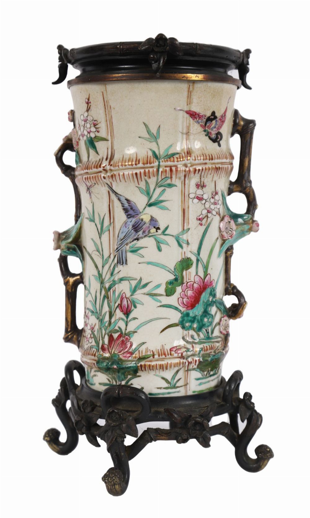 A ceramic vase decorated with birds, butterflies, and blossoms, set in an ornate bronze mount.