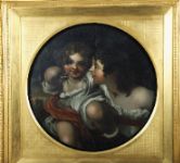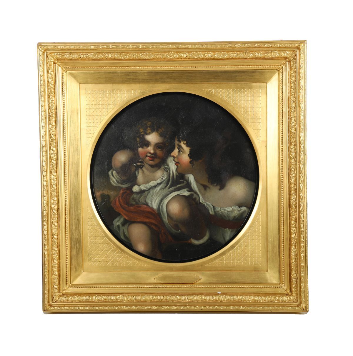 A charming 19th-century oil on canvas depicting two young children, one gazing affectionately toward the other, set against a dark background. The composition is enclosed within a circular reserve and presented in an ornate giltwood frame with engine-turned detailing.