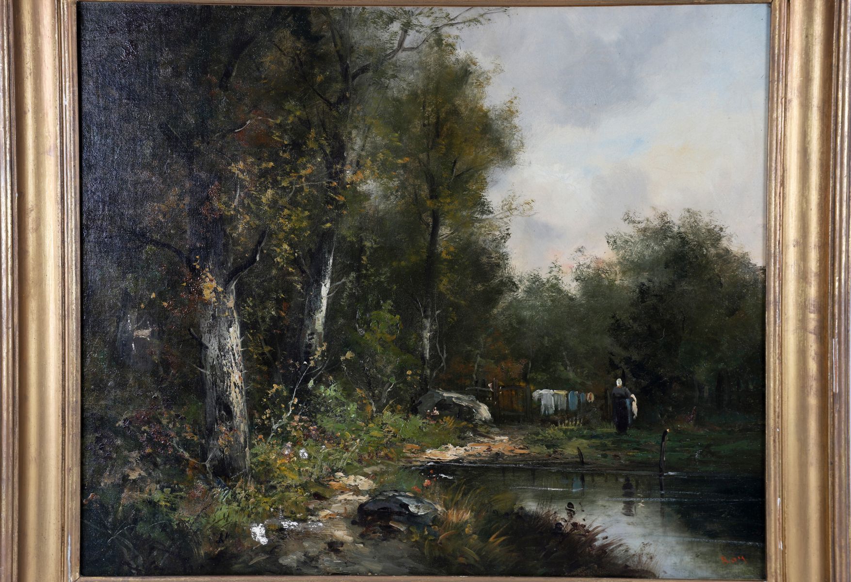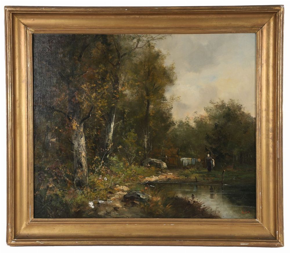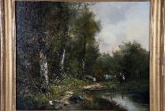 A pair of 19th-century Continental School landscapes, each depicting wooded river scenes with figures and livestock, oil on canvas, signed lower right. Enclosed in a gilt frames.