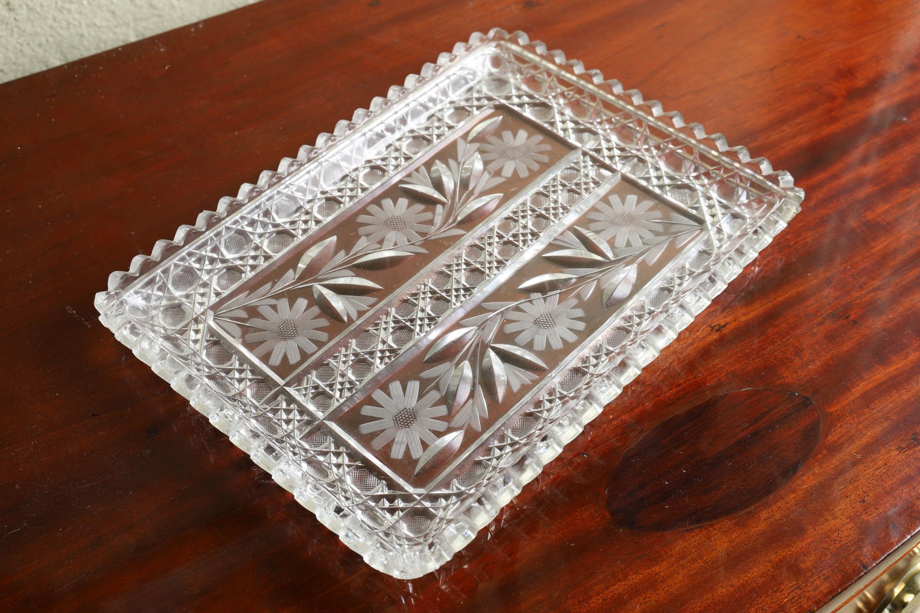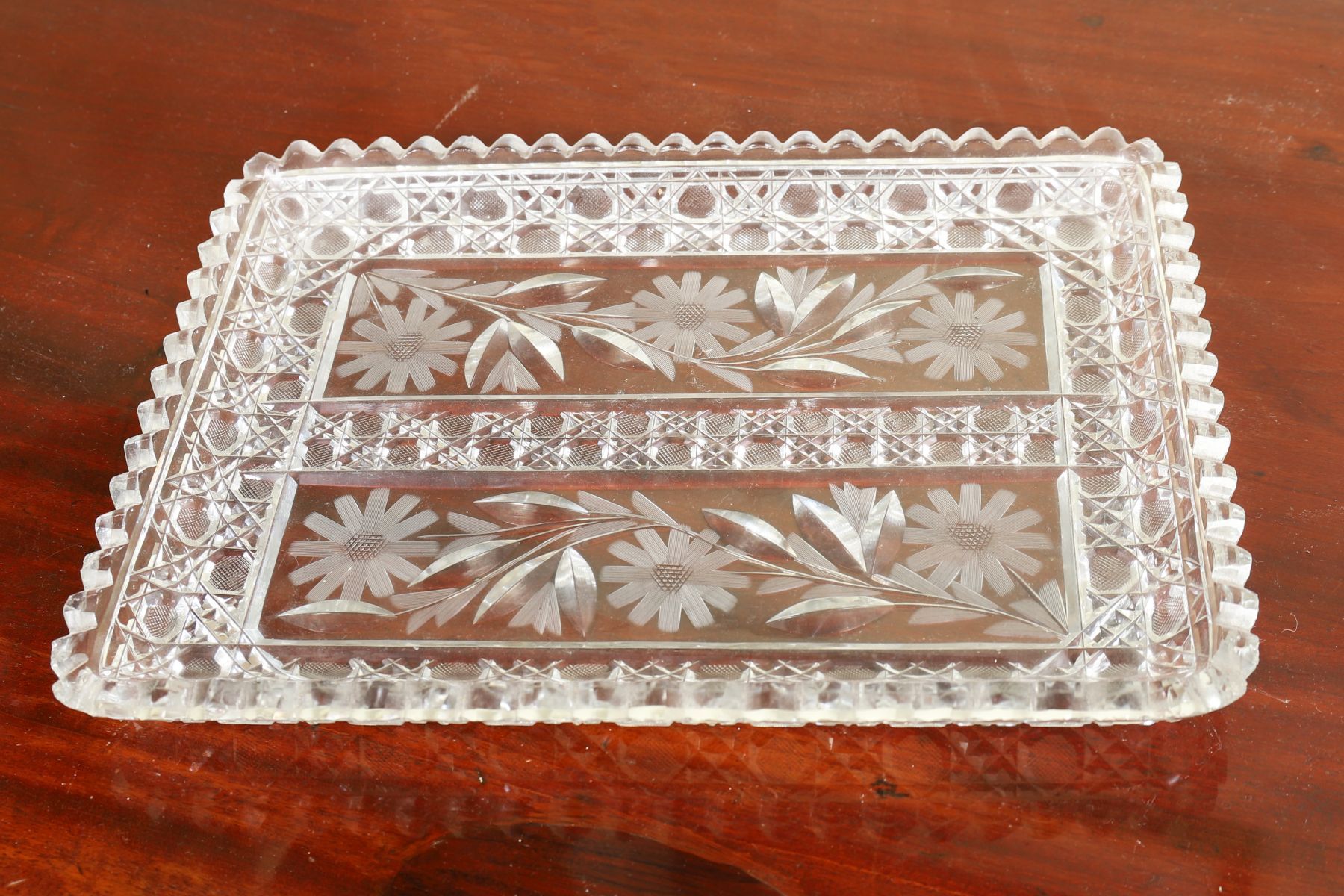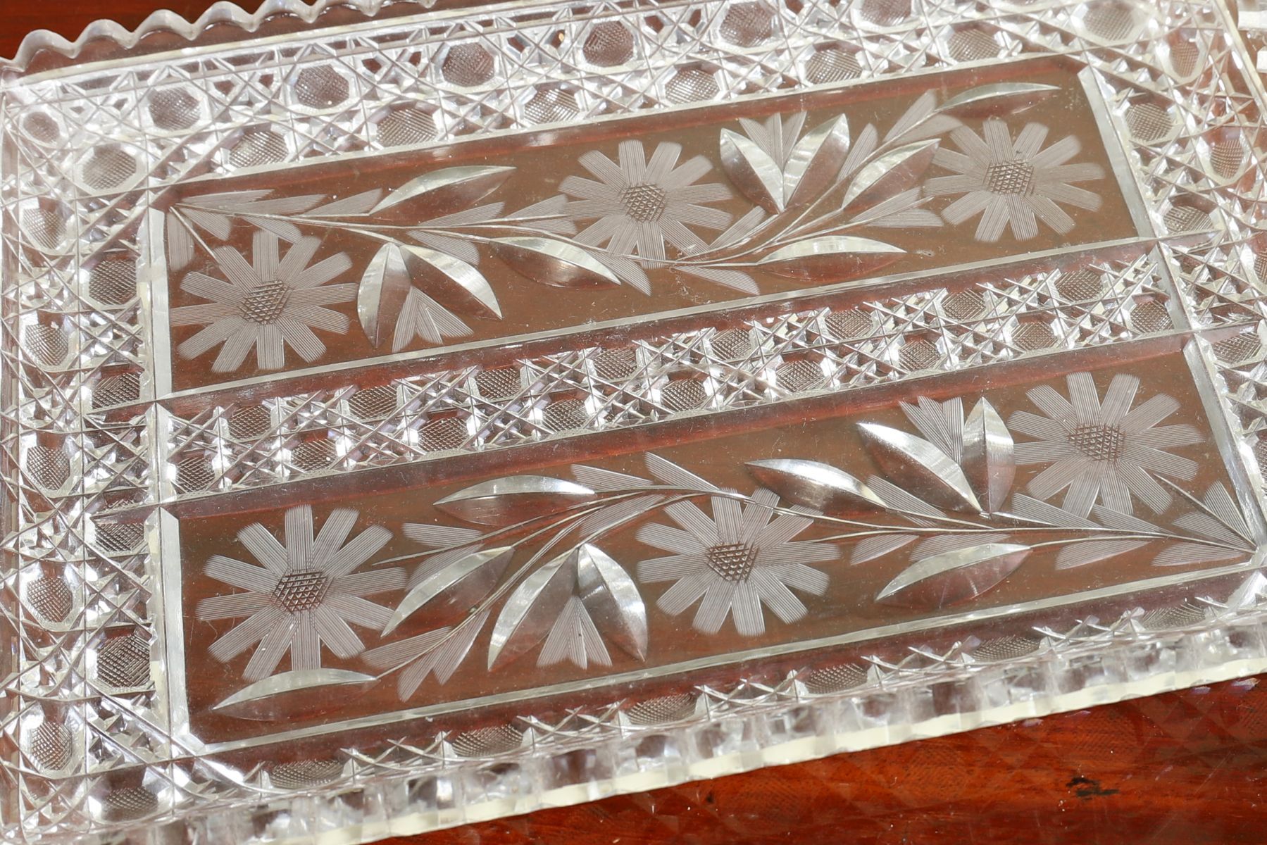 A 19th-century crystal cut-glass jewellery platter of rectangular form, richly cut with floral and geometric motifs, the scalloped rim enclosing a divided interior.
