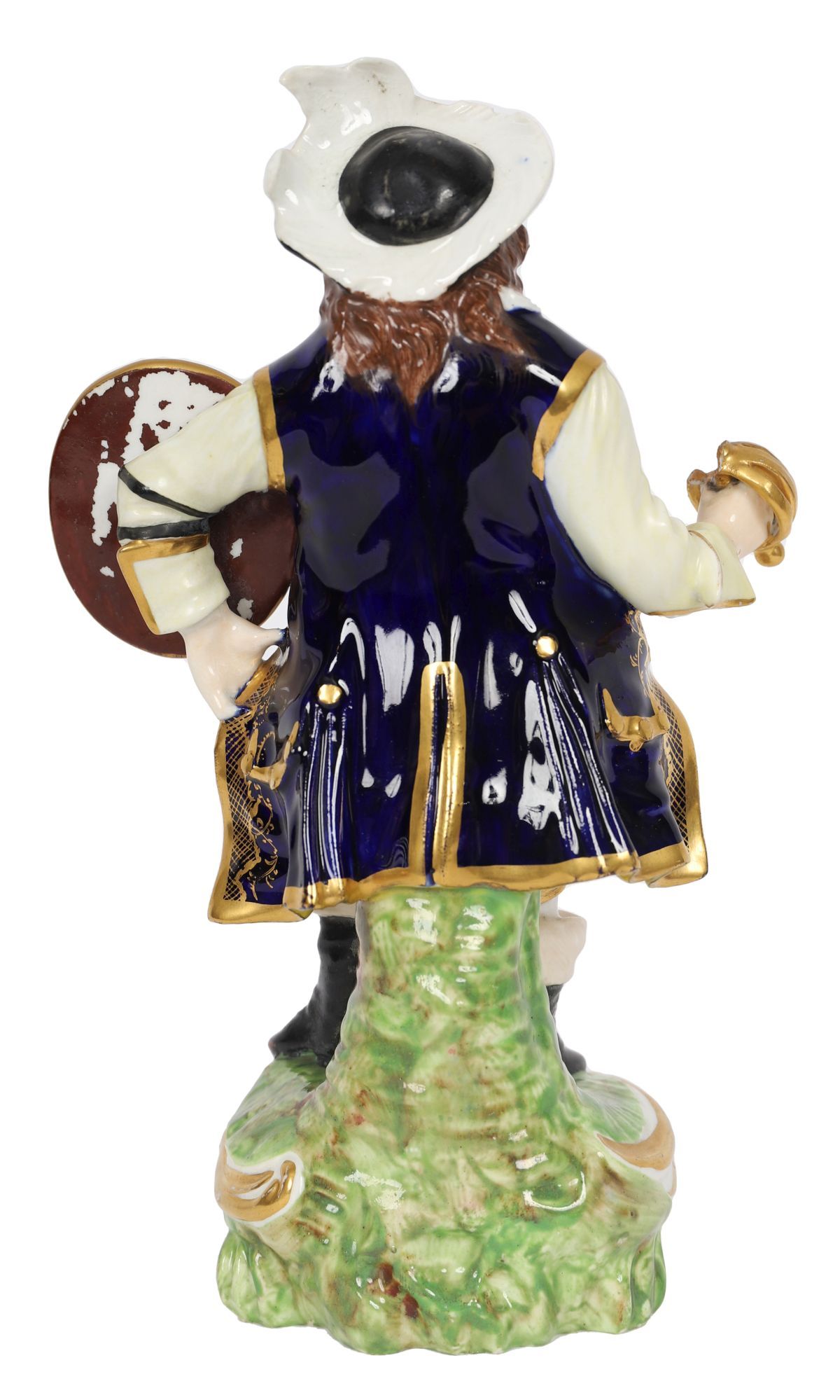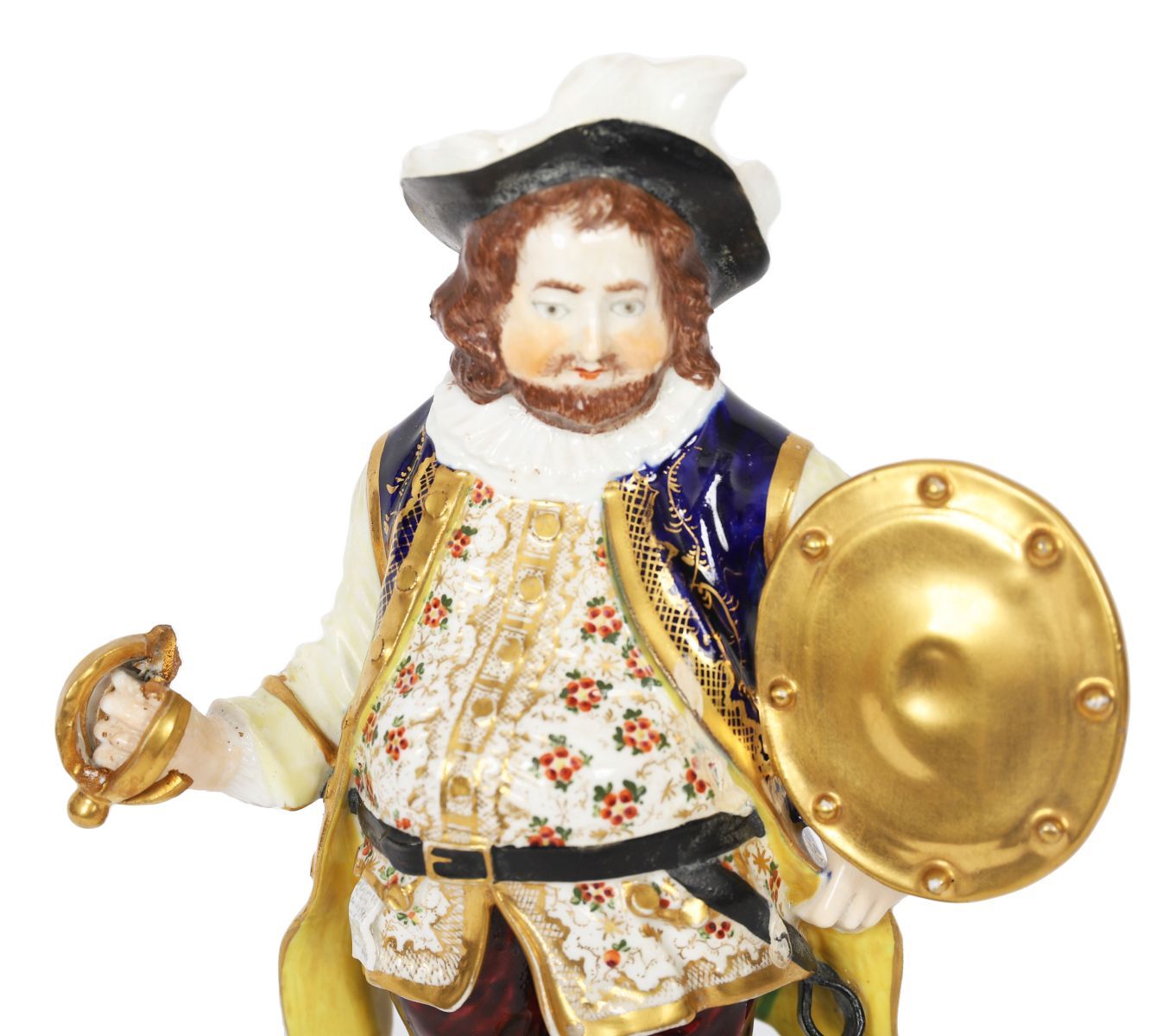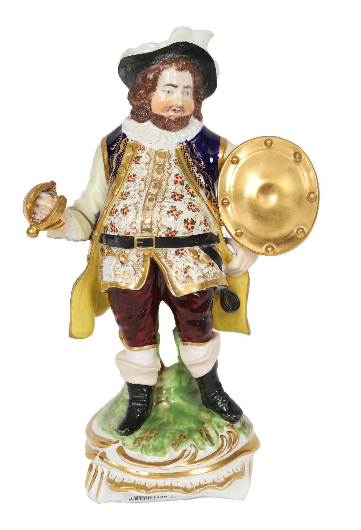 A 19th-century Derby porcelain figure of a gentleman in 17th-century dress, modelled standing and holding a shield and sword, finely painted and gilt, raised on a shaped base.