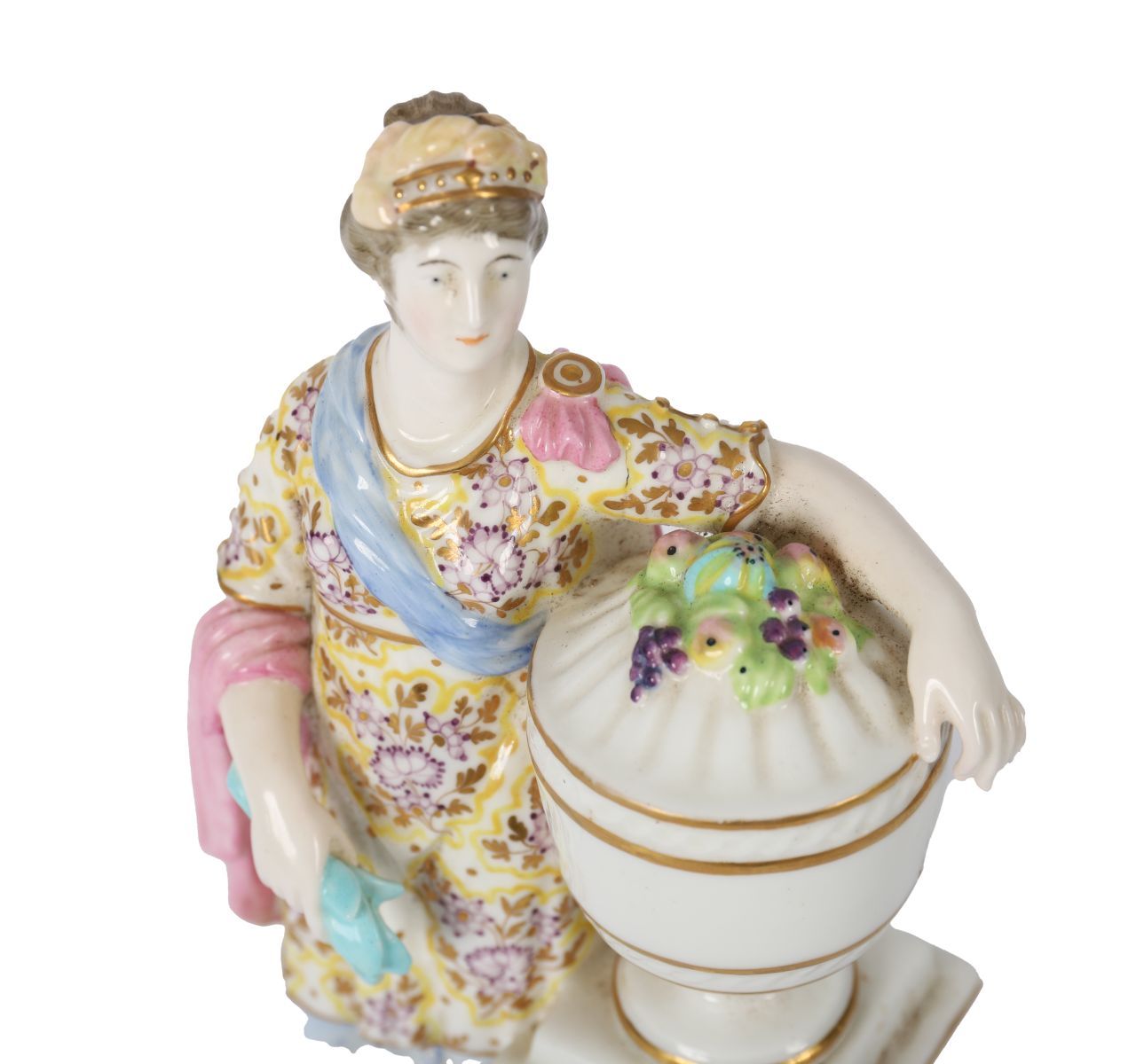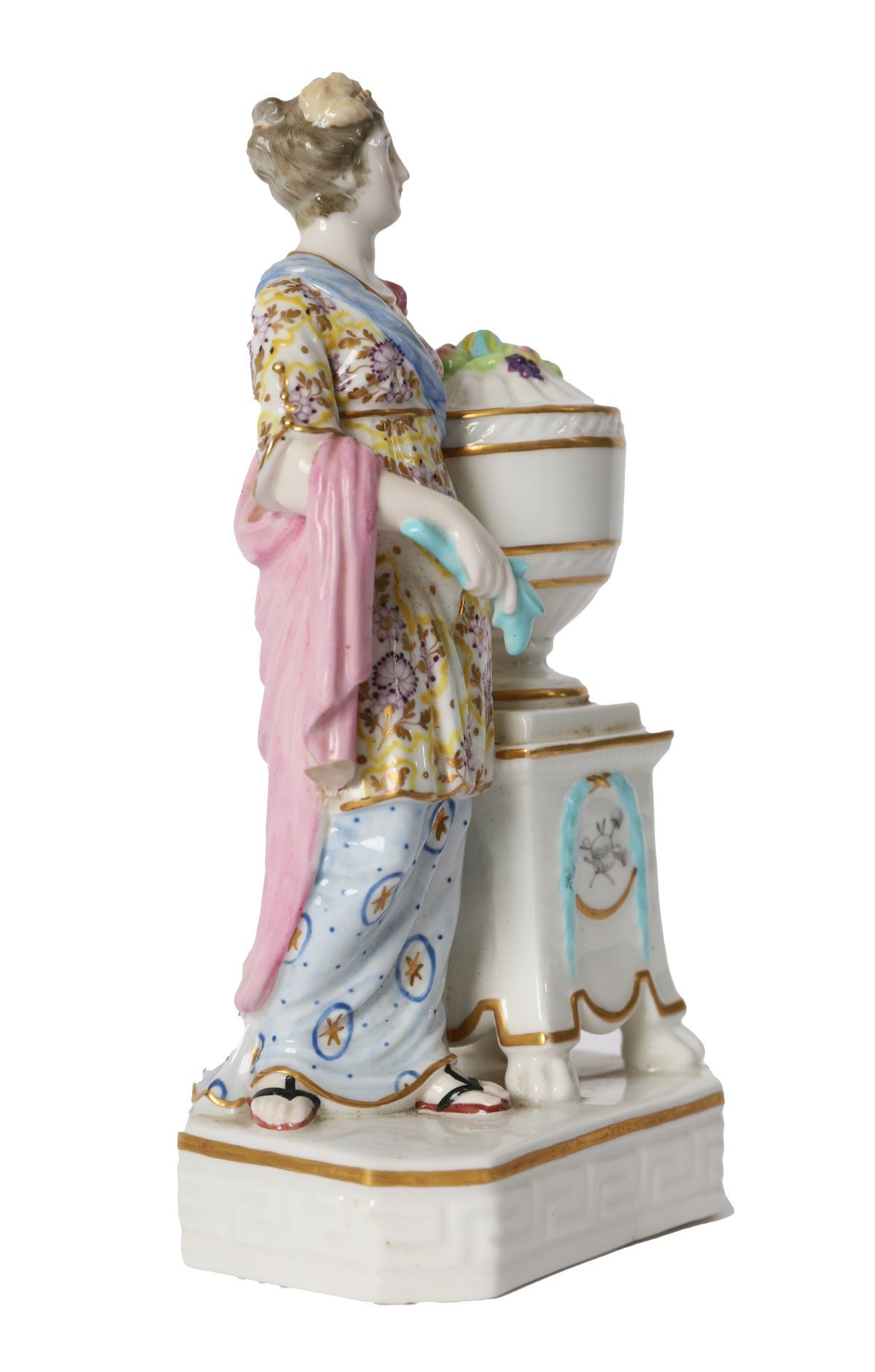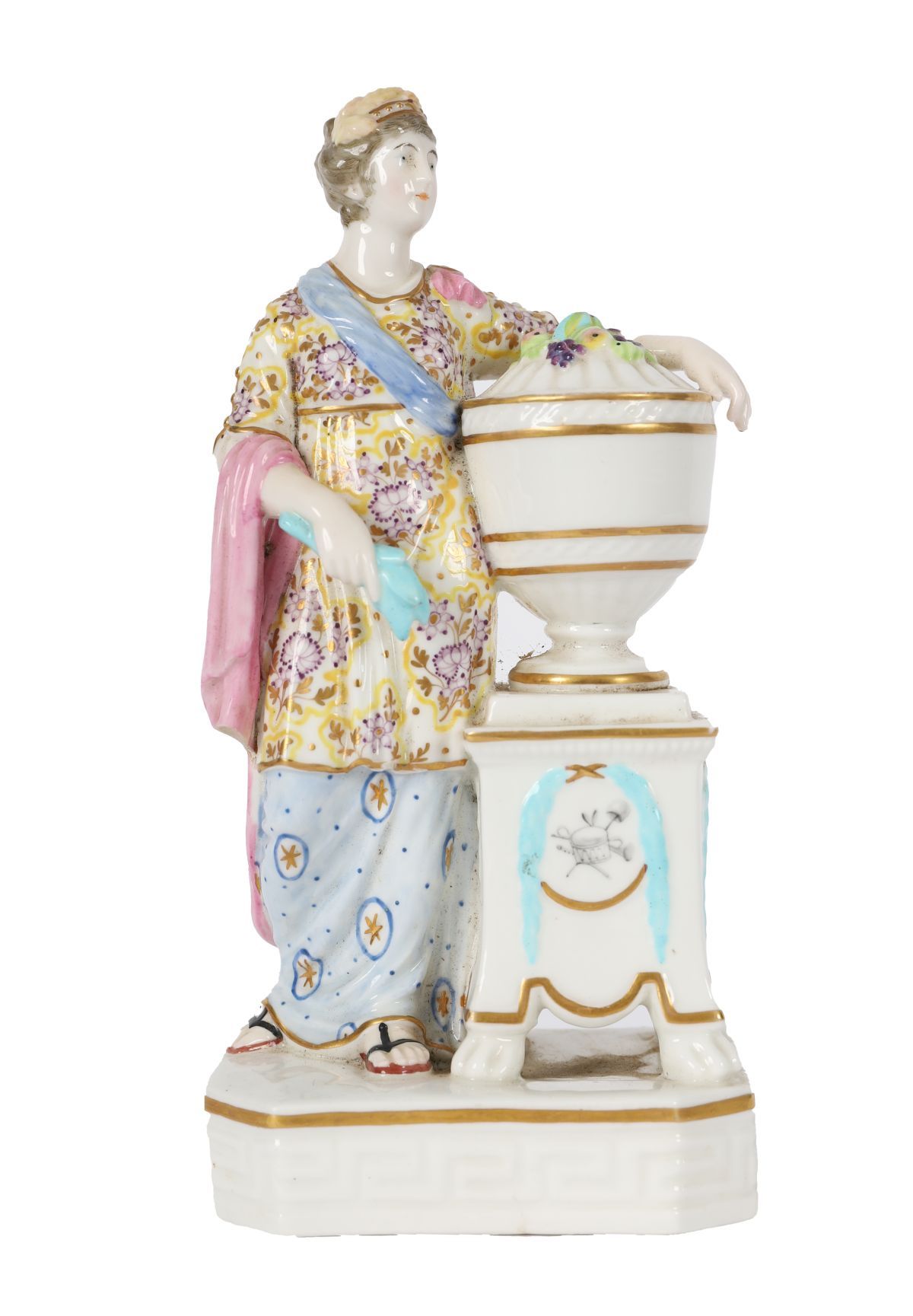A charming 19th-century Derby porcelain figure of a lady standing beside a classical urn, her floral gown and pastel drapery highlighted in gilt. The pedestal base adorned with turquoise and gold detailing.