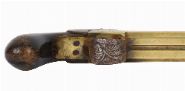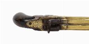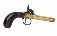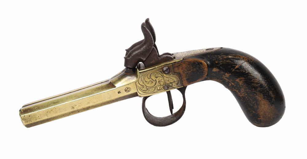 Compact brass-framed double-barrel percussion pistol with engraved decoration and wooden grip.