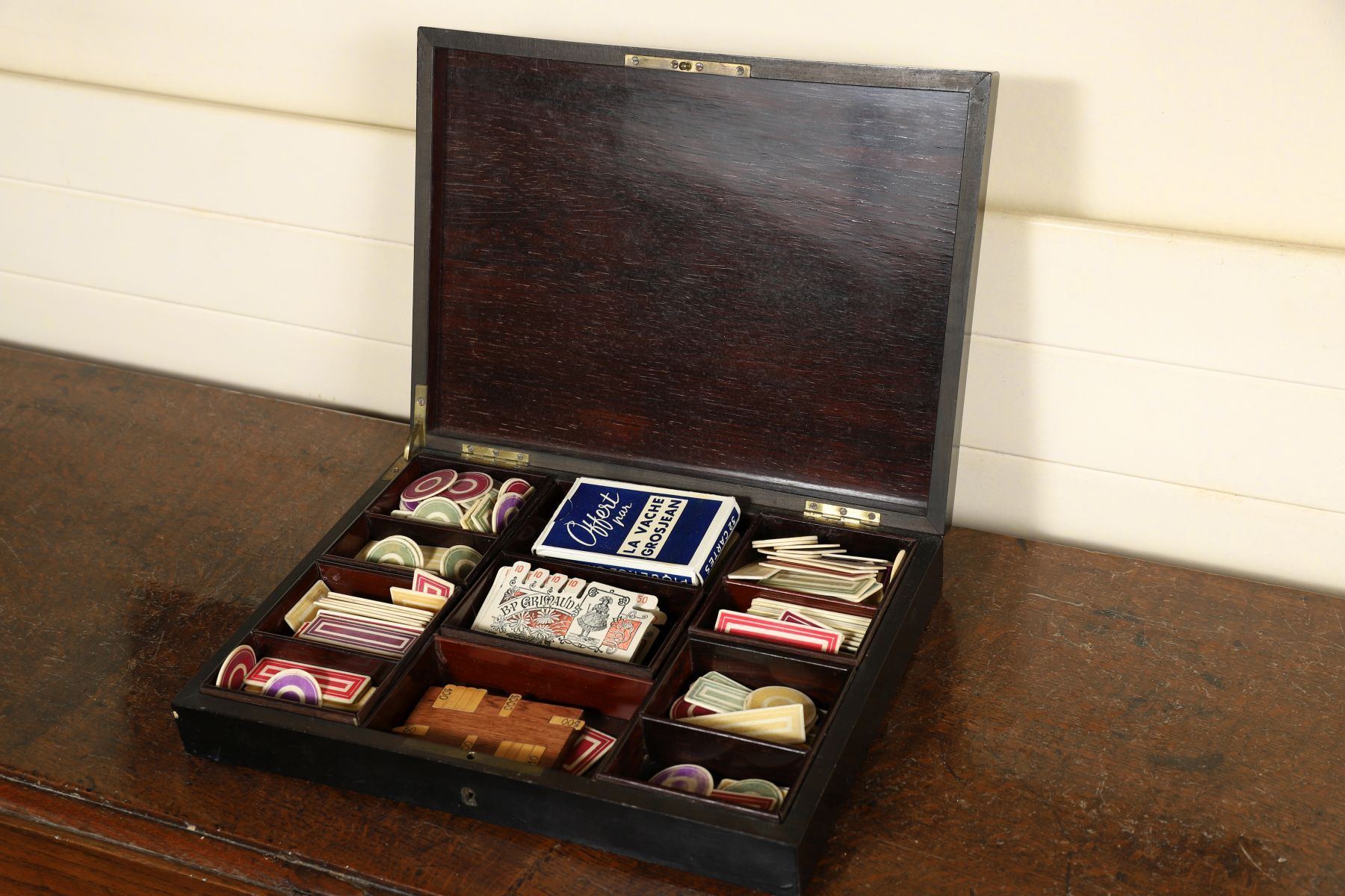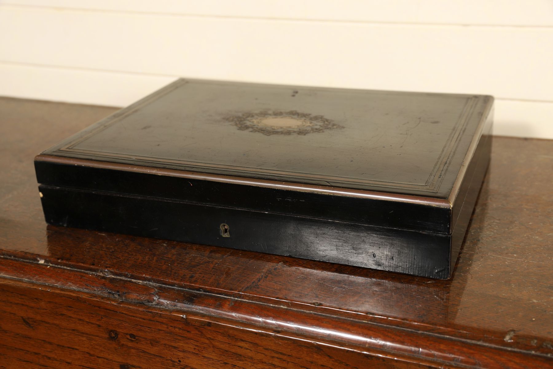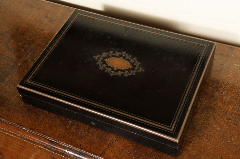 A 19th-century rectangular games box veneered in ebony, the hinged lid decorated with brass line inlay and a central oval reserve. The interior fitted for games.
