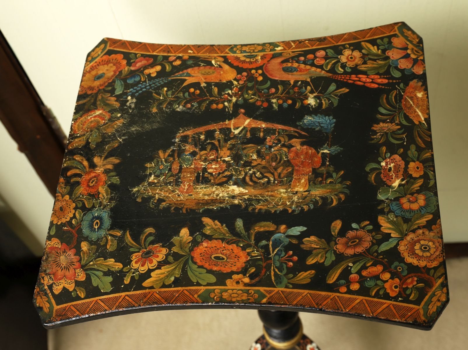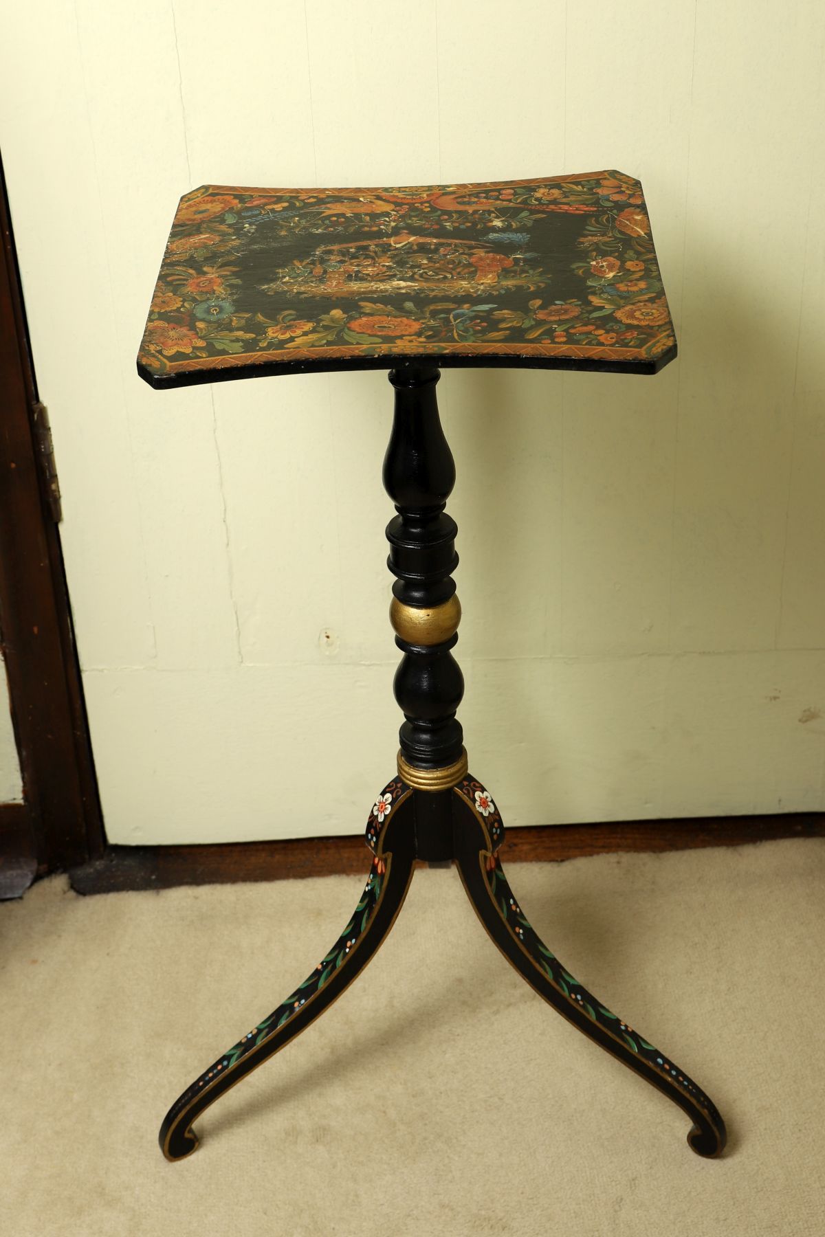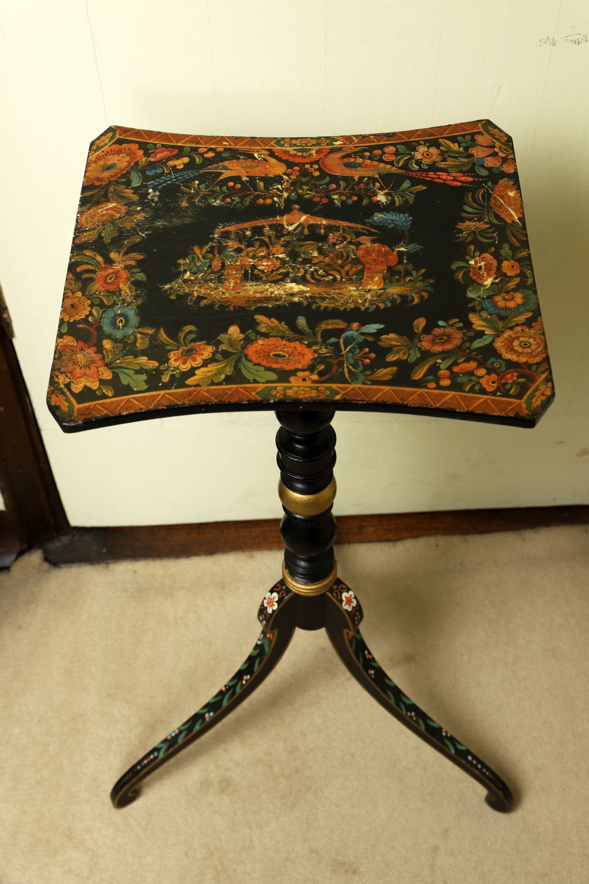 The circular top decorated with floral motifs, supported on a turned column and three curved legs with painted detailing.