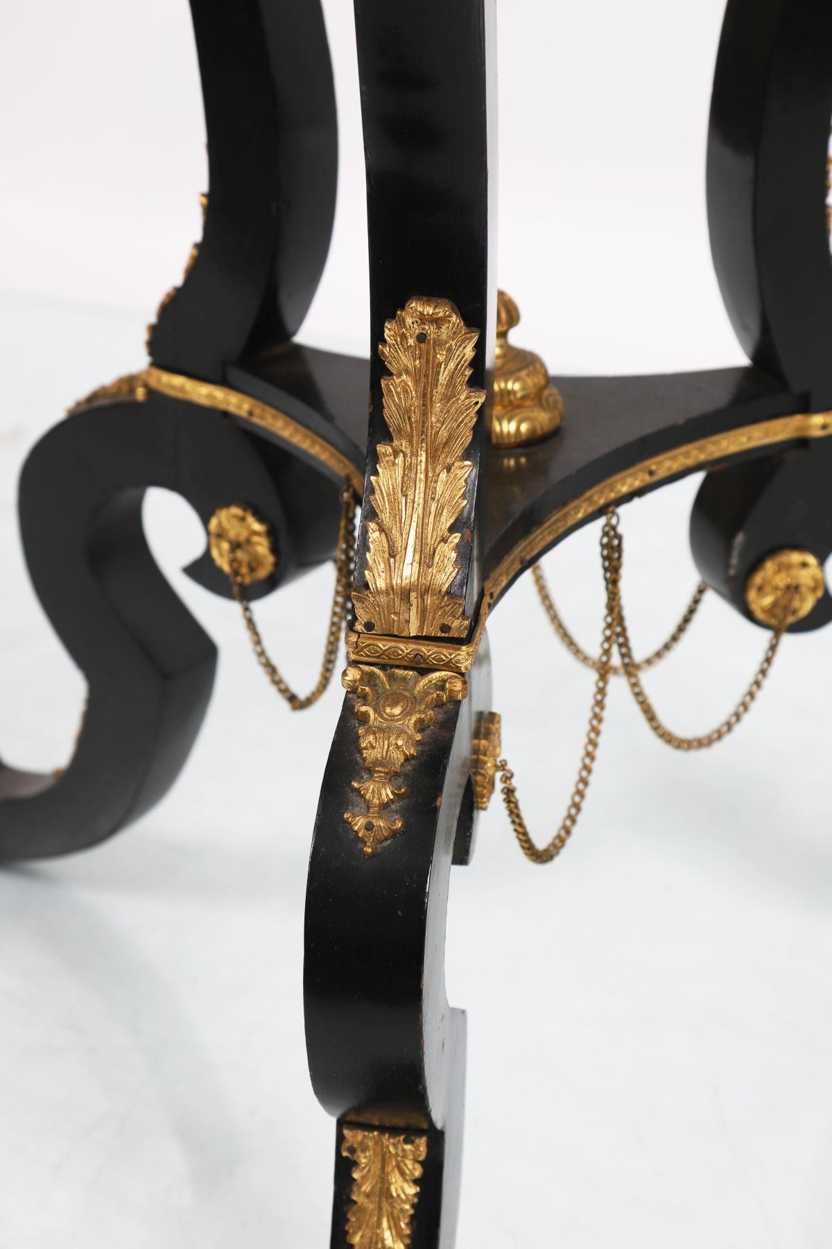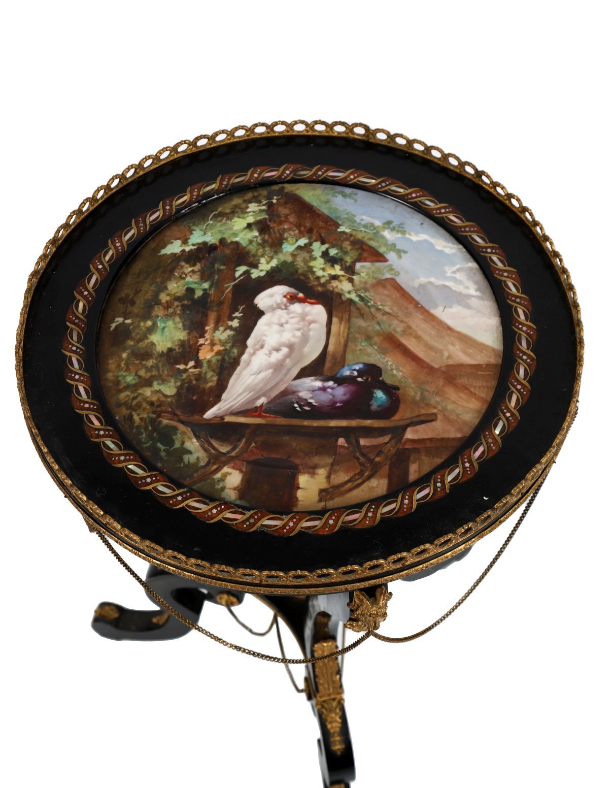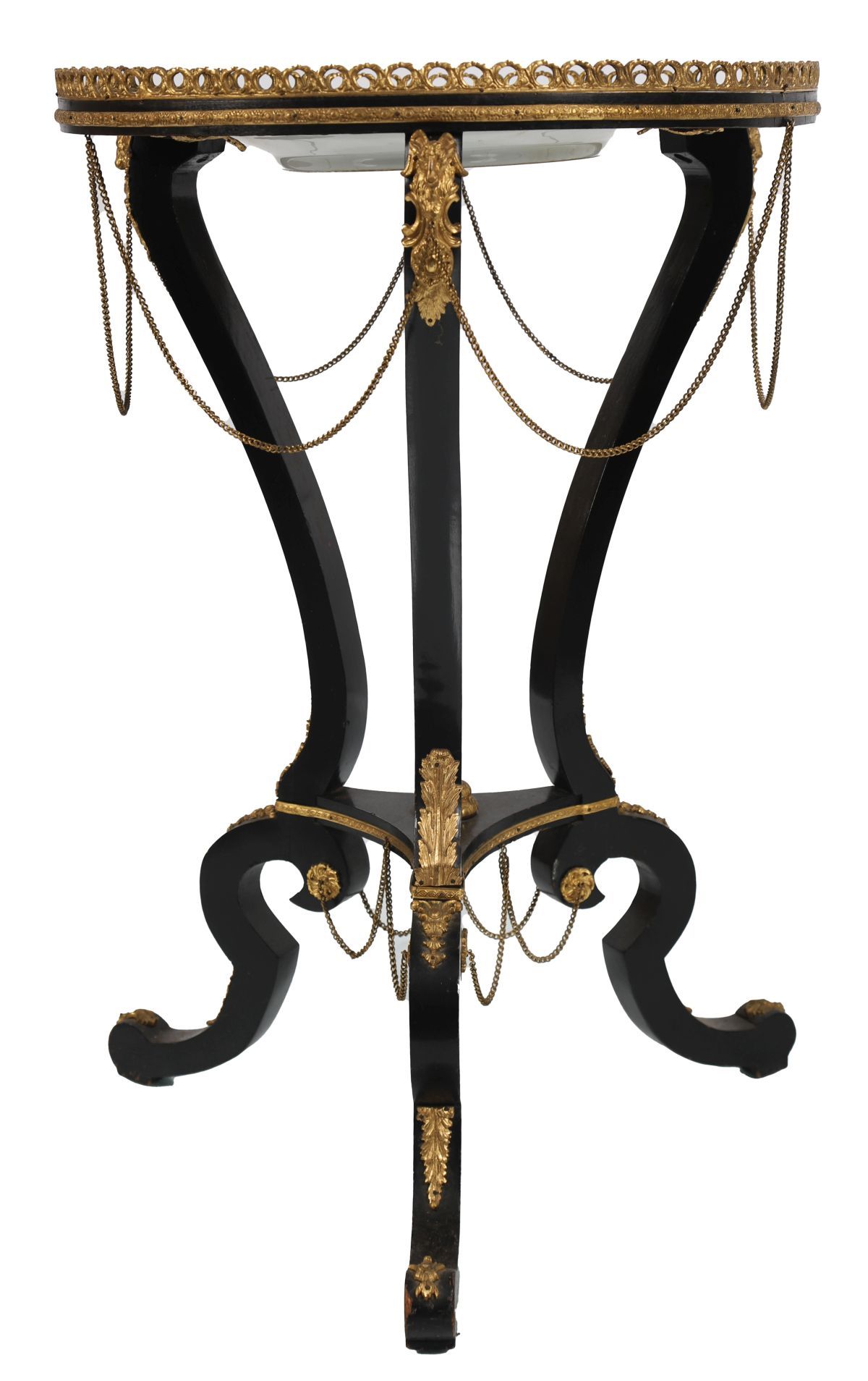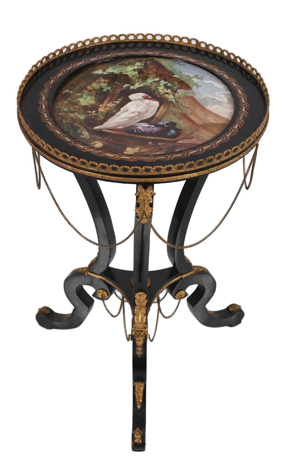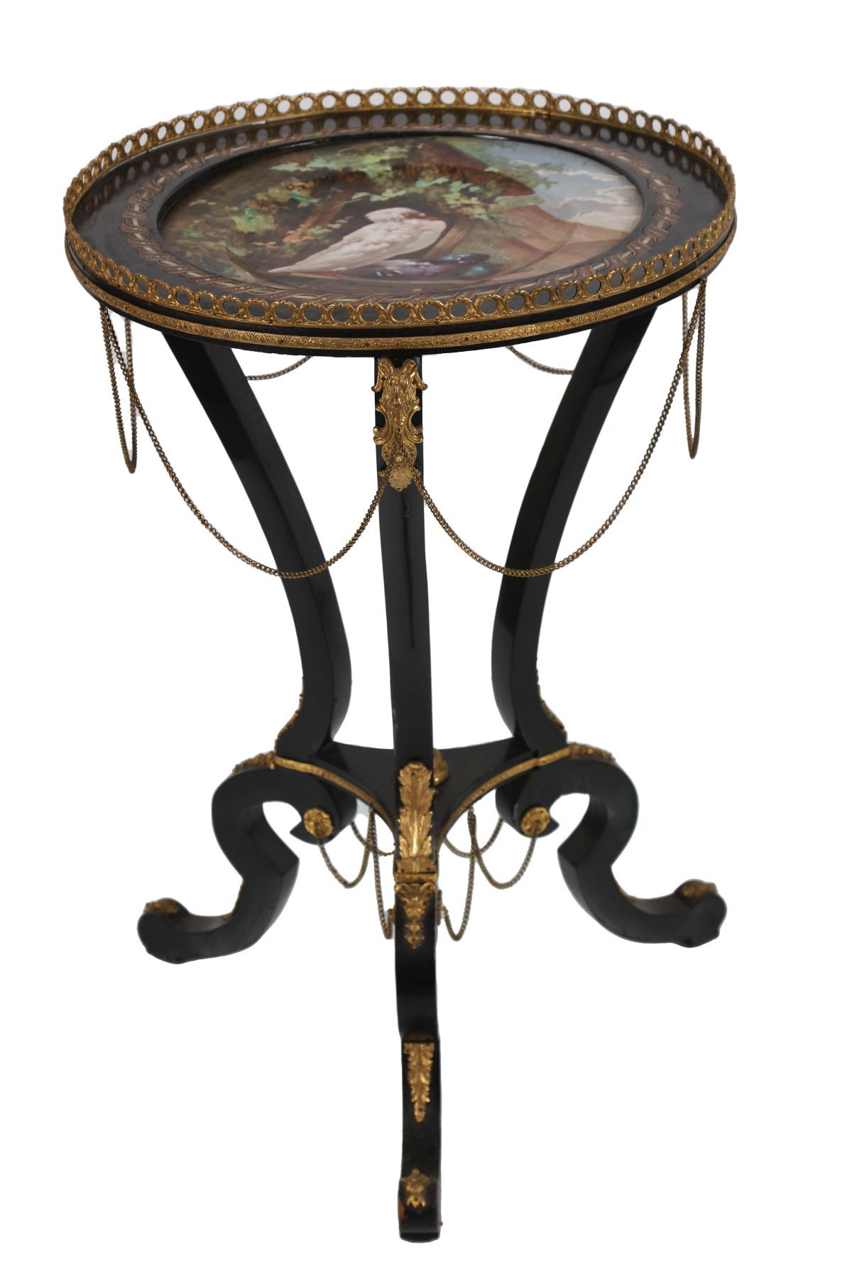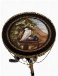 19th-century ebony table, the circular top centred with a porcelain panel, within an ormolu-mounted surround, raised on curved supports united by a stretcher and terminating in ormolu-mounted feet.