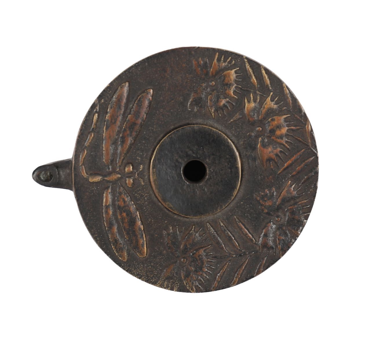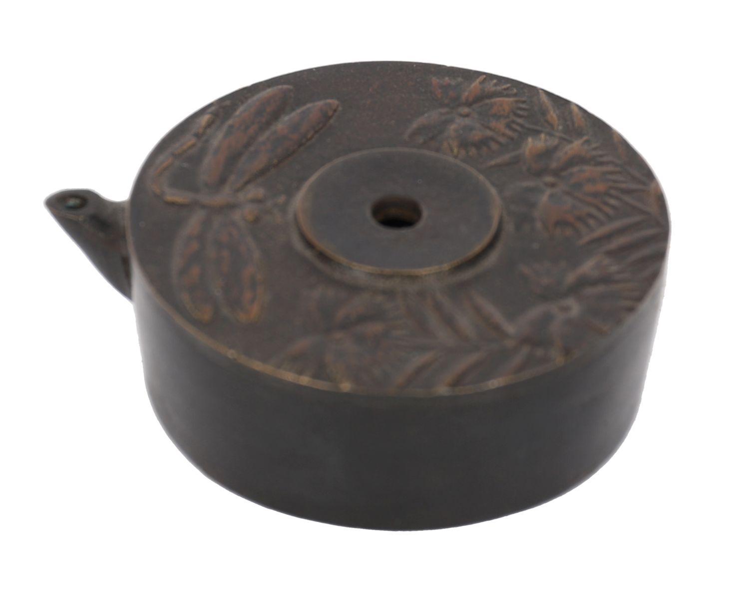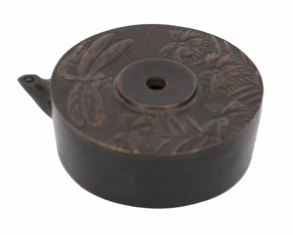 A 19th century Edo period bronze water-dropper of circular form, cast and applied with a dragonfly motif, with naturalistic detailing.